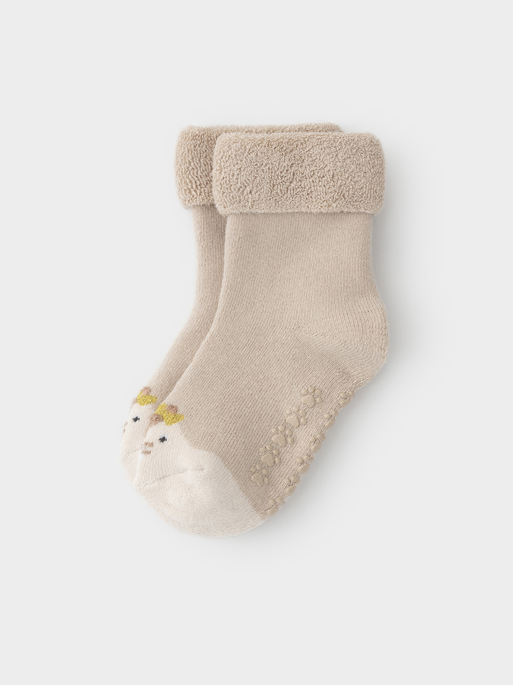 Носки махровые с формованной пяткой и отворотом по краю. На подошве резиновые стопперы. Украшены рисунком. Изделие сохраняет форму и стойкий цвет после многочисленных стирок.