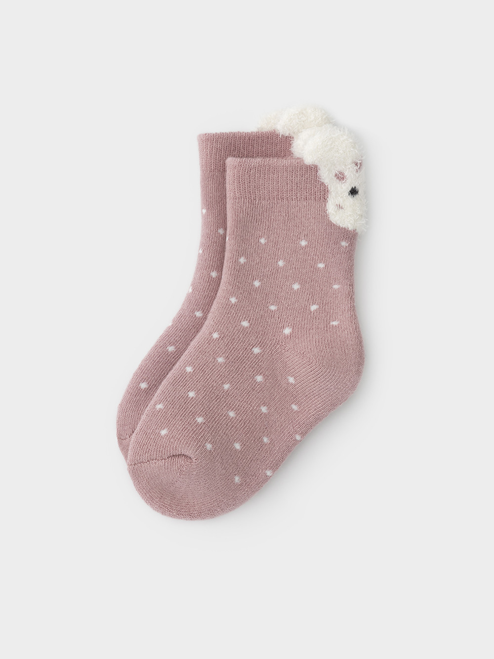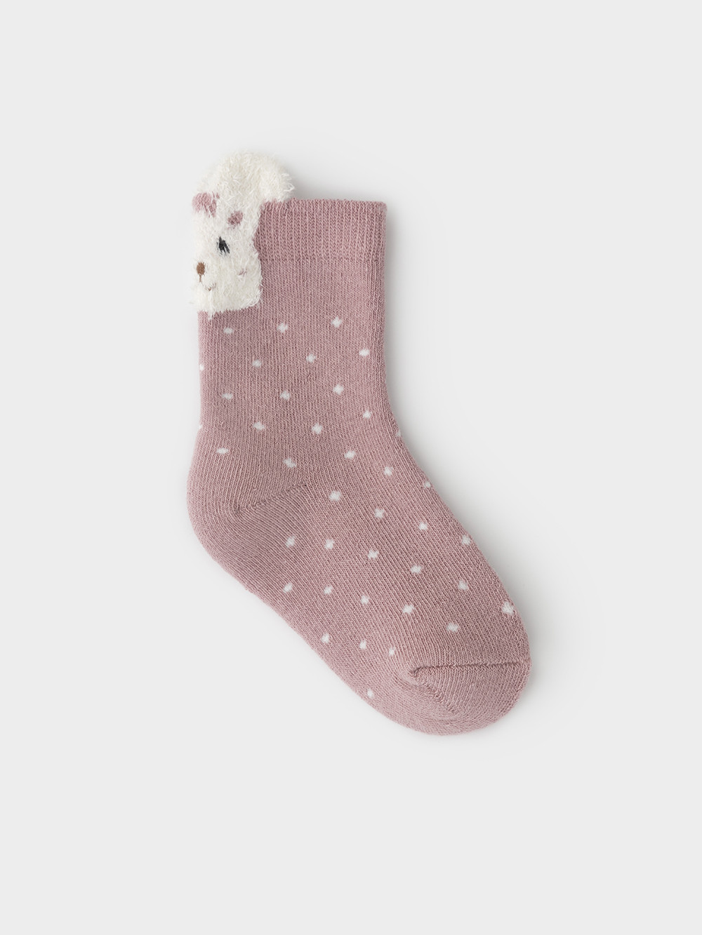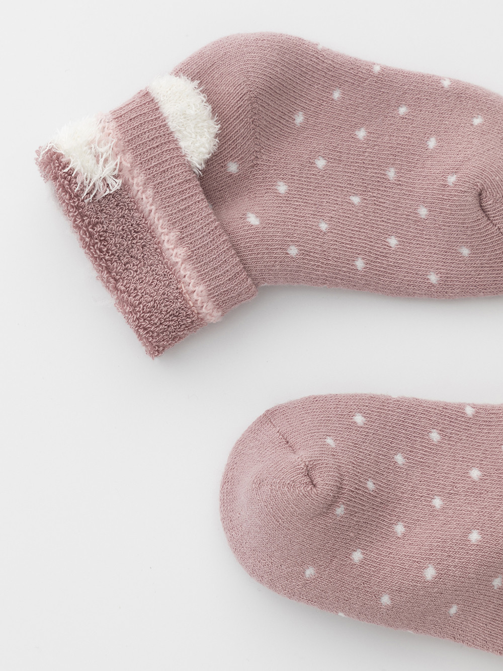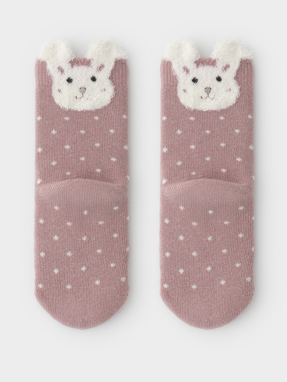 Носки махровые с формованной пяткой и эластичной резинкой по краю. Украшены рисунком и объёмными элементами. Изделие сохраняет форму и стойкий цвет после многочисленных стирок.
