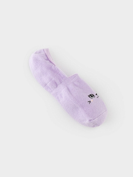 Короткие носки-следки для девочки. Эластичная резинка по краю. Украшены рисунком с мордочкой.