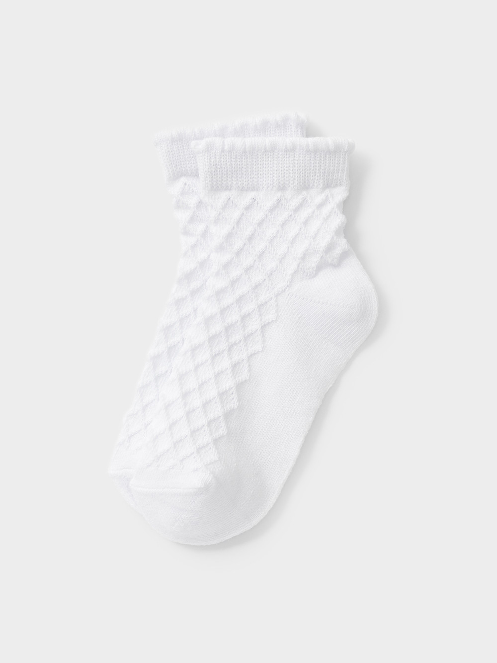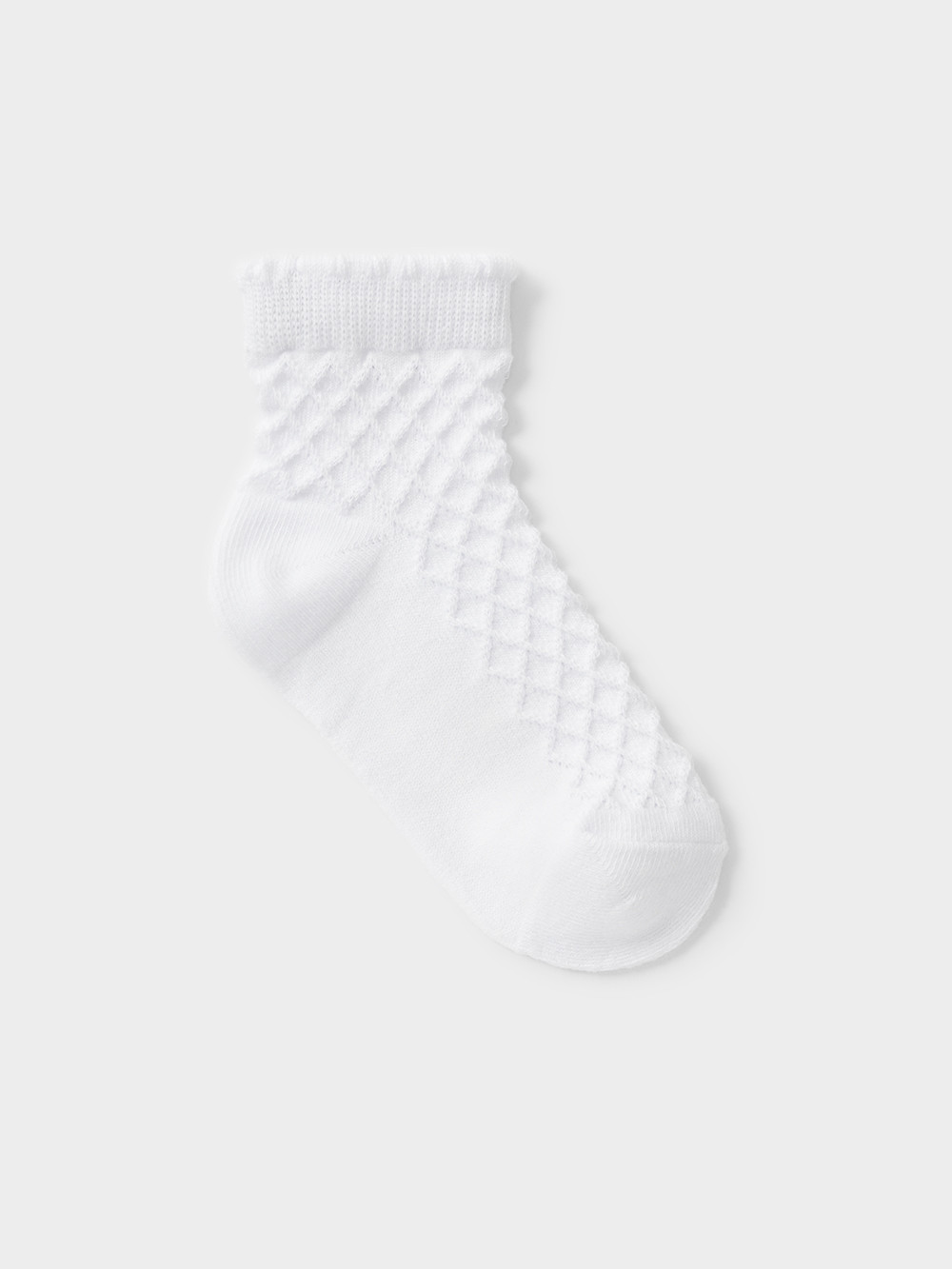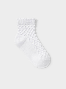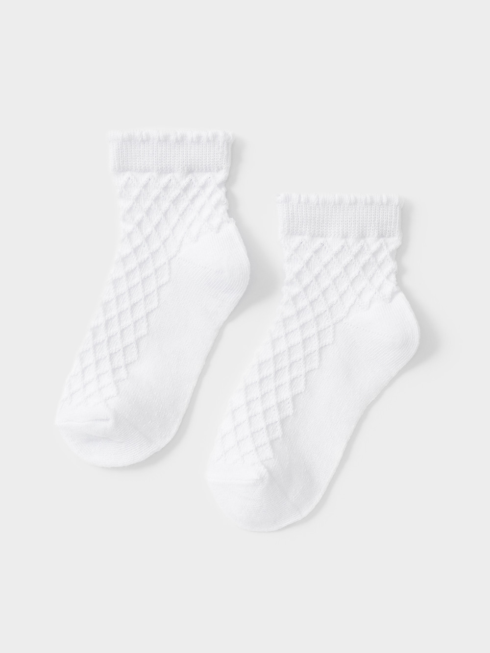 Носки короткие для девочки с формованной пяткой и эластичной резинкой по краю. Связаны ажурным узором.