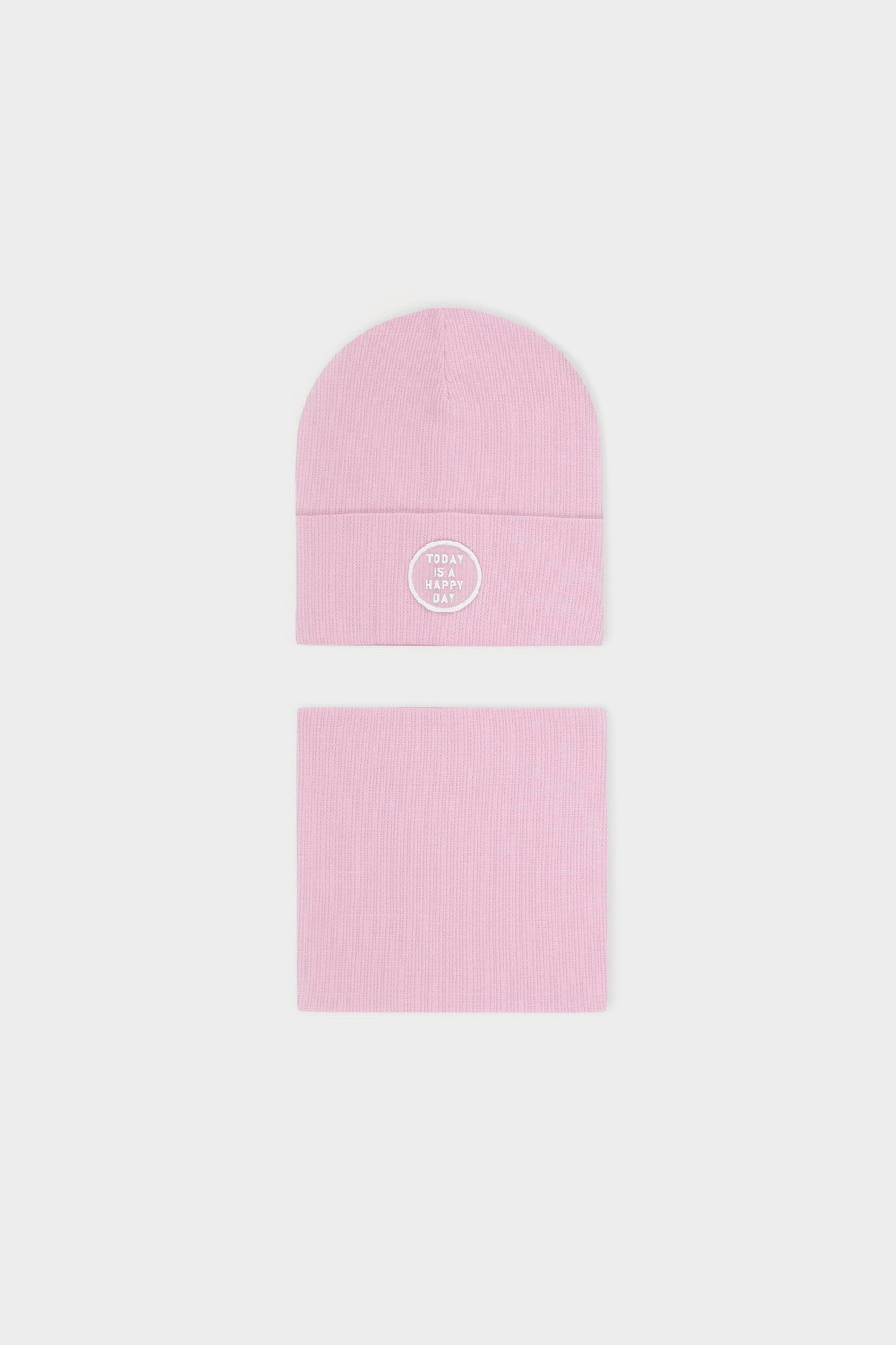 Комплект для девочки: шапка и снуд из хлопкового трикотажа в рубчик с добавлением эластана, окрашенного стойкими гипоаллергенными текстильными красителями. Изделия хорошо тянутся, после многократных стирок сохраняют цвет и форму.