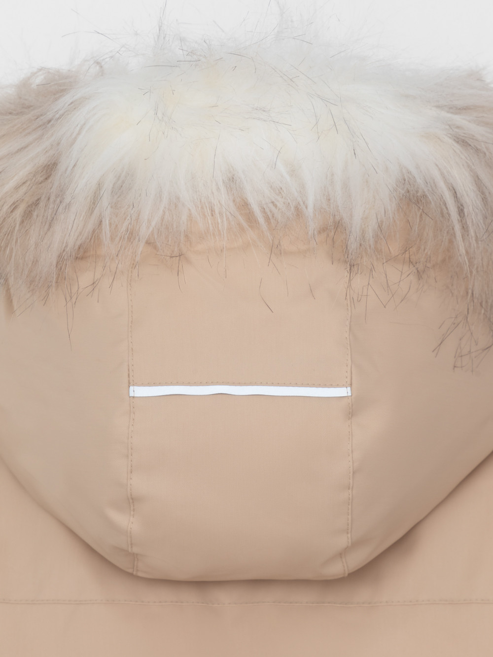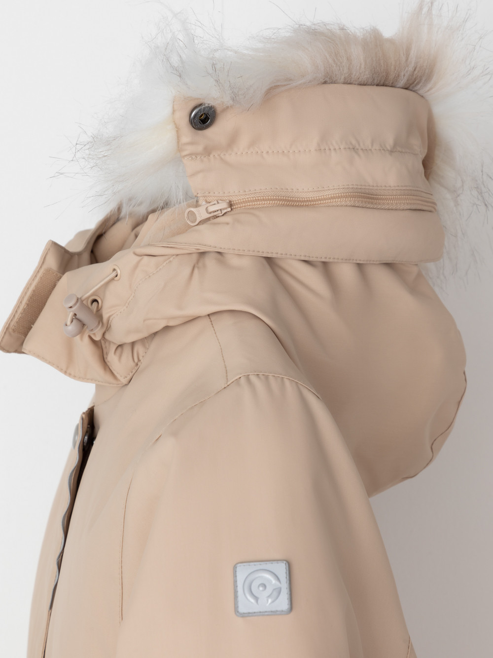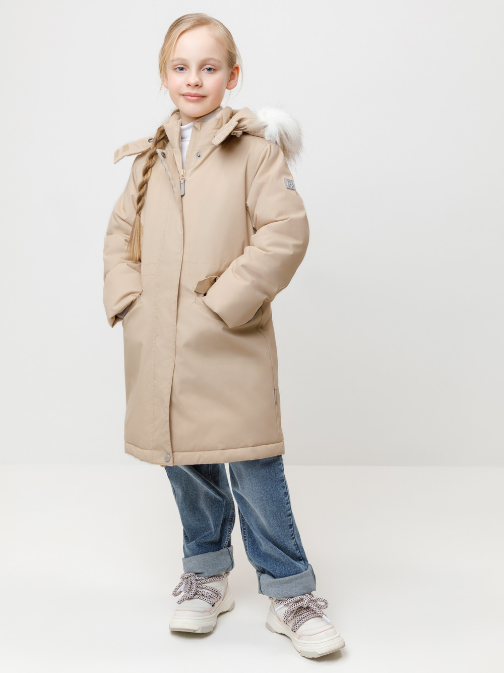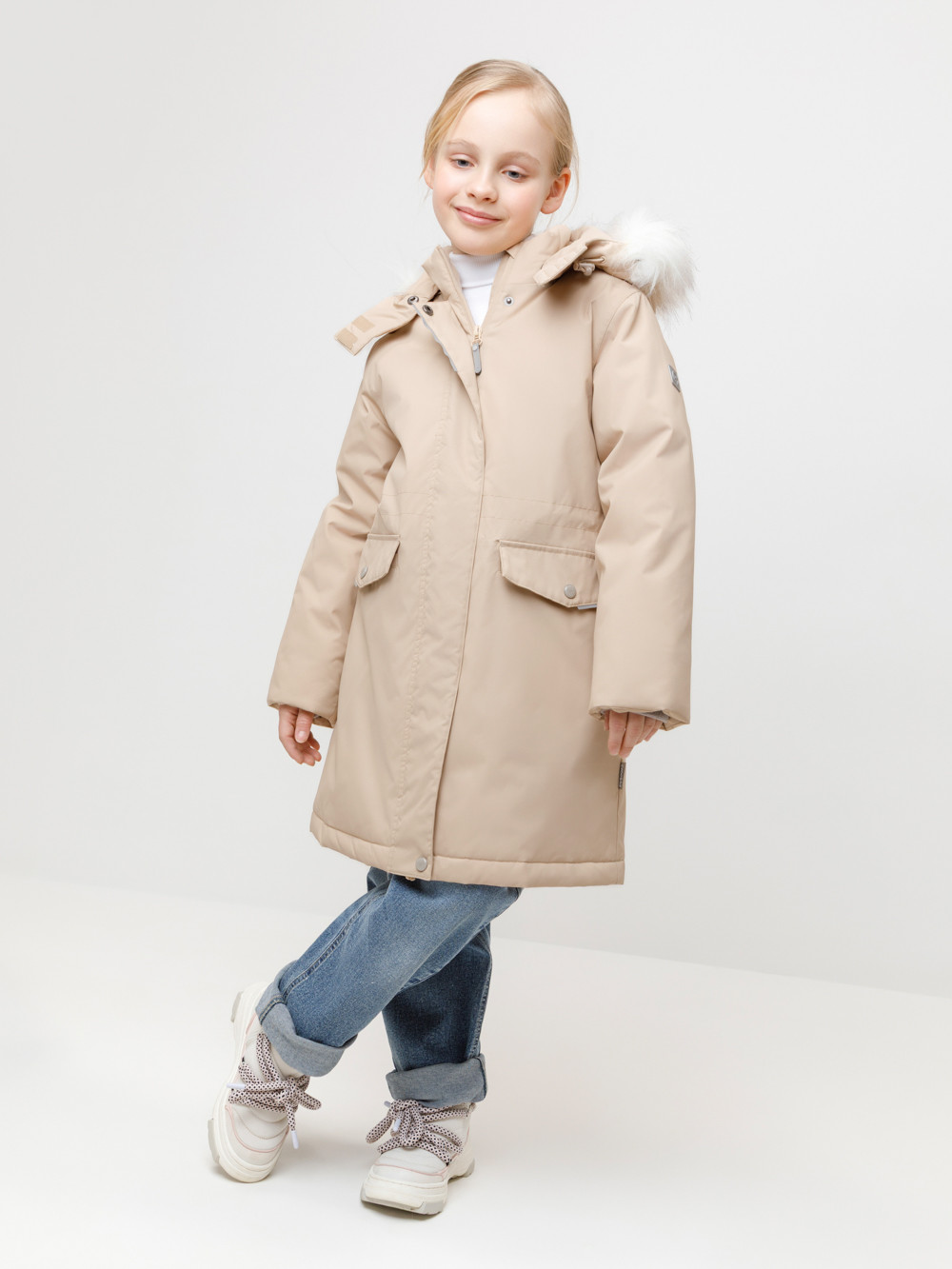 Зимнее пальто для девочки с утеплителем SEE®: 250 г/м2. Выполнено из мембранной ткани с дополнительной тефлоновой обработкой, которая предохраняет изделие от загрязнений и отталкивает влагу. Подклад выполнен из 100% полиэстера Tricot. Пальто застёгивается на молнию, предусмотрена защита подбородка. Съёмный капюшон на кнопках и липучках имеет отстёгивающийся искусственный мех. На рукавах мягкие манжеты. По бокам два кармана с клапанами, внутри карман на молнии. По талии эластичная утяжка со стопперами для регулировки ширины пальто. Во всех изделиях верхнего ассортимента для безопасности ребёнка предусмотрены светоотражающие элементы.