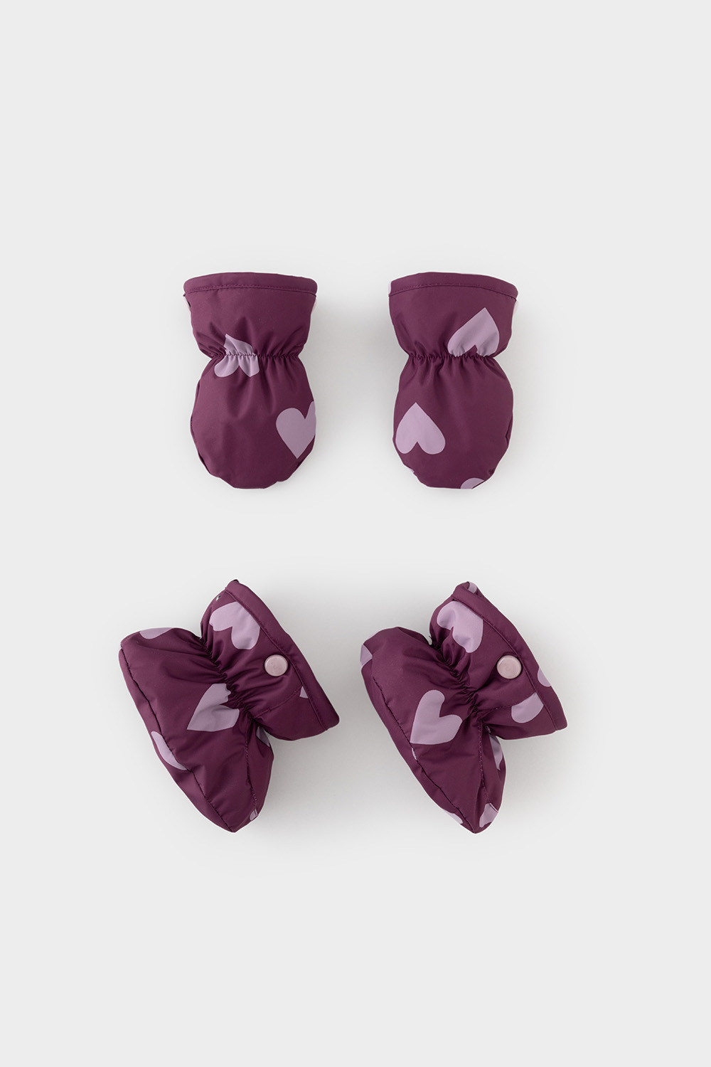 • Дополнительно в размерах 68-74, 74-80, 80-86  пристегивающиеся утепленные варежки и пинетки.