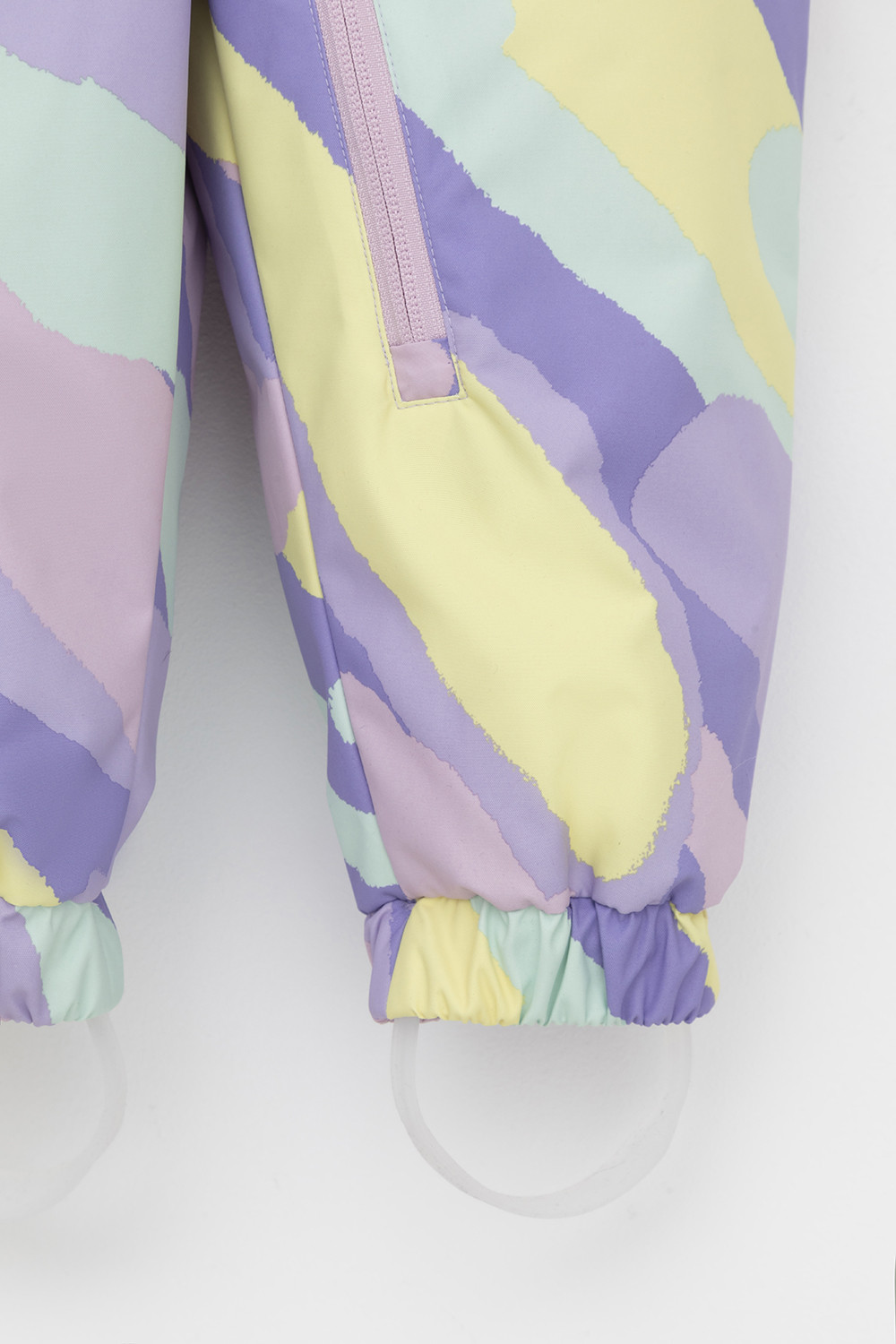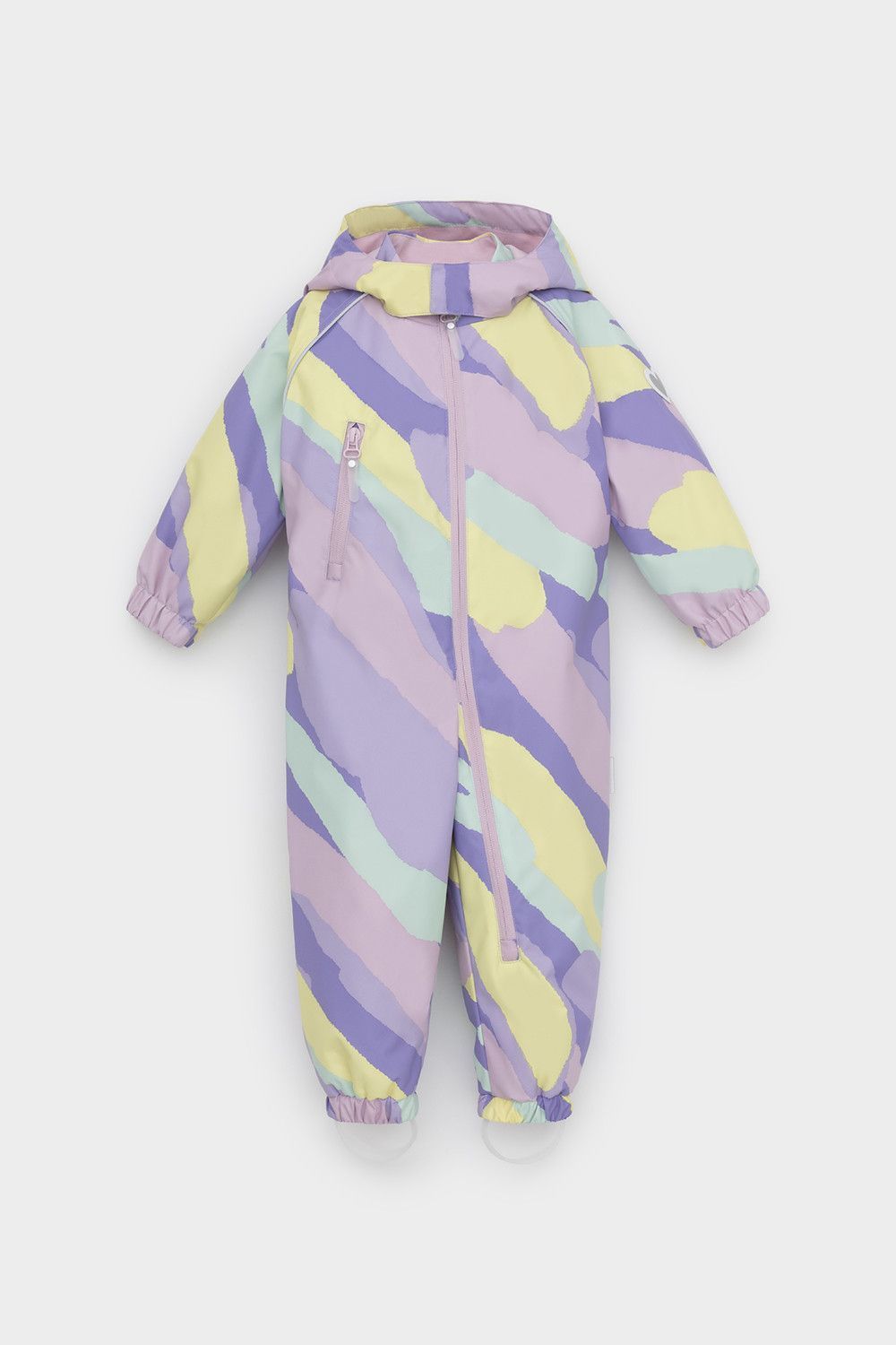 Ветровочный комбинезон ясельный из мембранной ткани с дополнительной тефлоновой обработкой. Данный вид обработки предохраняет изделие от загрязнения и лучше отводит влагу. Подклад из 100% хлопка. У изделия удлиненная молния для легкого одевания с защитой подбородка. Утяжка на капюшоне с потайными стопперами. По низу рукавов и брючин, а также на спинке изделия эластичная резинка для лучшего прилегания. Для фиксации комбинезона используются съемные силиконовые штрипки. В размерах 68-80 функциональные отвороты на рукавах и брючинах. Во всех изделиях верхнего ассортимента для безопасности ребенка предусмотрены светоотражающие элементы.