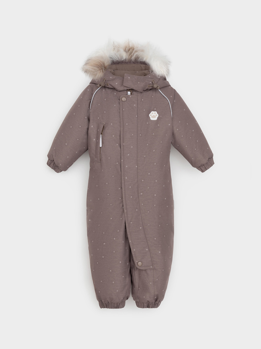 Зимний комбинезон ясельный с натуральным утеплителем из гусиного пуха (70%) и пера (30%). Выполнен из мембранной ткани с дополнительной тефлоновой обработкой, которая предохраняет изделие от загрязнений и отталкивает влагу. Подклад выполнен из 100% хлопка. Комбинезон застёгивается на молнию и внешнюю планку на липучках, предусмотрена защита подбородка. Несъёмный капюшон имеет эластичную утяжку со стопперами и отстёгивающийся мех на молнии. Резинка по спинке для лучшего прилегания. На груди карман на молнии. По рукавам и низу изделия эластичные манжеты, на ножках отстёгивающиеся силиконовые штрипки. В размерах с 68-74 по 80-86 в комплекте идут рукавицы и пинетки. Во всех изделиях верхнего ассортимента для безопасности ребёнка предусмотрены светоотражающие элементы.