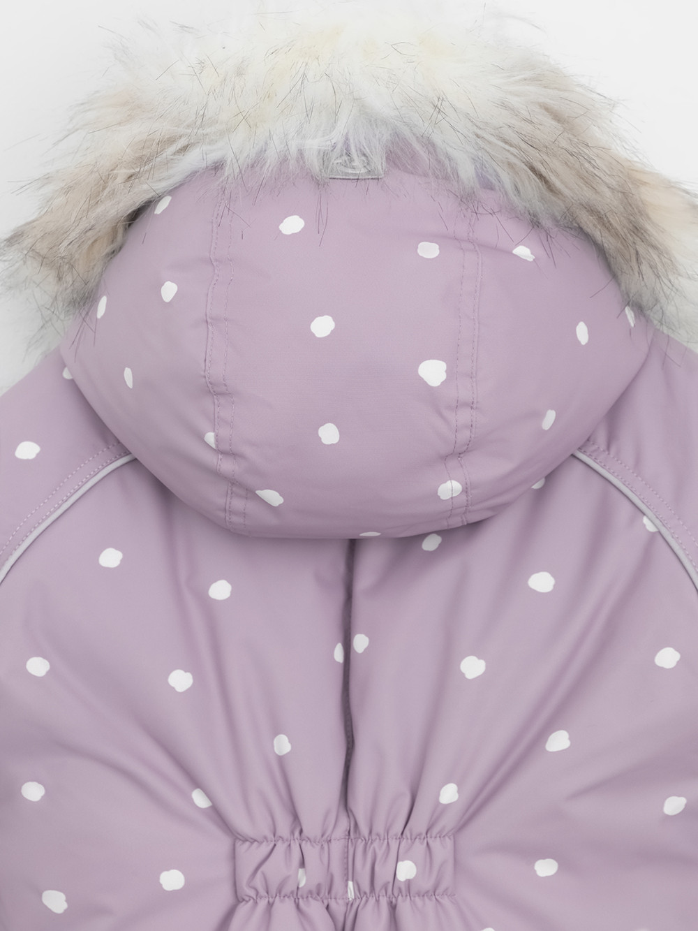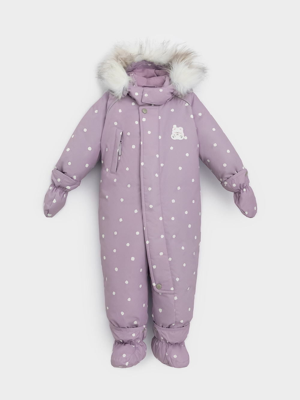 Зимний комбинезон ясельный с натуральным утеплителем из гусиного пуха (70%) и пера (30%). Выполнен из мембранной ткани с дополнительной тефлоновой обработкой, которая предохраняет изделие от загрязнений и отталкивает влагу. Подклад выполнен из 100% хлопка. Комбинезон застёгивается на молнию и внешнюю планку на липучках, предусмотрена защита подбородка. Несъёмный капюшон имеет эластичную утяжку со стопперами и отстёгивающийся мех на молнии. Резинка по спинке для лучшего прилегания. На груди карман на молнии. По рукавам и низу изделия эластичные манжеты, на ножках отстёгивающиеся силиконовые штрипки. В размерах с 68-74 по 80-86 в комплекте идут рукавицы и пинетки. Во всех изделиях верхнего ассортимента для безопасности ребёнка предусмотрены светоотражающие элементы.