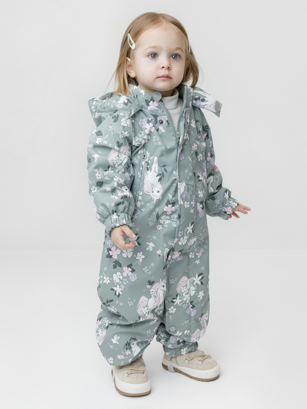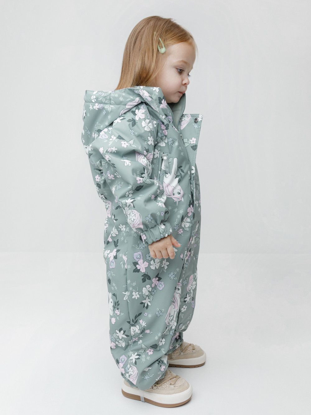 Демисезонный комбинезон ясельный с утеплителем Fellex®, 120 г/м2. Выполнен из мембранной ткани с дополнительной тефлоновой обработкой. Данный вид обработки предохраняет изделие от загрязнения и лучше отводит влагу. Подклад из 100% хлопка. Для удобного одевания комбинезон застёгивается на удлинённую молнию с защитой подбородка. Ветрозащитная планка фиксируется на липучках и кнопках. Утяжка на капюшоне с потайным стоппером. По низу рукавов и брючин, а также на спинке изделия предусмотрены эластичные резинки для лучшего прилегания. Для фиксации комбинезона используются съёмные силиконовые штрипки. В размере 74-80 есть функциональные отвороты на рукавах и брючинах. Во всех изделиях верхнего ассортимента для безопасности ребёнка предусмотрены светоотражающие элементы.