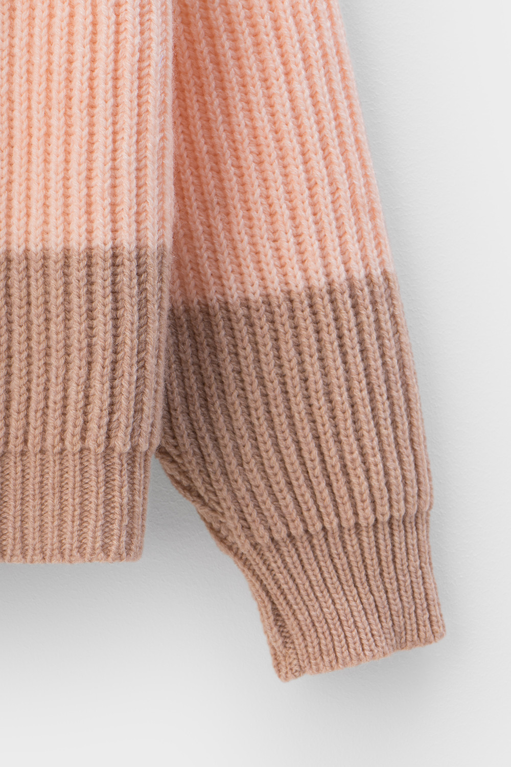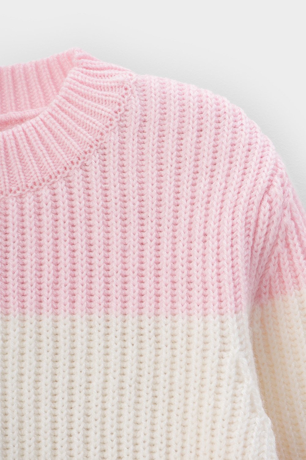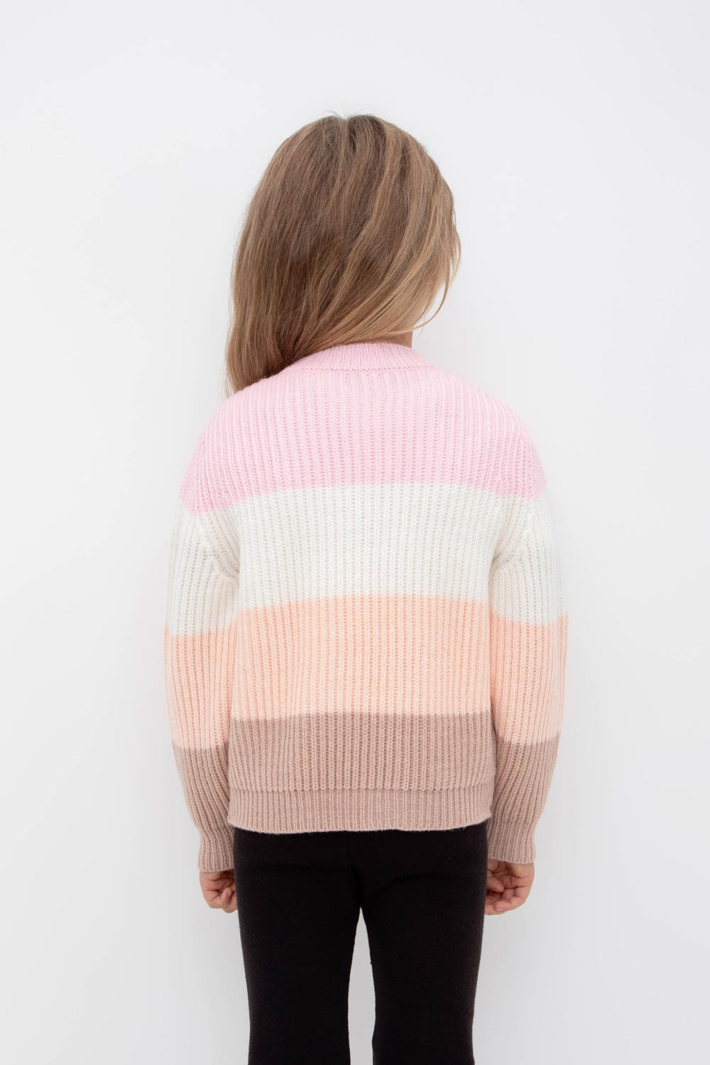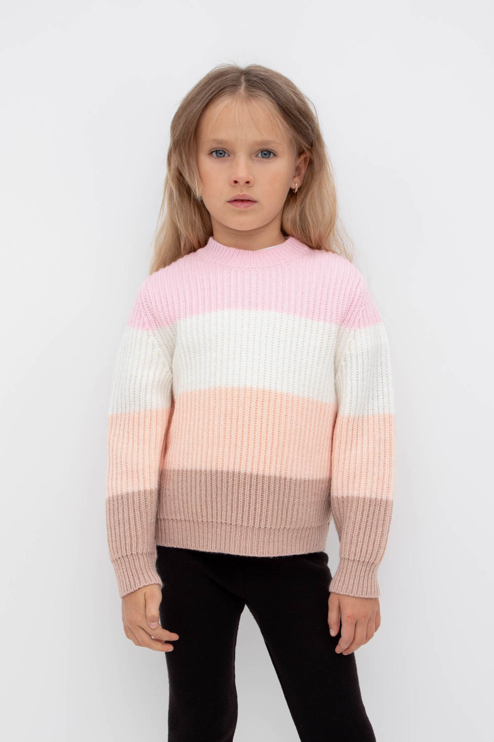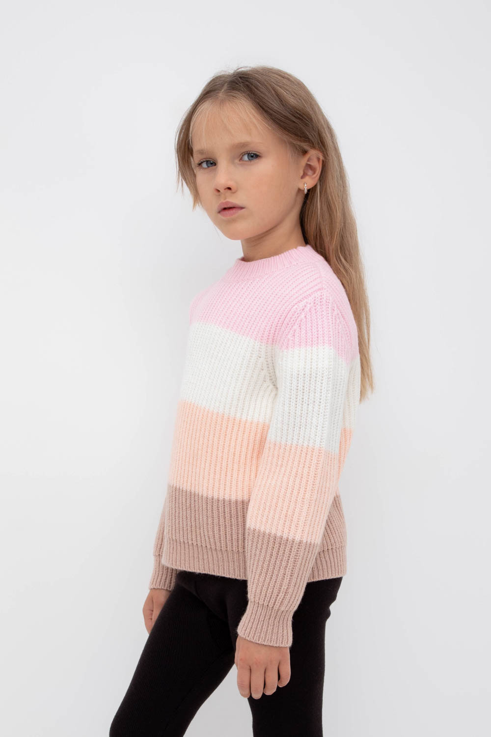 Вязаный джемпер для девочки из мягкой полушерстяной пряжи. Длинные рукава с манжетами. Внизу эластичный пояс. Для удобства изделие застёгивается на пуговицы на плече в размерах 92-104. Изделие сохраняет форму и стойкий цвет после многочисленных стирок.