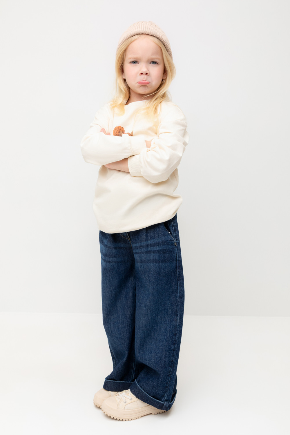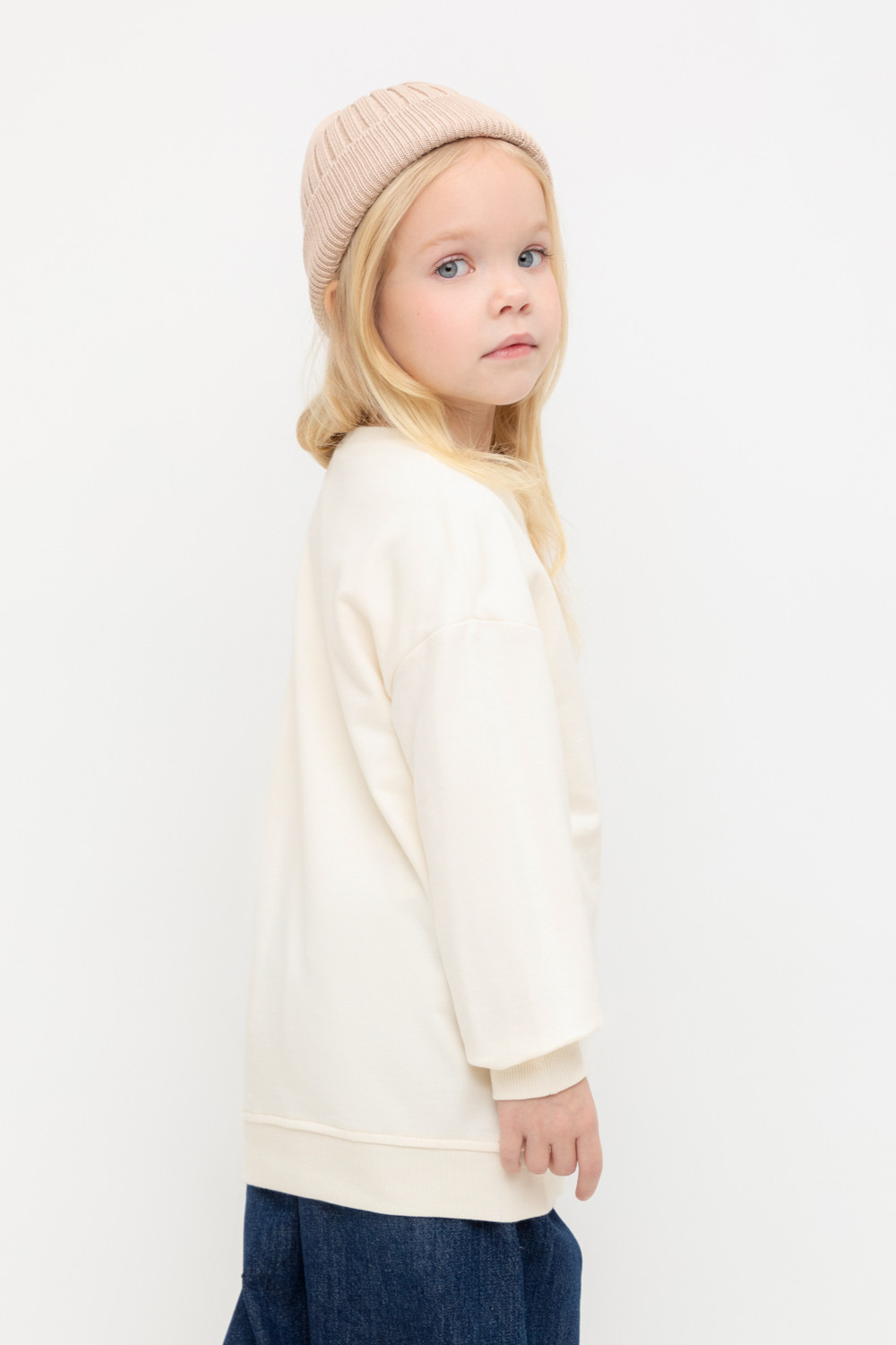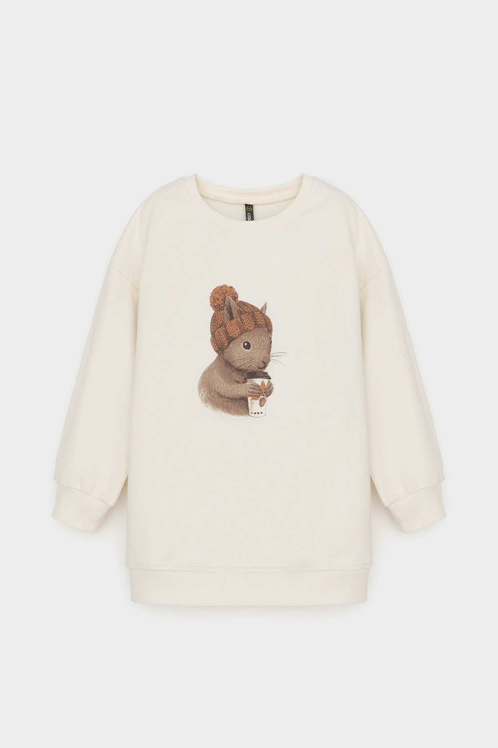 Удлинённый джемпер из петельчатого футера. Спущенные плечи и сборки по низу на рукавах придают свободный объём. Оригинальный принт выполнен из стойких текстильных гипоаллергенных красителей.