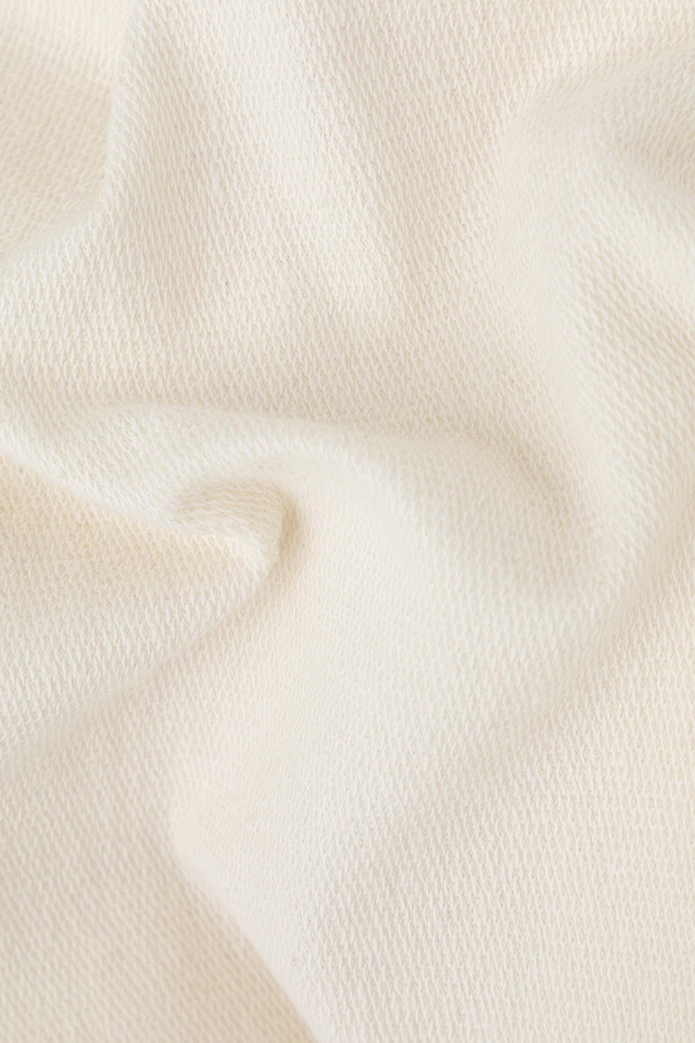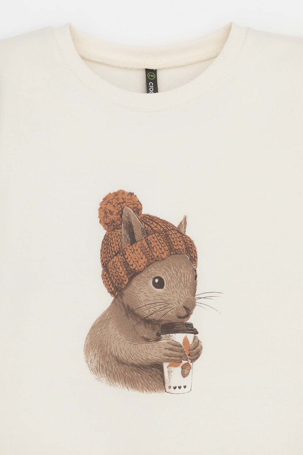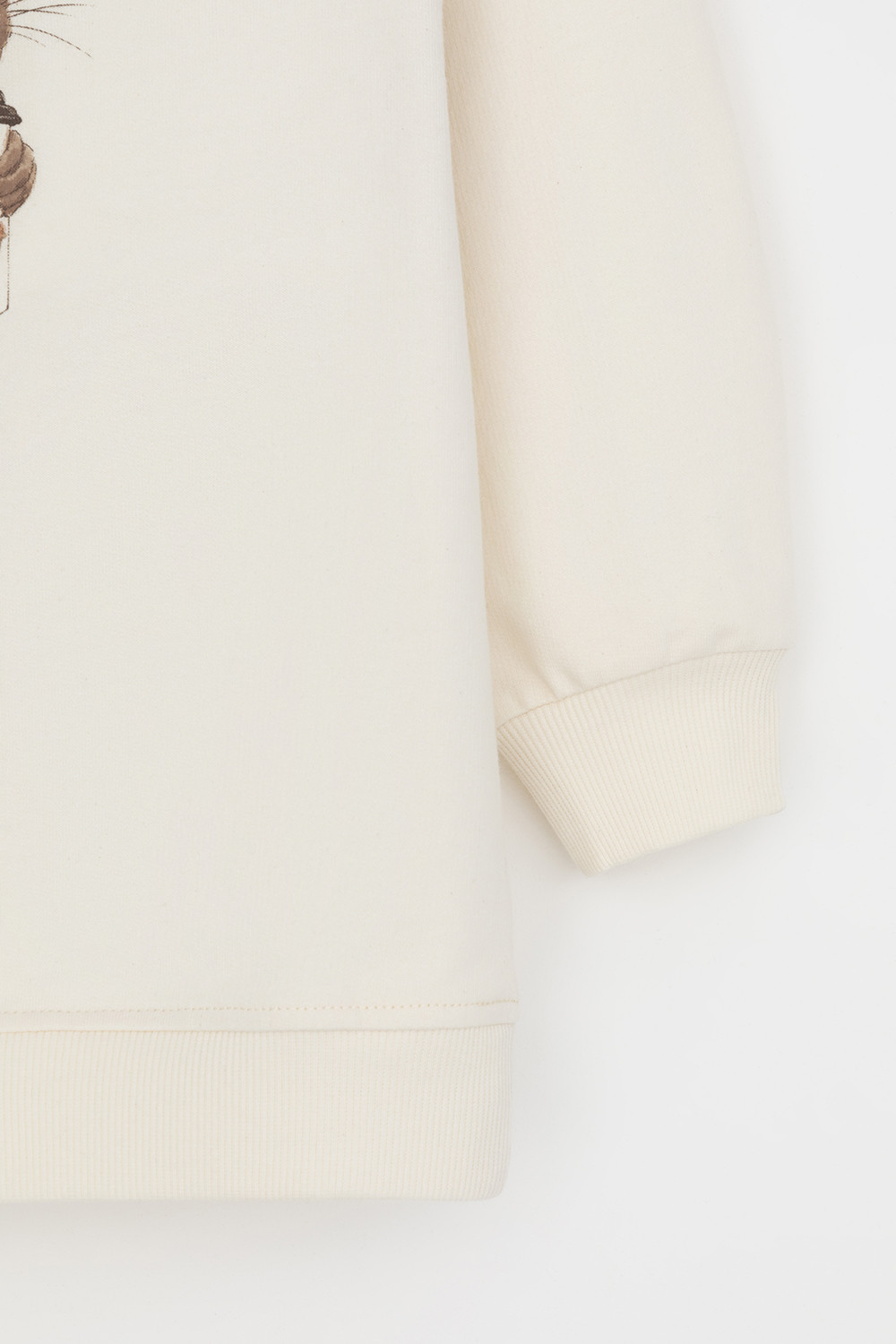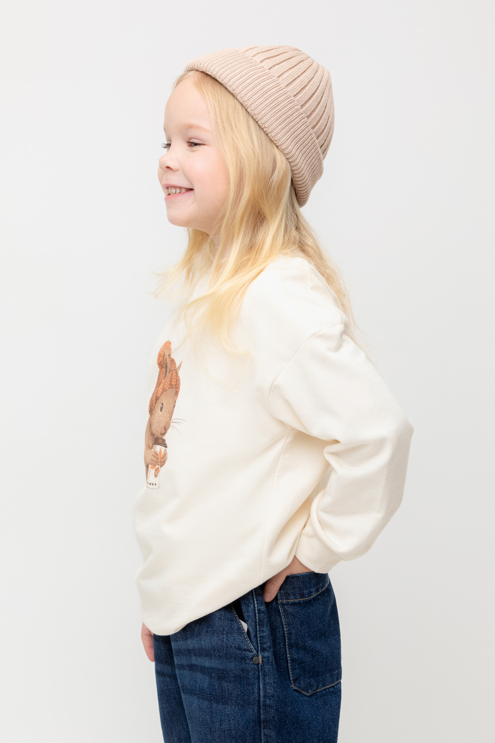 Удлинённый джемпер из петельчатого футера. Спущенные плечи и сборки по низу на рукавах придают свободный объём. Оригинальный принт выполнен из стойких текстильных гипоаллергенных красителей.