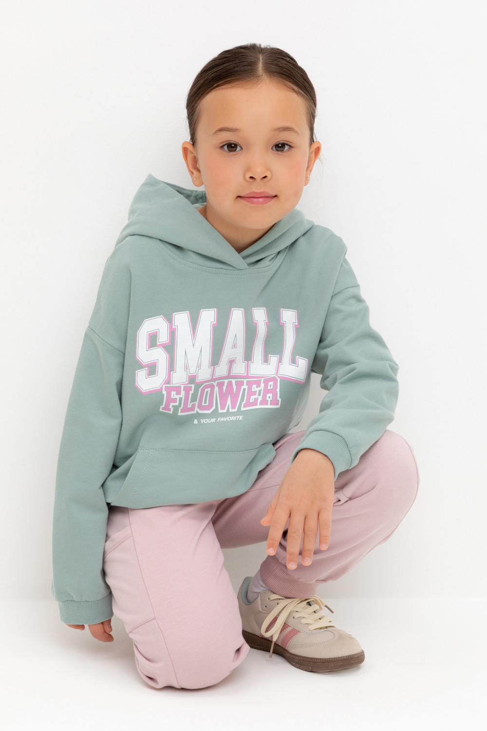 Толстовка с капюшоном для девочки из мягкого петельчатого футера. На рукавах и по низу изделия эластичные манжеты и пояс. Спереди удобный карман-кенгуру. Принт выполнен из стойких текстильных гипоаллергенных красителей.