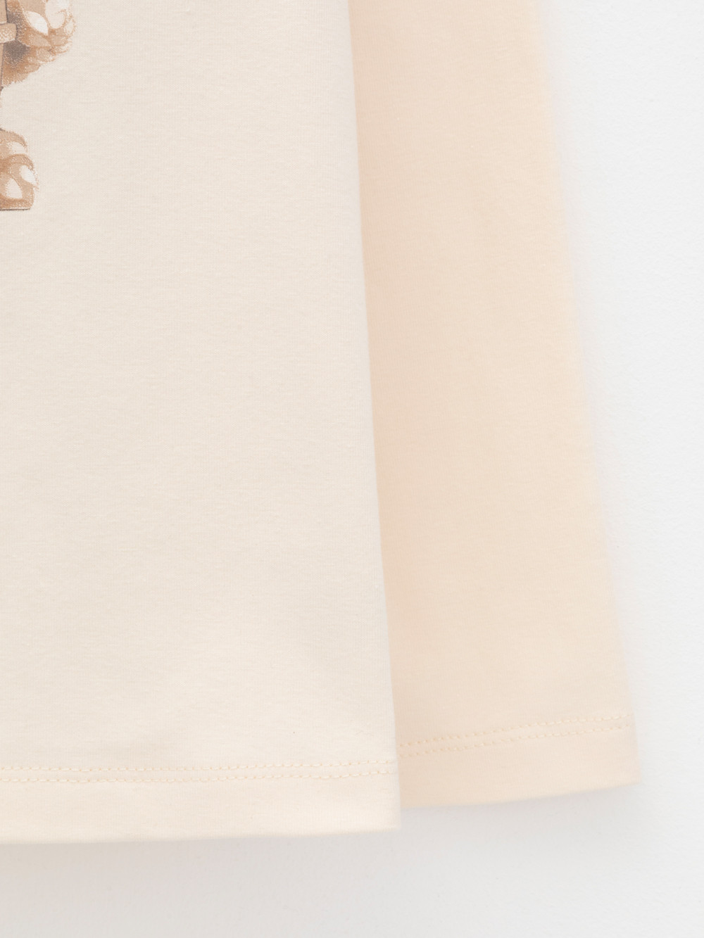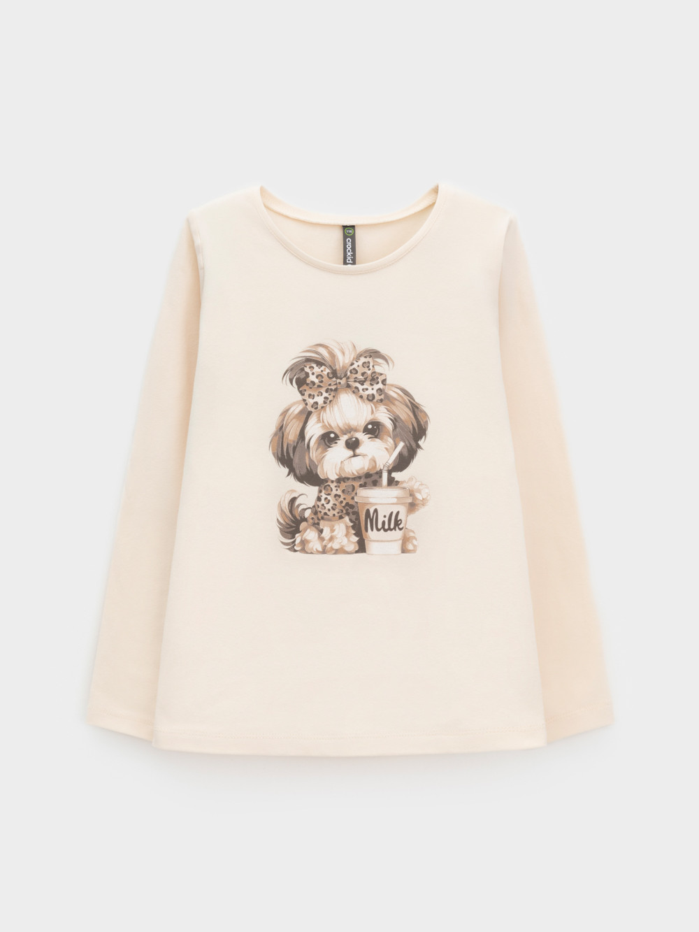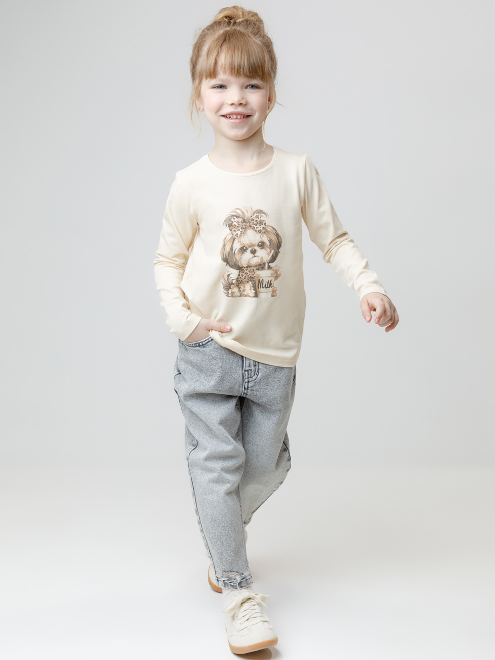 Лонгслив для девочки из гладкого эластичного трикотажа. Оригинальный принт выполнен из стойких текстильных гипоаллергенных красителей. Изделие сохраняет цвет и форму после многократных стирок. Все трикотажные полотна производятся в соответствии с нормами швейцарского сертификата ЭкоТекс.