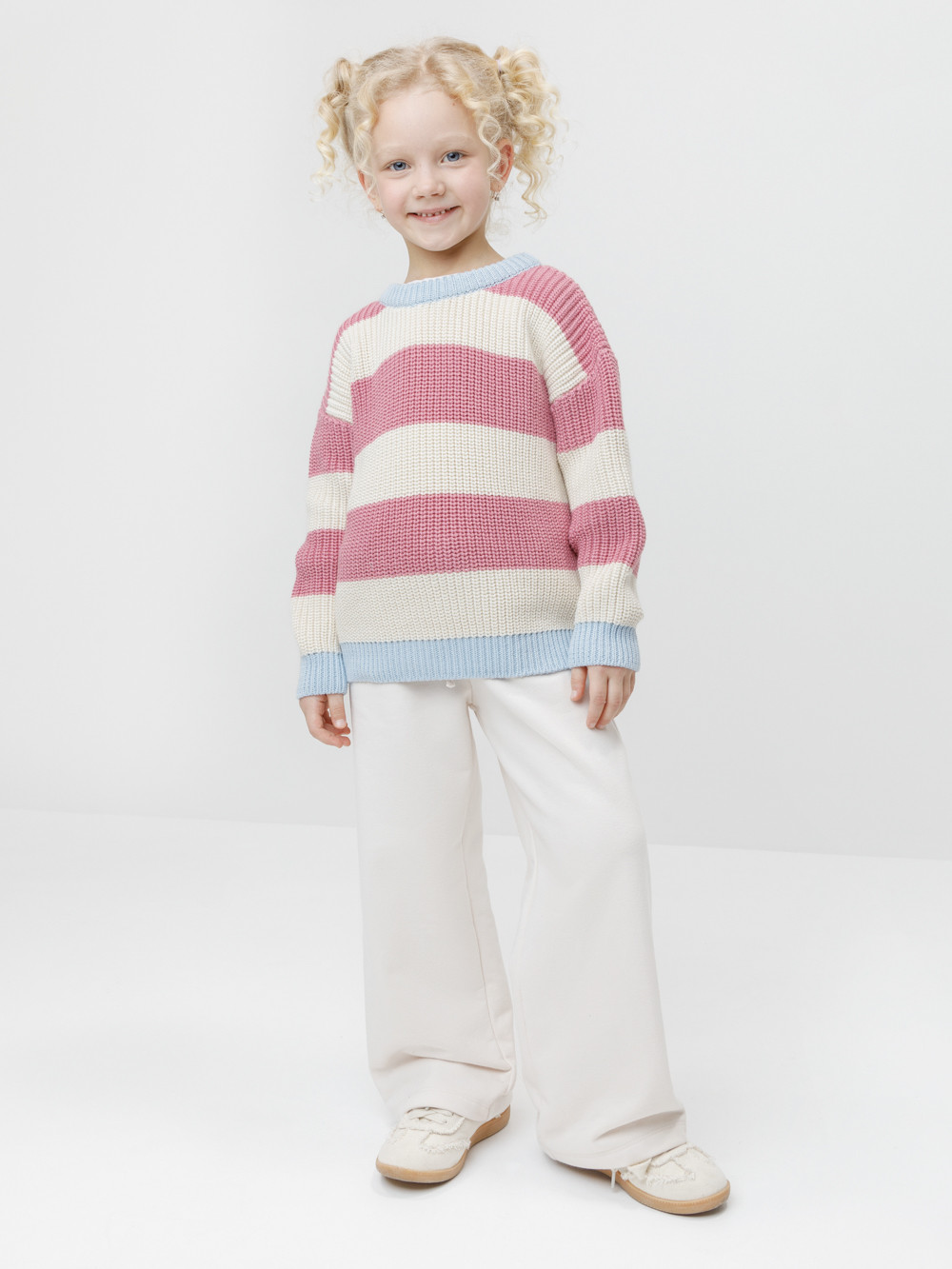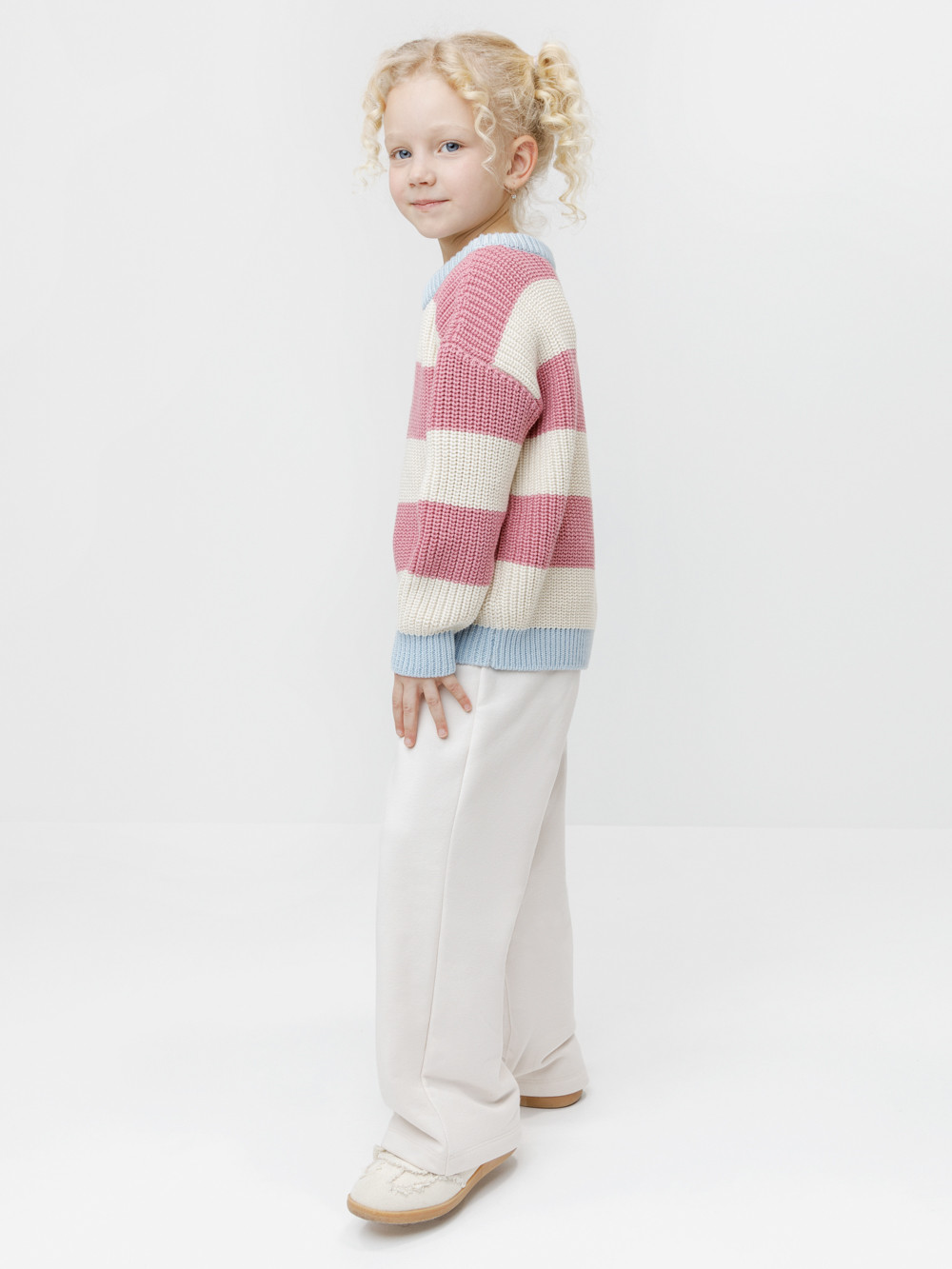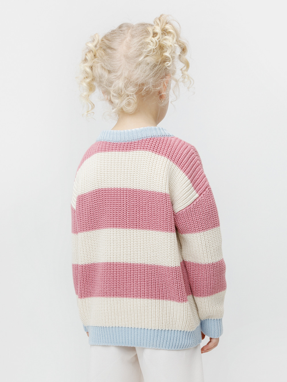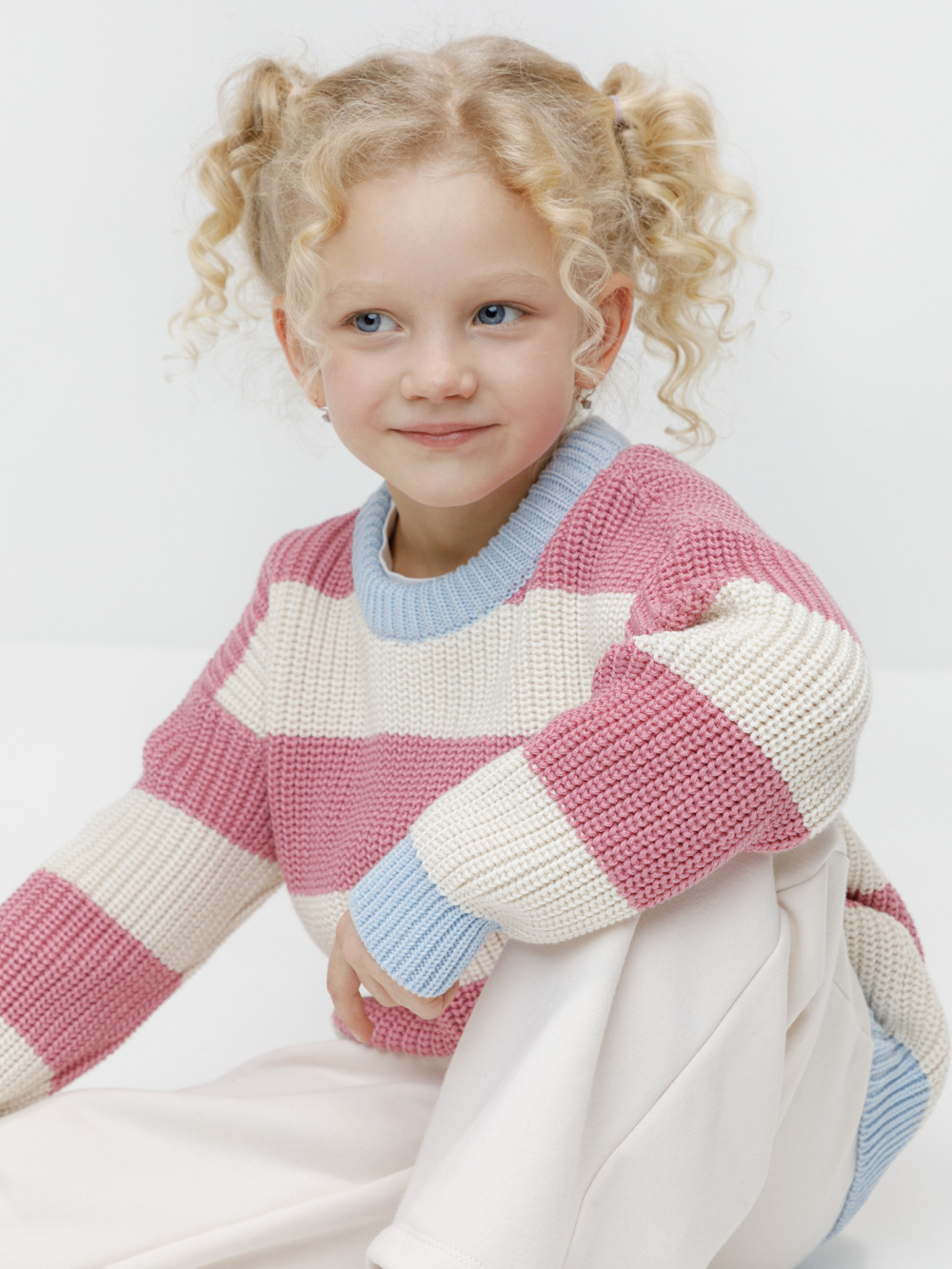 Вязаный джемпер объёмный. Изготовлен из мягкой хлопковой пряжи с добавлением акрила. Длинные рукава с манжетами. Внизу эластичный пояс. Изделие сохраняет форму и стойкий цвет после многочисленных стирок.
