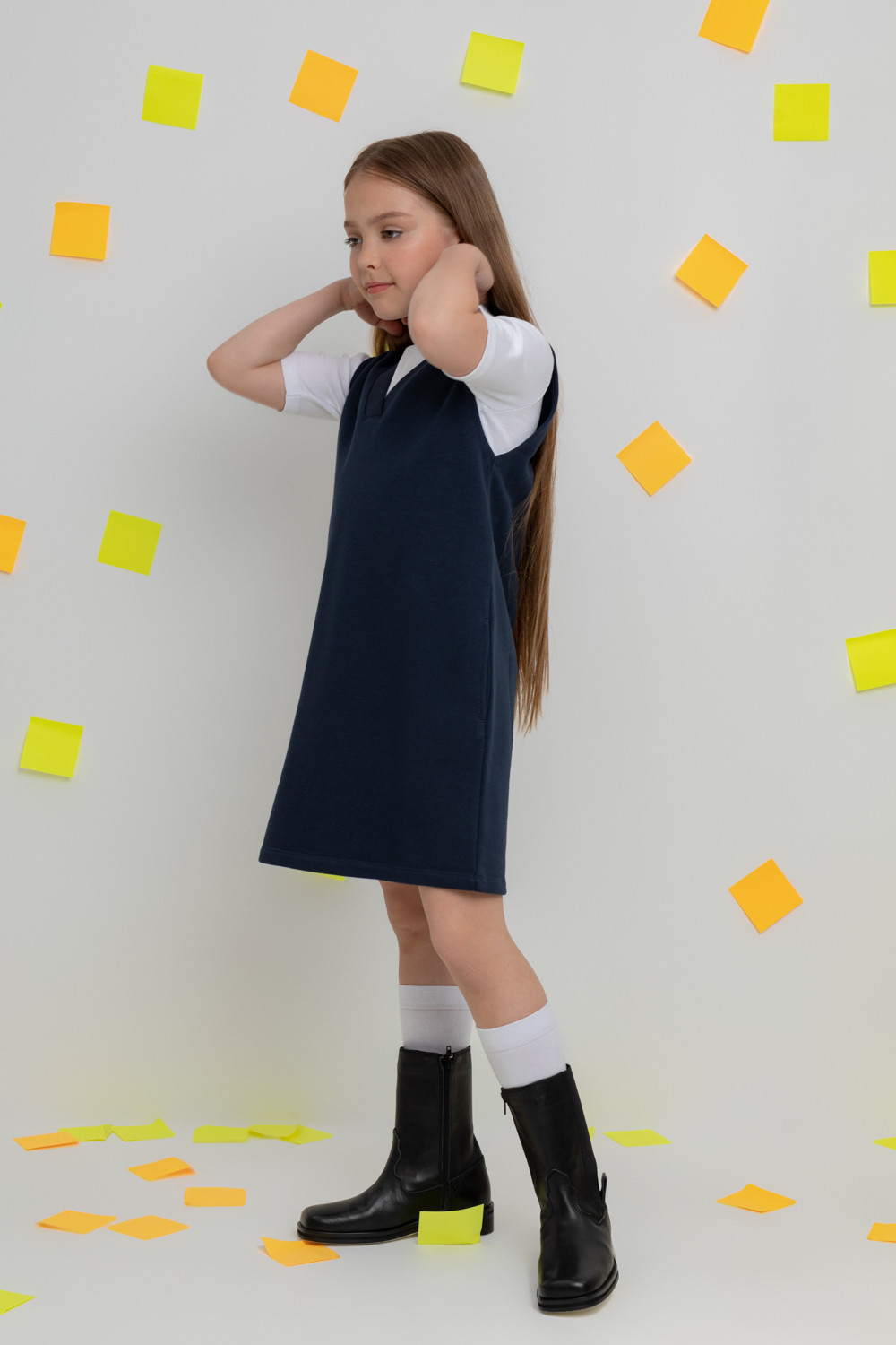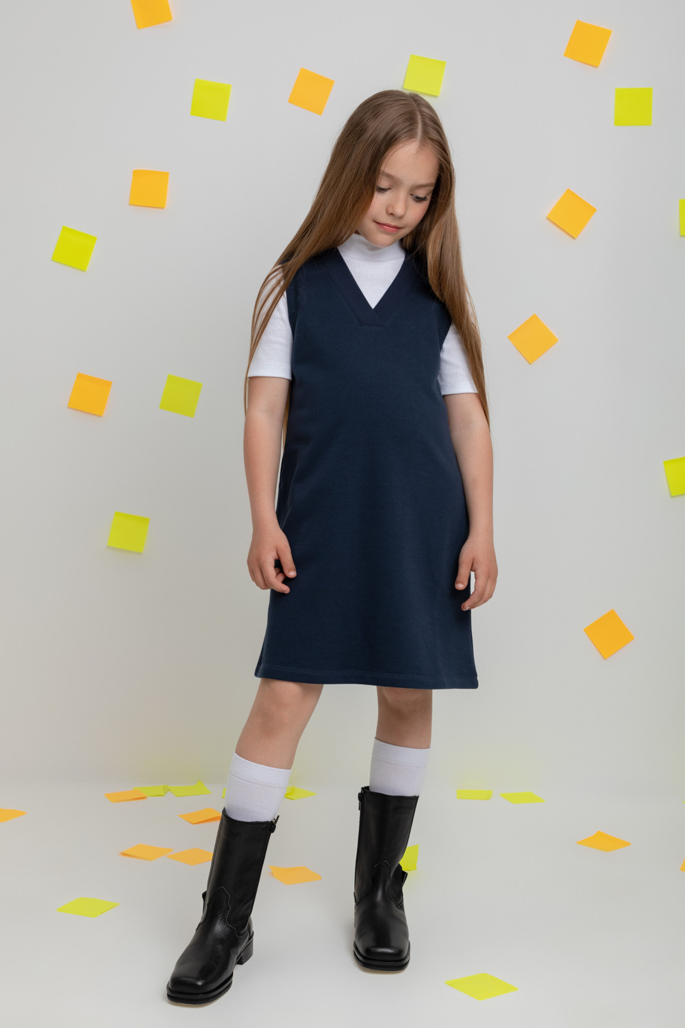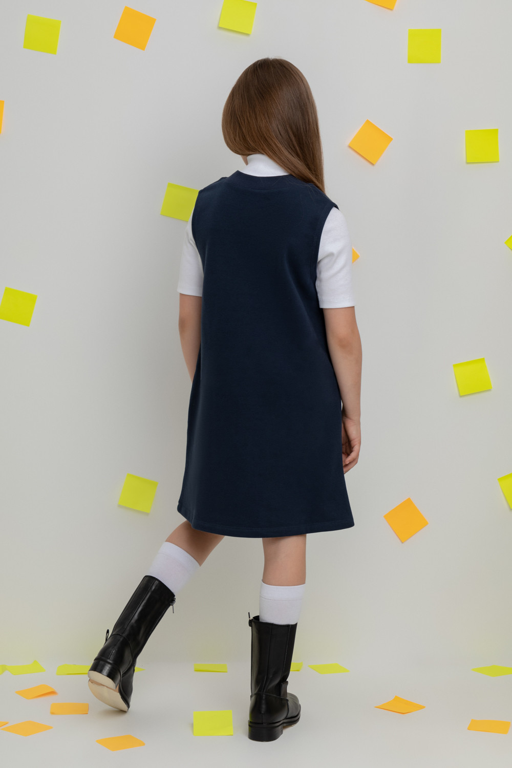 Платье школьное для девочки. Произведено из мягкого трикотажного футера трёхнитки. В составе 80% натурального хлопка и 20% полиэстера, при этом полиэстер ввязан внутрь по особой технологии и не соприкасается с кожей.
