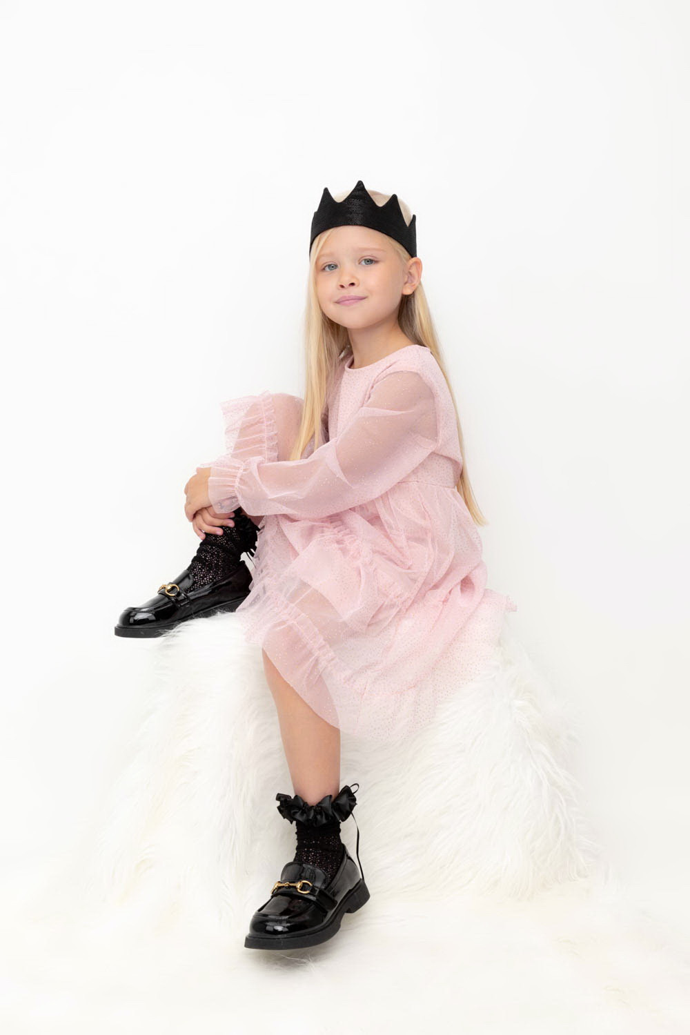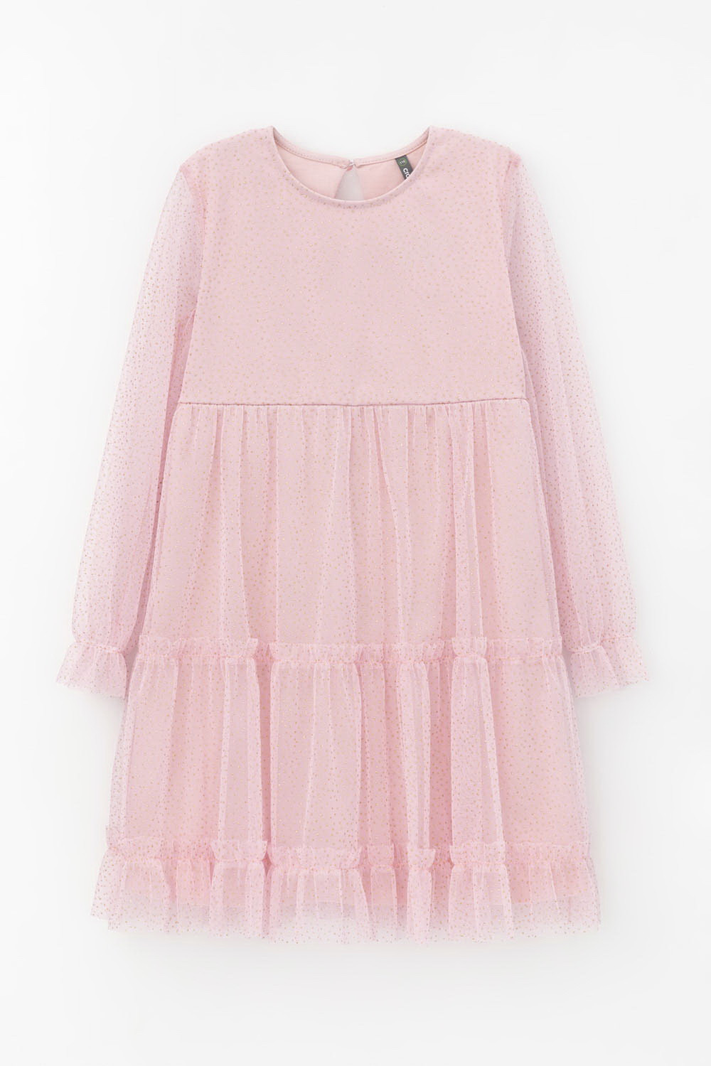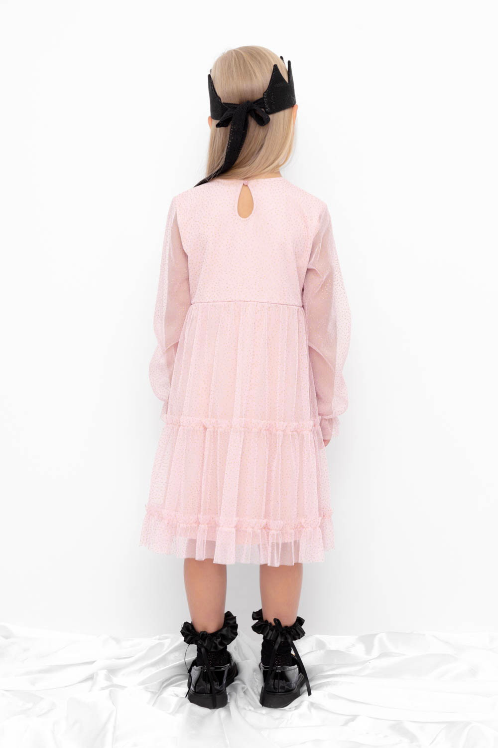 Нарядное платье для девочки из высококачественного трикотажа супрем с лёгким слоем из сетки с золотыми блёстками. Длинные рукава из сетки собраны на резинку. Для удобства одевания платье застёгивается на пуговицу на спинке. Платье сохраняет форму и стойкий цвет после многочисленных стирок и идеально подходит для праздников и фотосессий.
