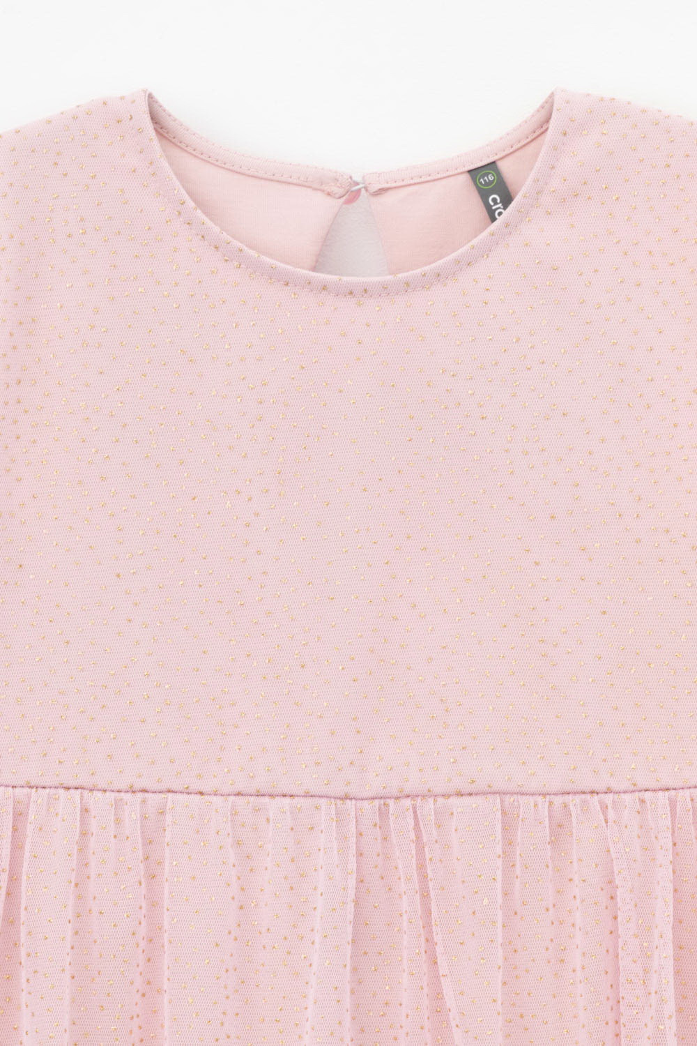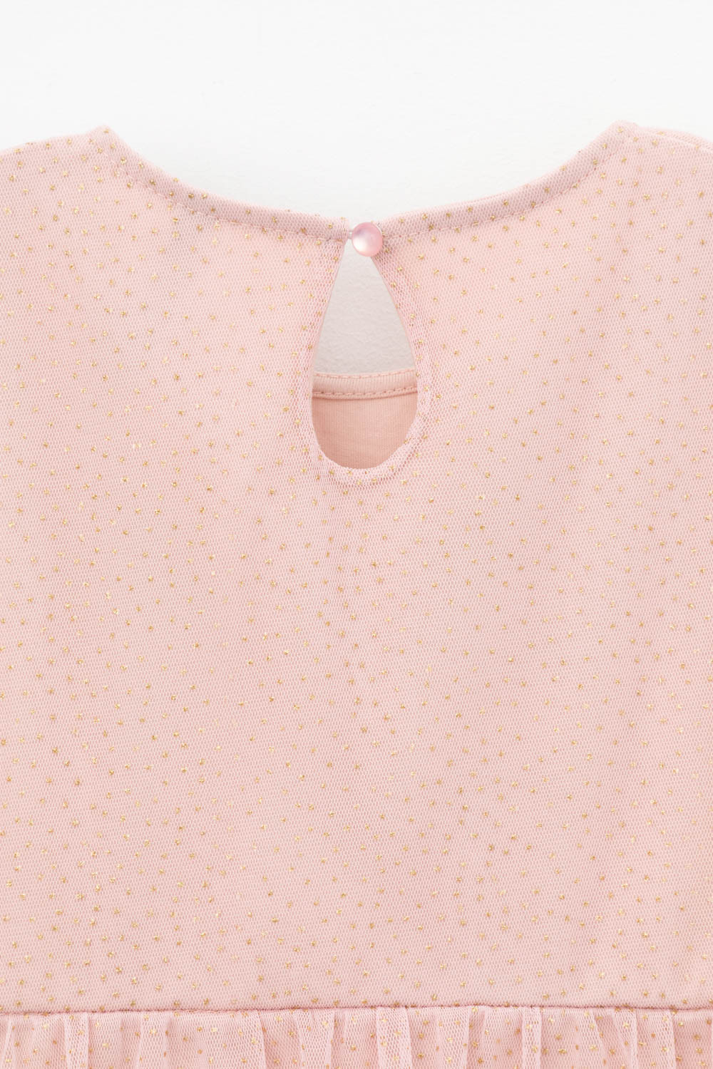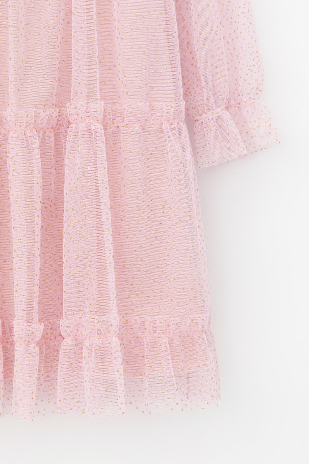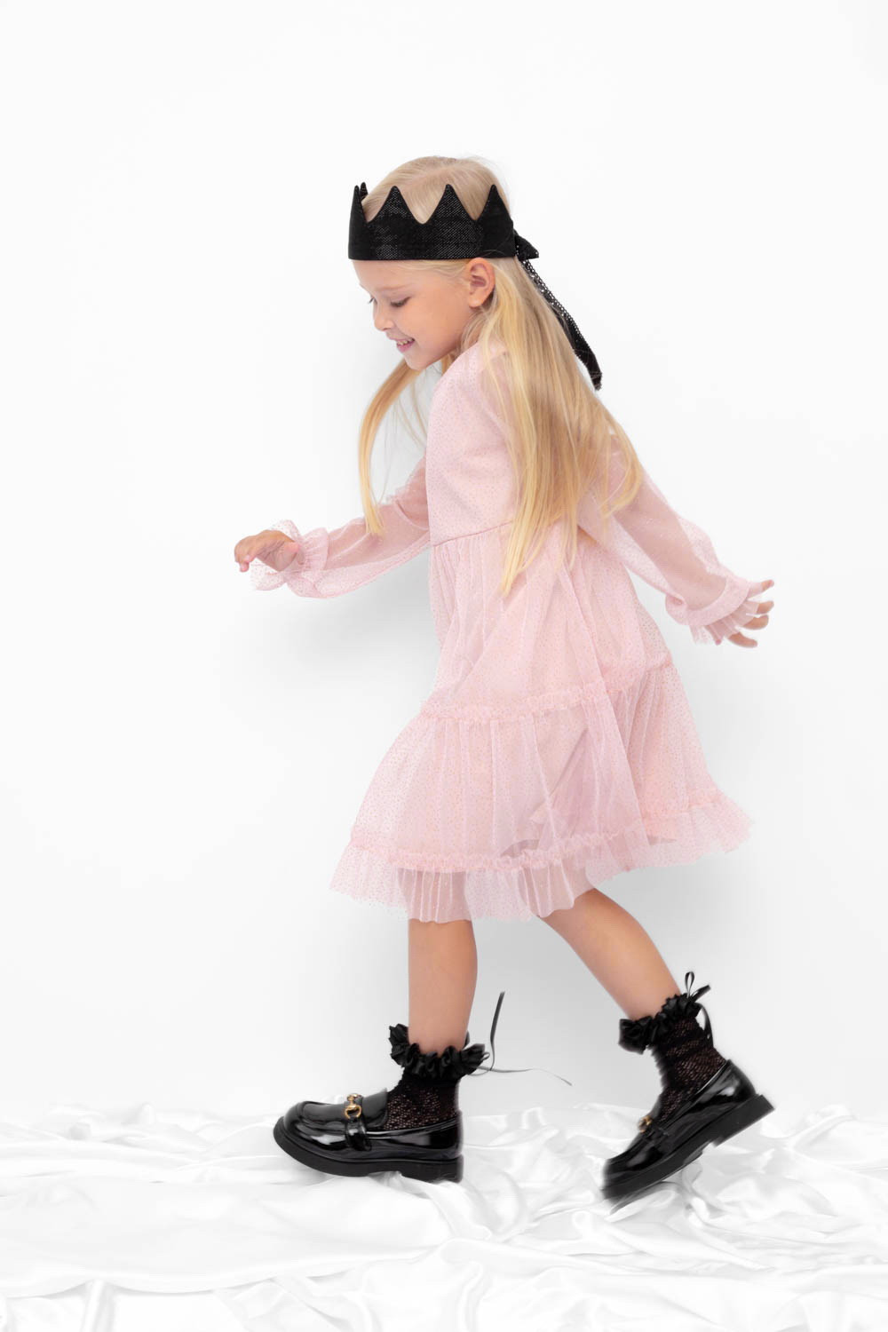 Нарядное платье для девочки из высококачественного трикотажа супрем с лёгким слоем из сетки с золотыми блёстками. Длинные рукава из сетки собраны на резинку. Для удобства одевания платье застёгивается на пуговицу на спинке. Платье сохраняет форму и стойкий цвет после многочисленных стирок и идеально подходит для праздников и фотосессий.