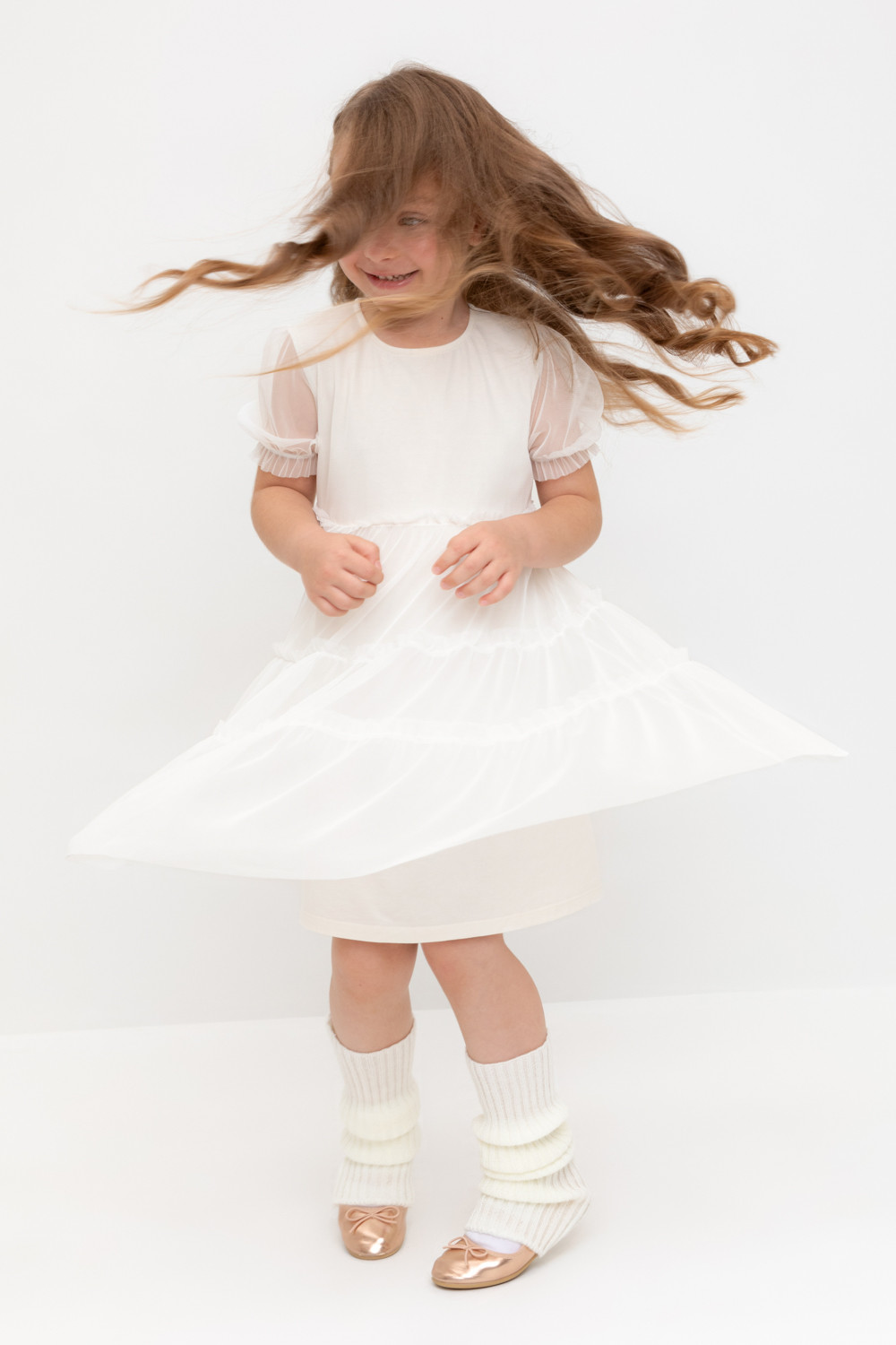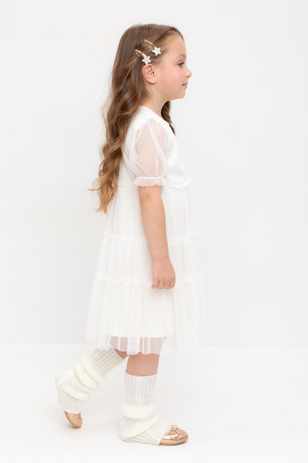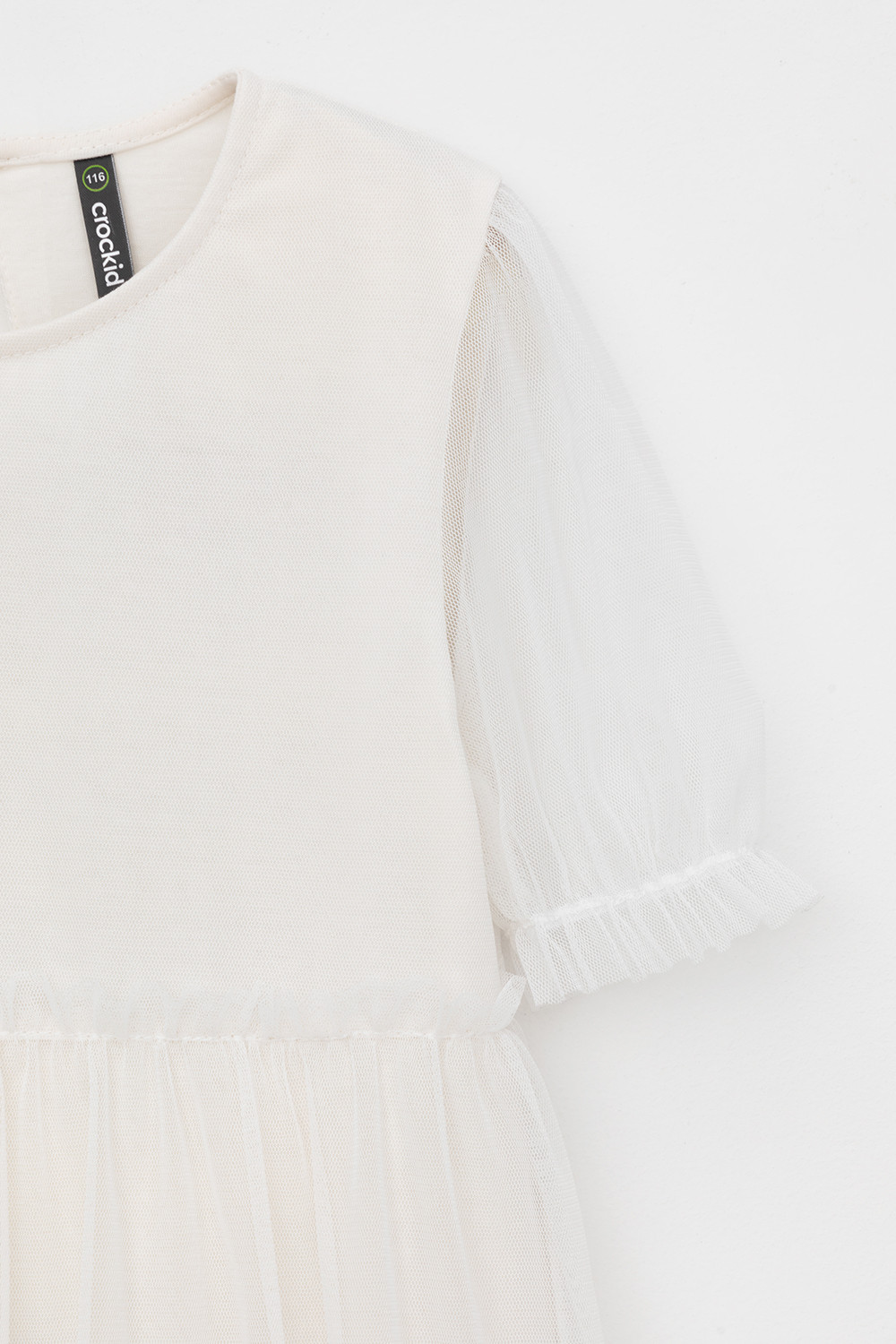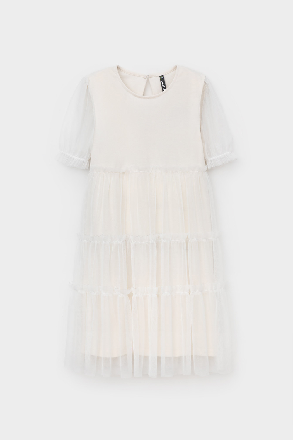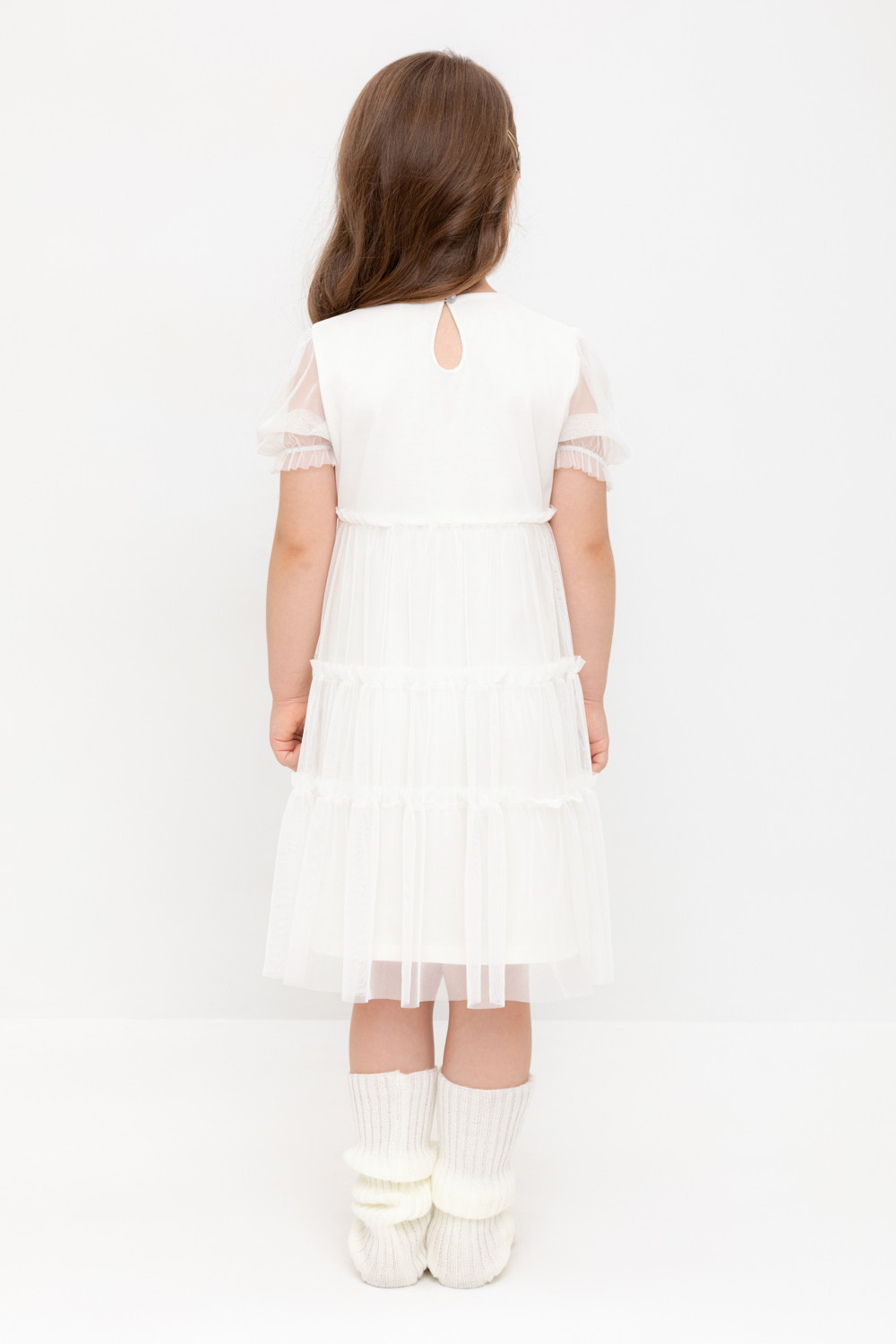 Нарядное платье для девочки из высококачественного трикотажа супрем с лёгким слоем из сетки. Короткие рукава из сетки собраны на резинку. Для удобства одевания платье застёгивается на пуговицу на спинке. Платье сохраняет форму и стойкий цвет после многочисленных стирок и идеально подходит для праздников и фотосессий.