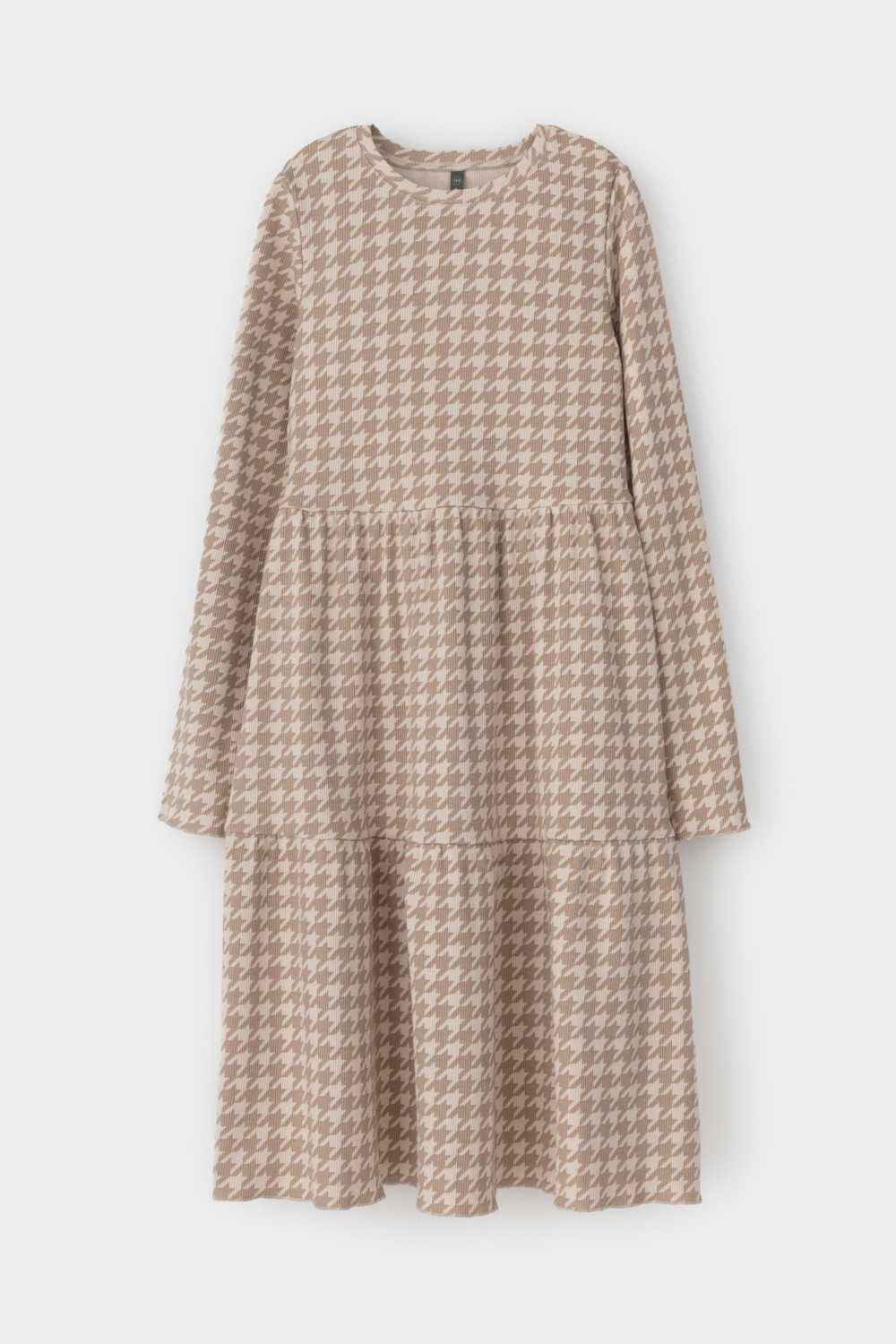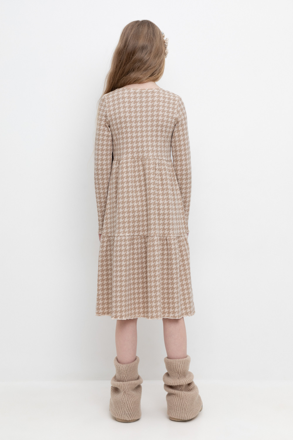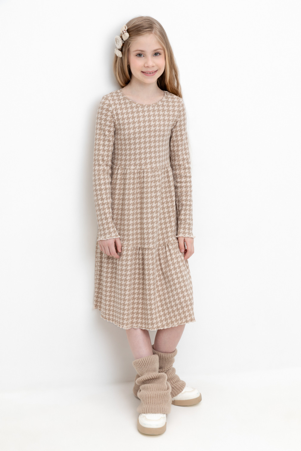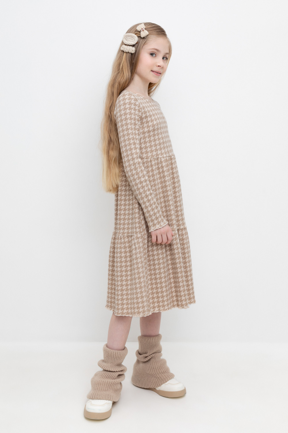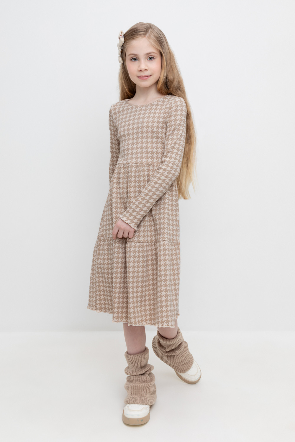 Платье для девочки из эластичного трикотажа в рубчик. Оригинальная набивка выполнена из стойких текстильных гипоаллергенных красителей.