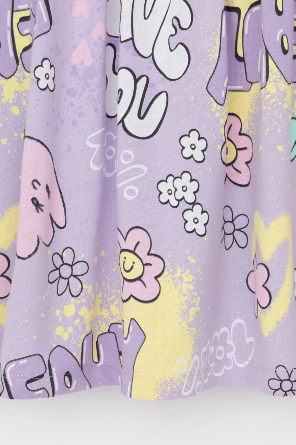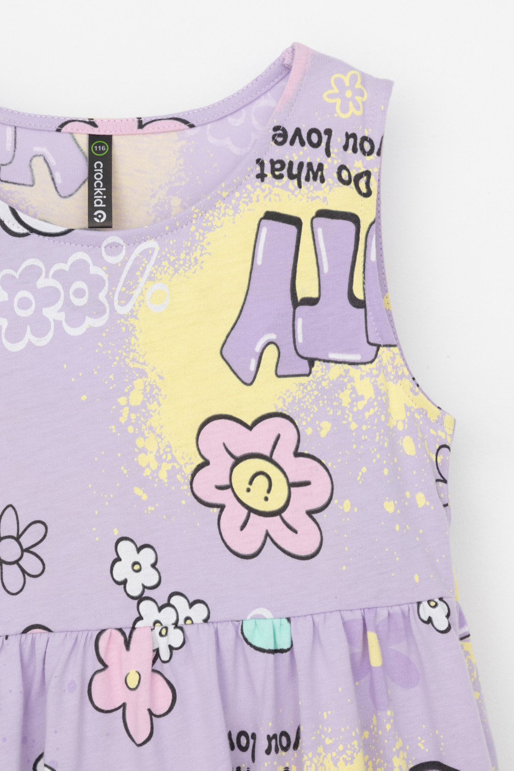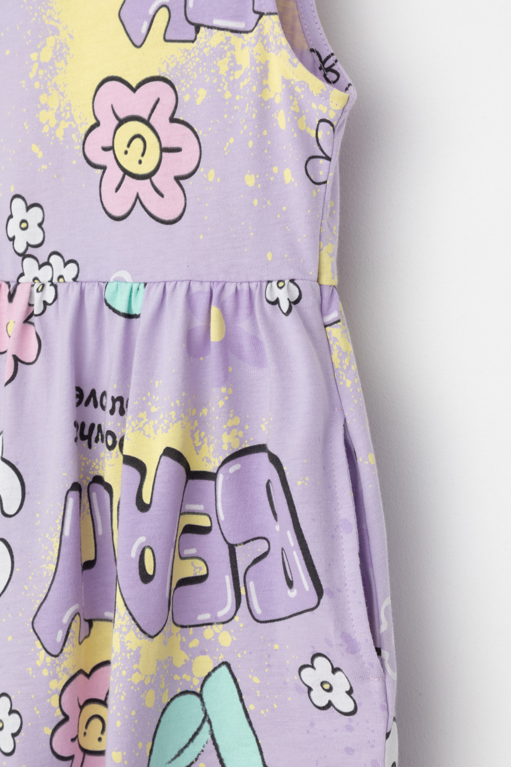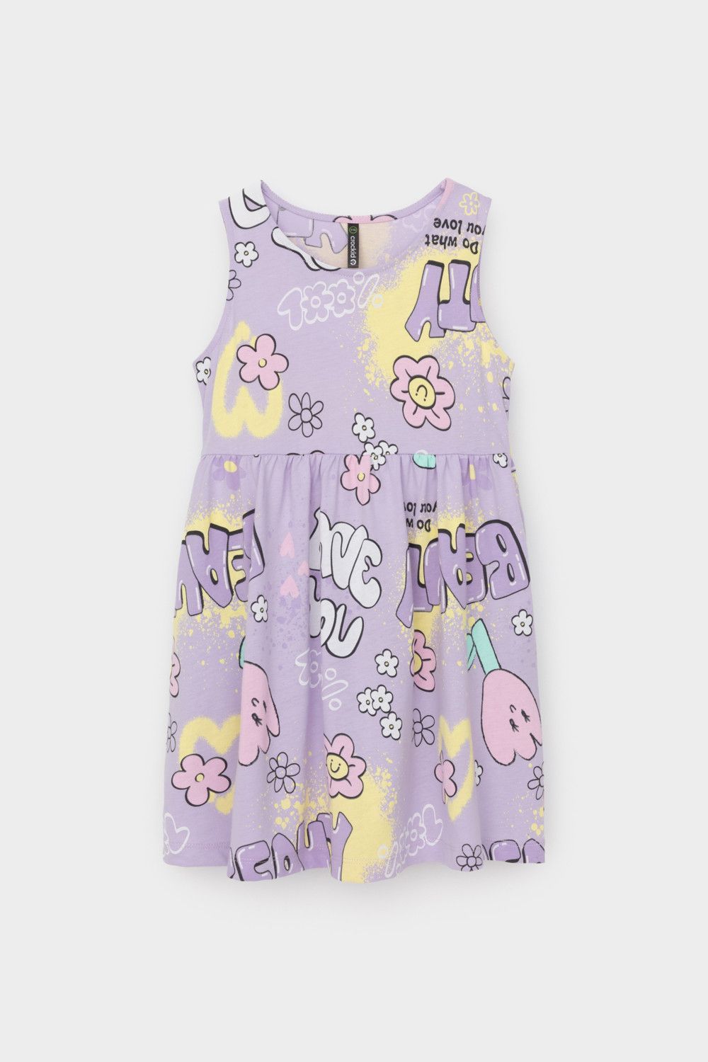 Легкое трикотажное платье для девочки из высококачественного хлопка. Оригинальная набивка выполнена из стойких текстильных гипоаллергенных красителей. Изделие сохраняет цвет и форму после многократных стирок.