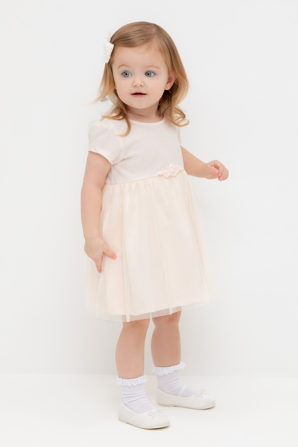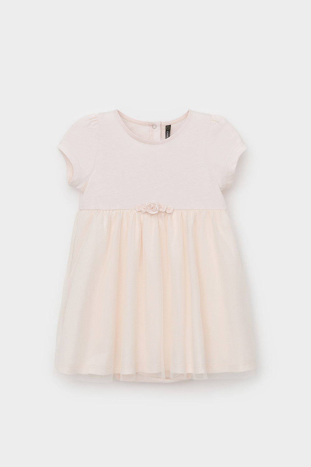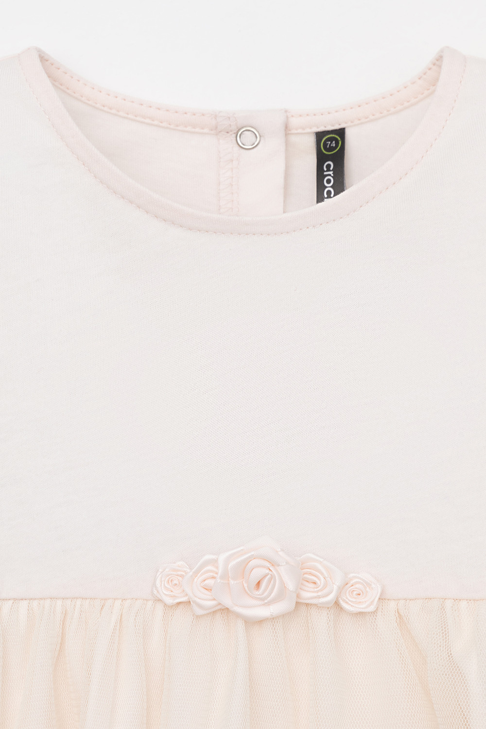 Нарядное платье с боди для девочки. Изготовлено из высококачественного хлопкового трикотажа супрем. Поверх юбки лёгкая сетка. Удобные застёжки расположены на спинке и по низу изделия. Спереди украшено декоративными розочками. Изделие сохраняет цвет и форму после многократных стирок.