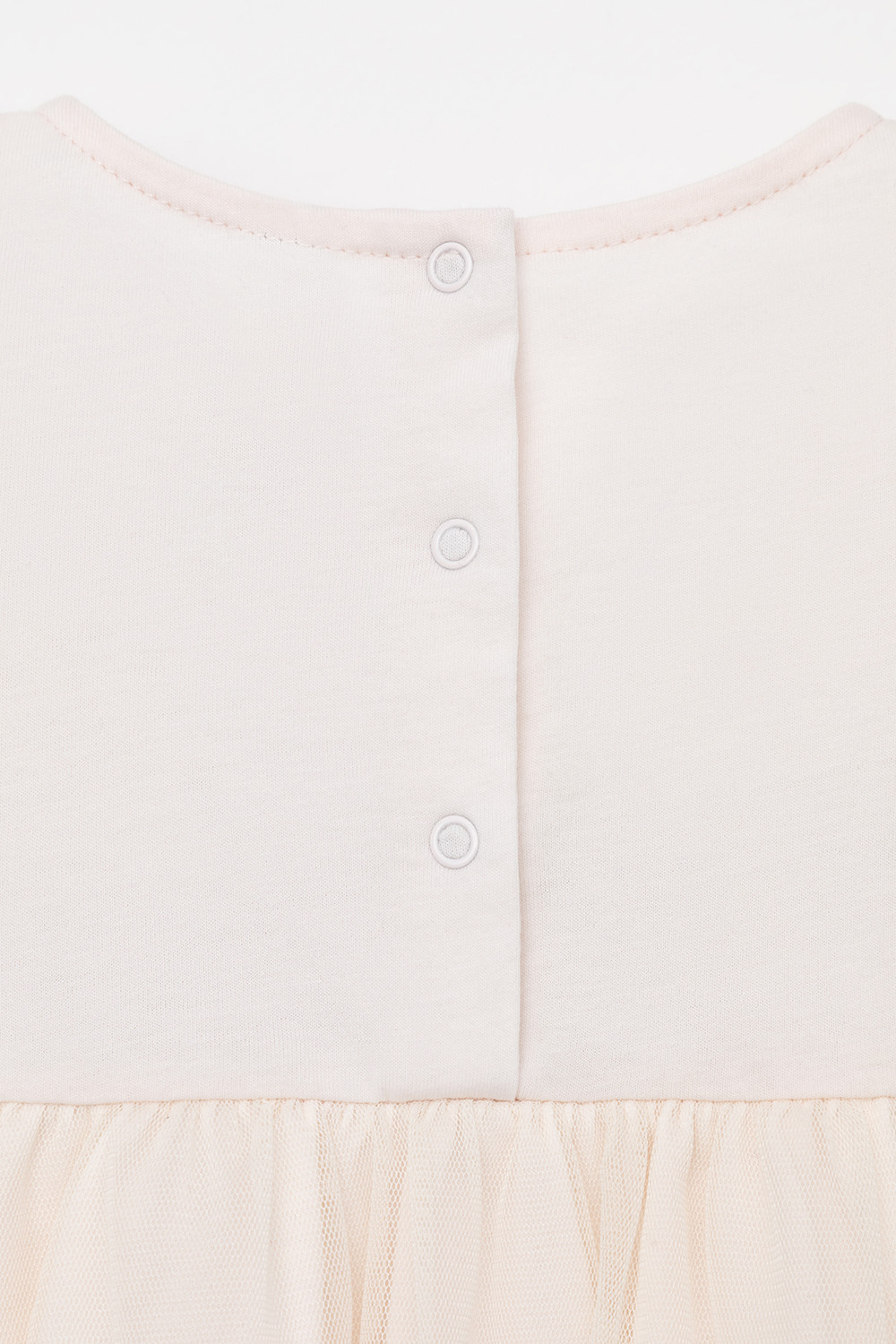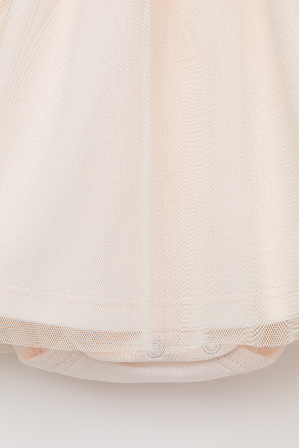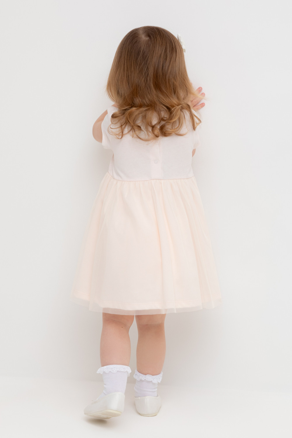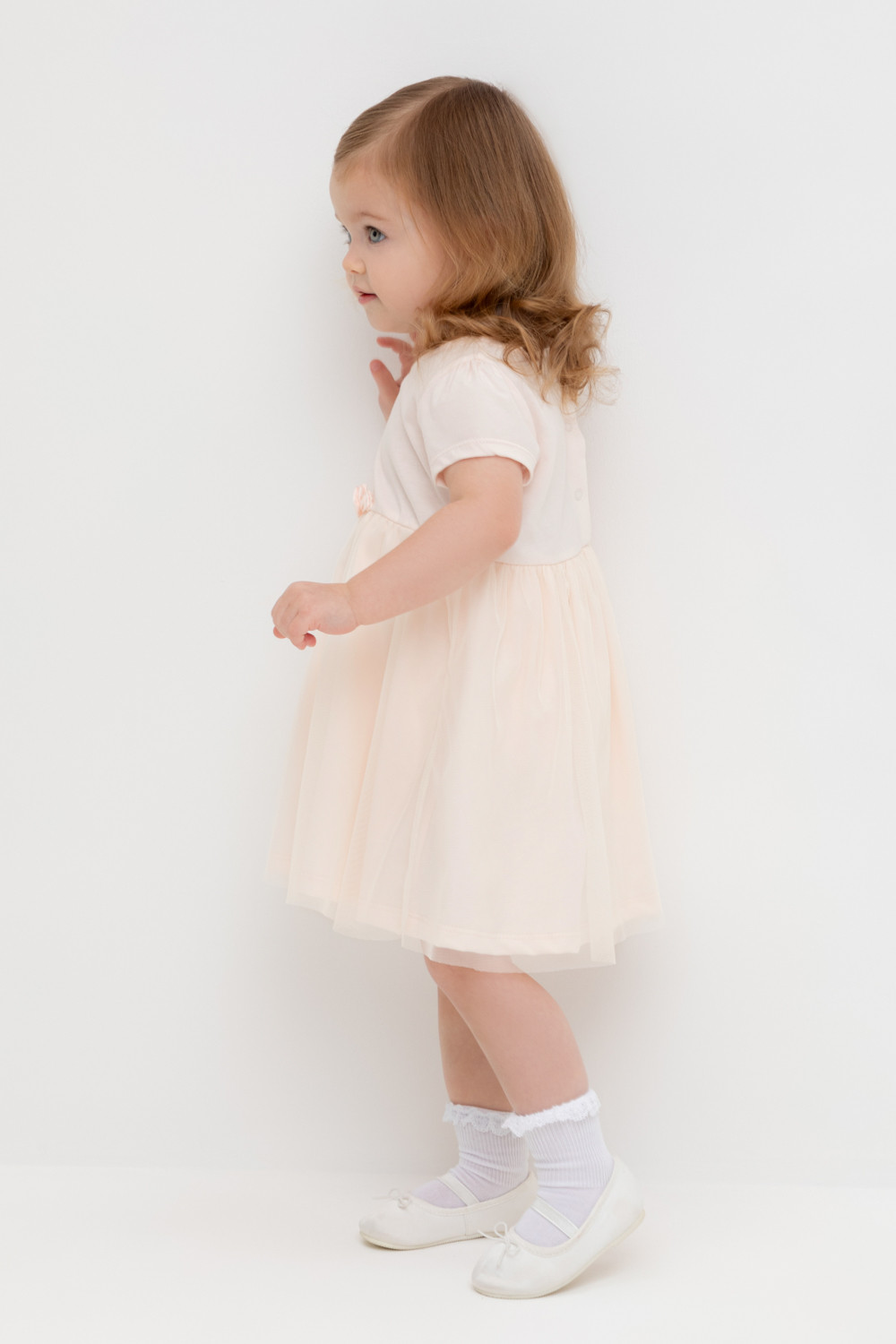 Нарядное платье с боди для девочки. Изготовлено из высококачественного хлопкового трикотажа супрем. Поверх юбки лёгкая сетка. Удобные застёжки расположены на спинке и по низу изделия. Спереди украшено декоративными розочками. Изделие сохраняет цвет и форму после многократных стирок.