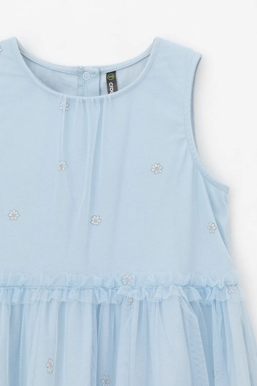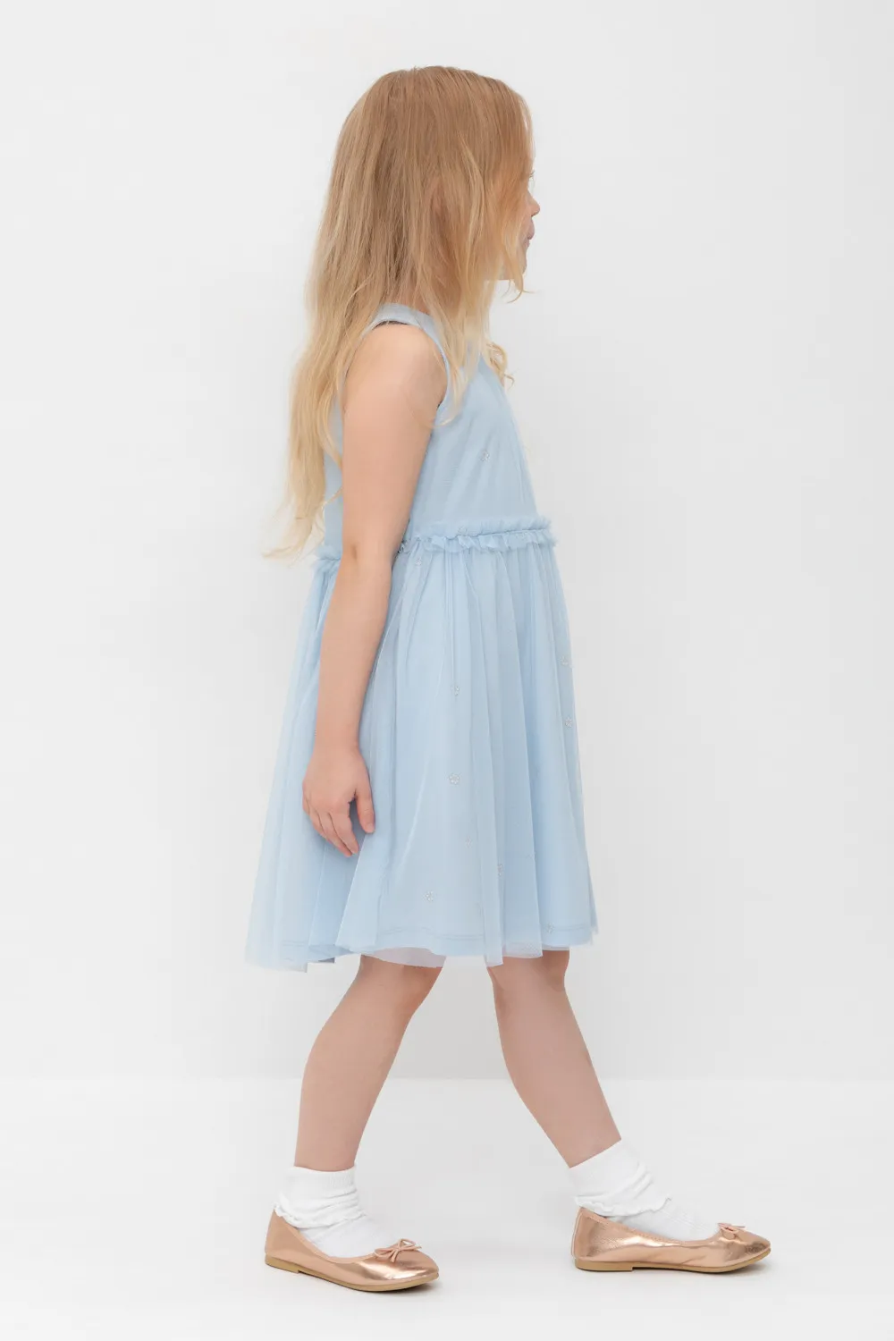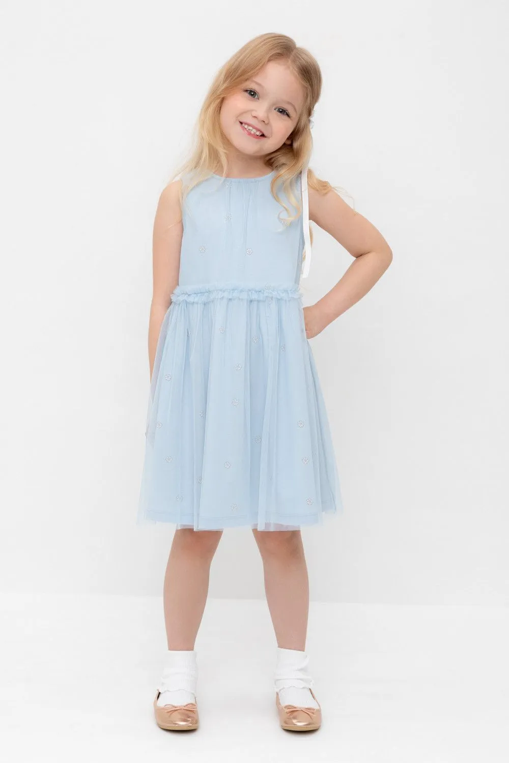 Легкое нарядное платье для девочки из высококачественного трикотажа, верхний слой - из сетки. Застёгивается на спинке с помощью кнопок. Оригинальная набивка выполнена из стойких текстильных гипоаллергенных красителей. Изделие сохраняет цвет и форму после многократных стирок.