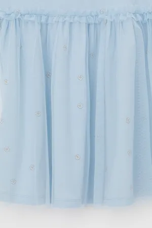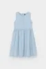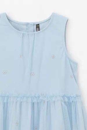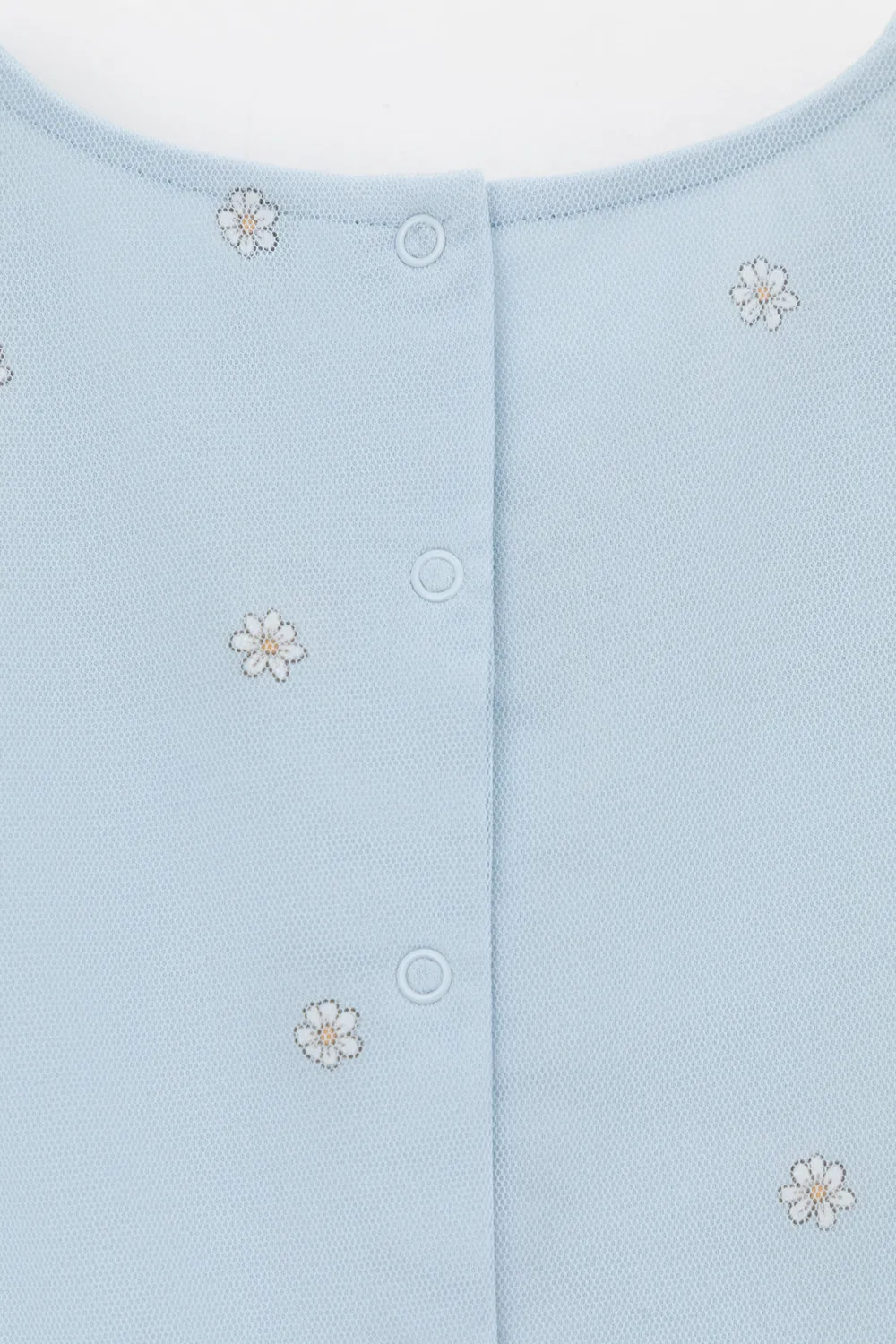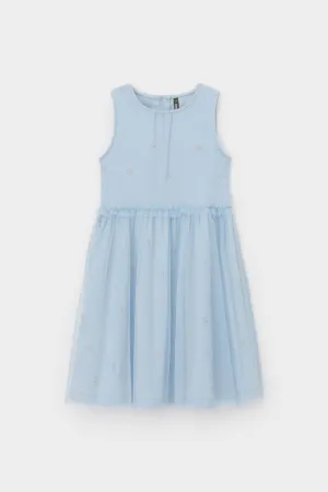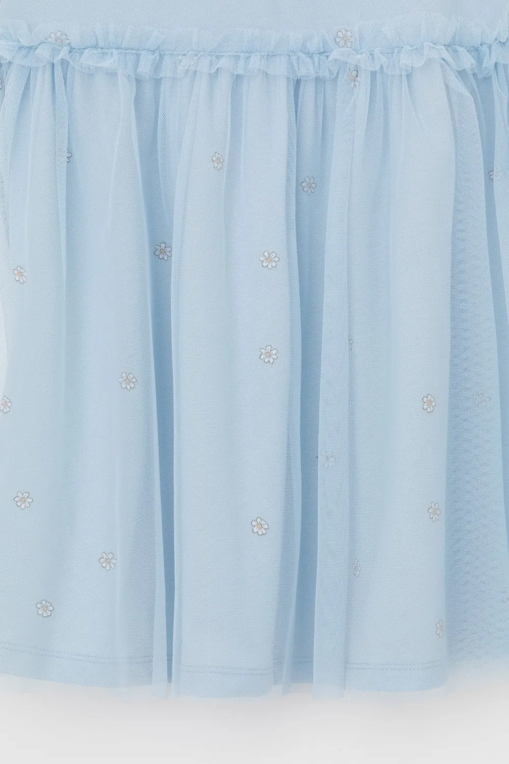 Легкое нарядное платье для девочки из высококачественного трикотажа, верхний слой - из сетки. Застёгивается на спинке с помощью кнопок. Оригинальная набивка выполнена из стойких текстильных гипоаллергенных красителей. Изделие сохраняет цвет и форму после многократных стирок.