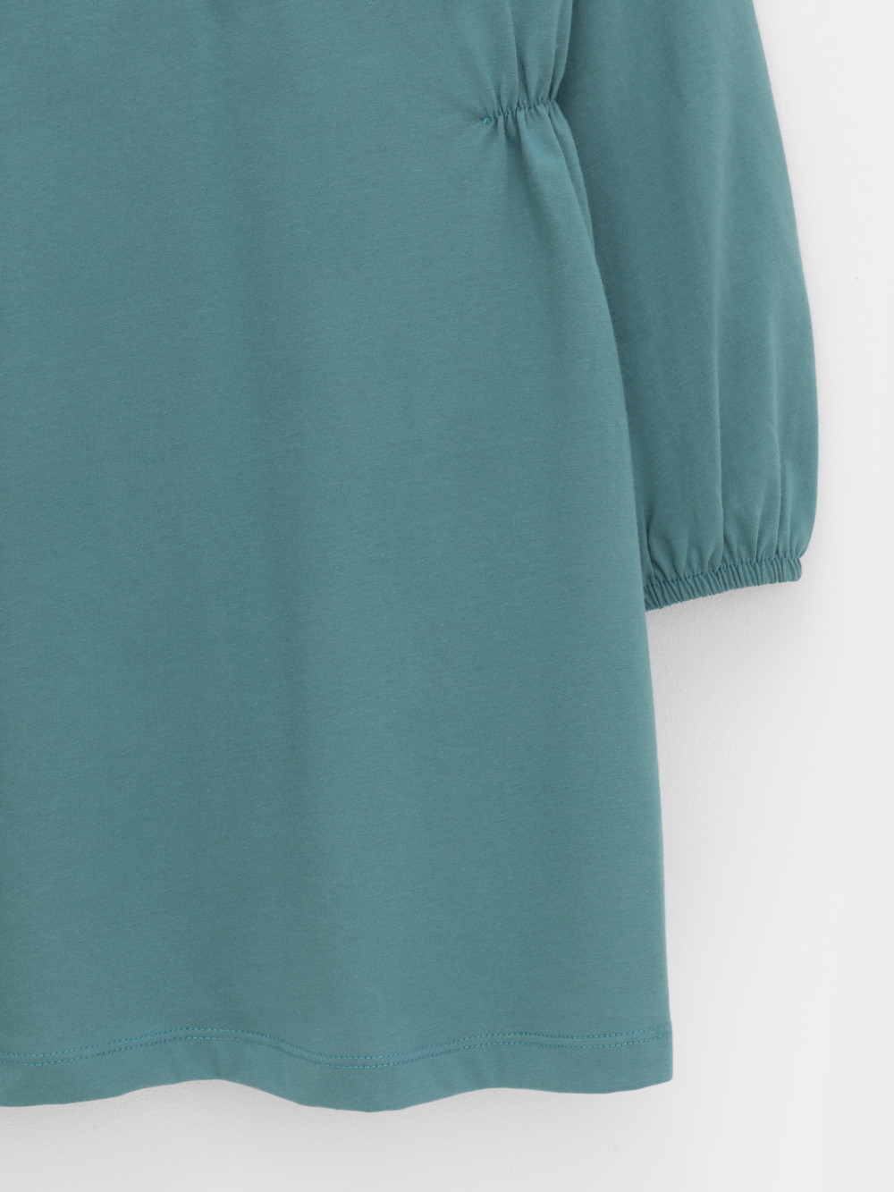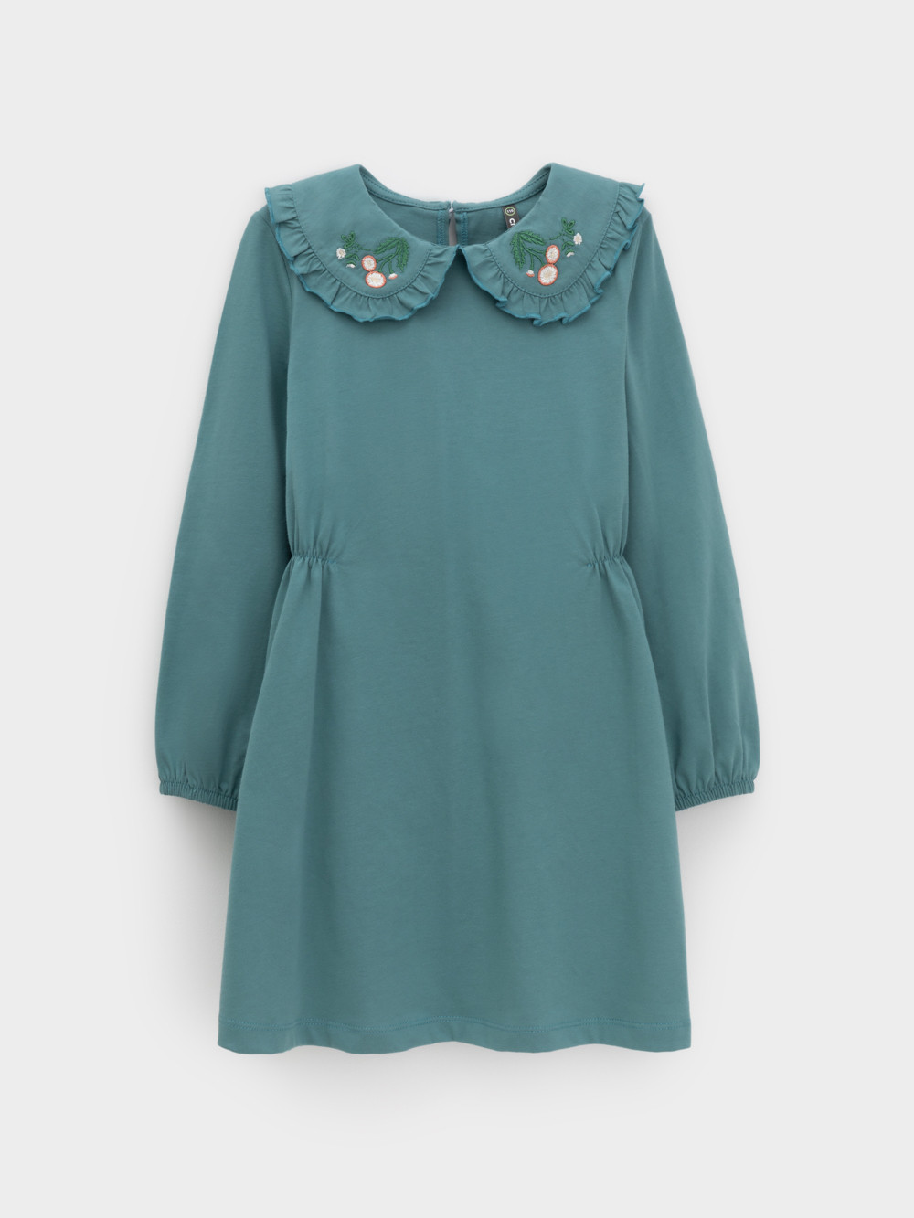 Платье для девочки с длинными рукавами из высококачественного трикотажа супрем. Украшено отложным воротничком с вышивкой. Для удобства одевания платье на спинке застёгивается на пуговицу. Платье сохраняет форму и стойкий цвет после многочисленных стирок и идеально подходит на каждый день. Все трикотажные полотна производятся в соответствии с нормами швейцарского сертификата ЭкоТекс.