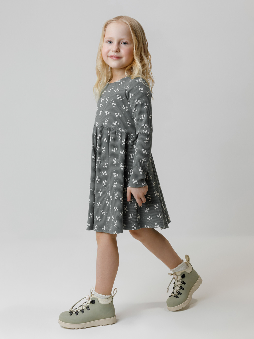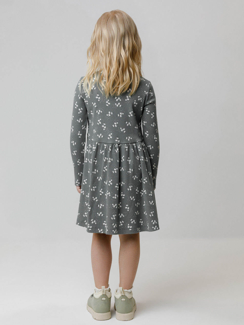 Платье для девочки из эластичного трикотажа в рубчик. Оригинальный рисунок выполнен из стойких текстильных гипоаллергенных красителей. Изделие сохраняет цвет и форму после многократных стирок. Все трикотажные полотна производятся в соответствии с нормами швейцарского сертификата ЭкоТекс.