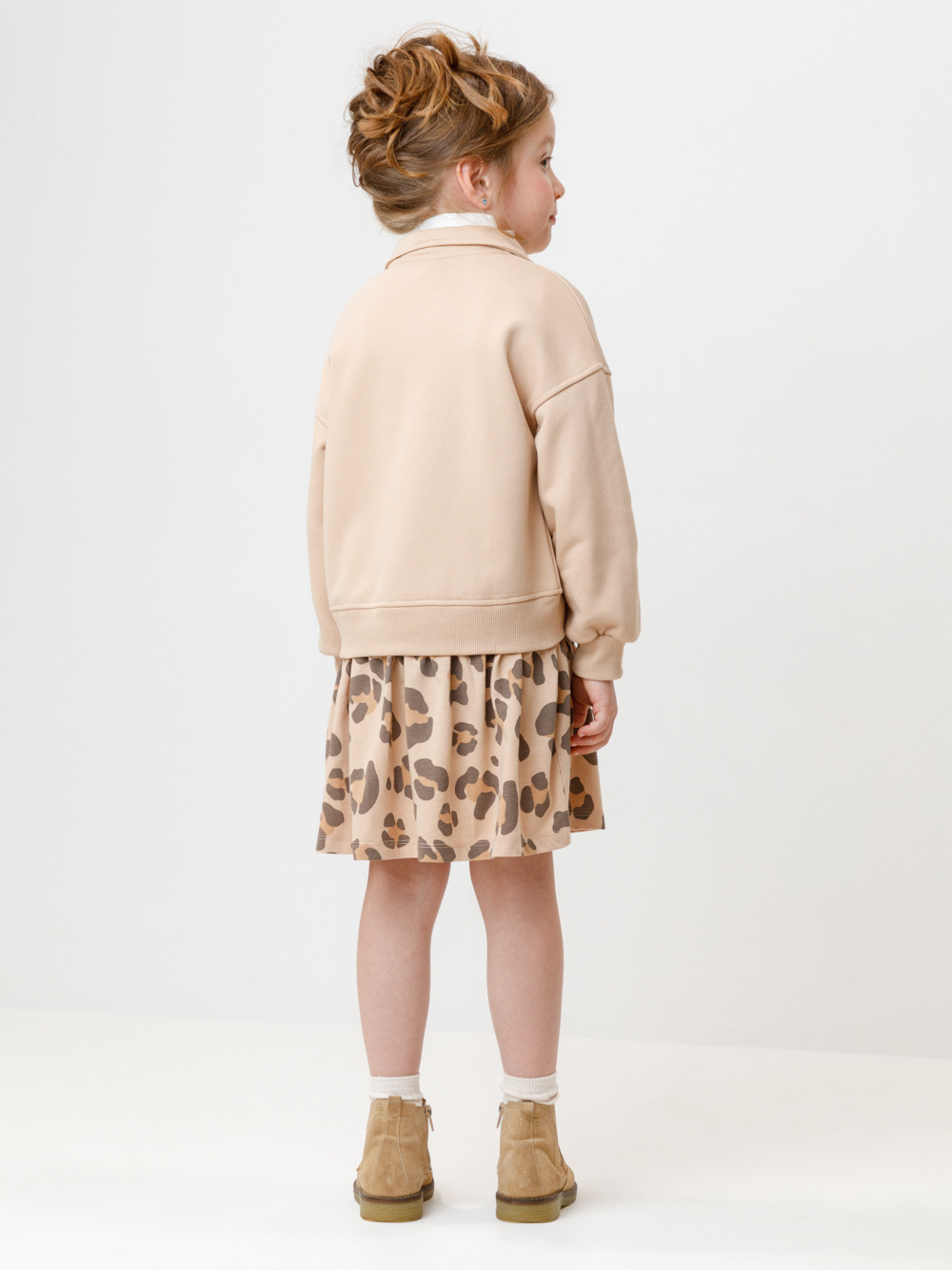 Платье для девочки с длинными рукавами и воротничком. Изготовлено из мягкого петельчатого трикотажа и украшено оборкой из гладкого материала супрем. Спереди застёжка на короткую молнию. Платье сохраняет форму и стойкий цвет после многочисленных стирок и идеально подходит на каждый день. Оригинальный принт выполнен из стойких текстильных гипоаллергенных красителей. Все трикотажные полотна производятся в соответствии с нормами швейцарского сертификата ЭкоТекс.