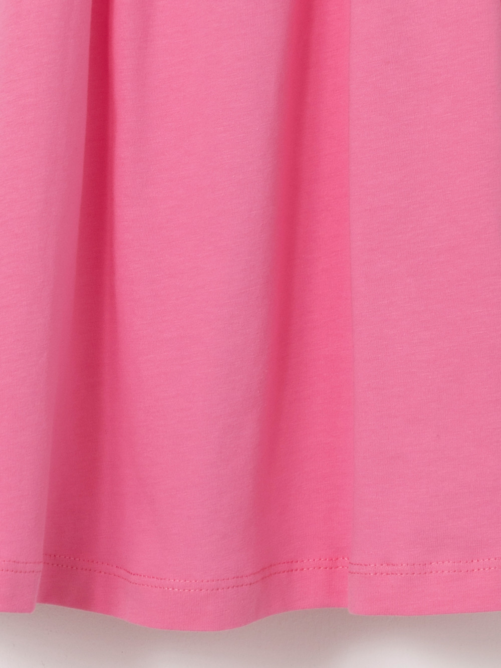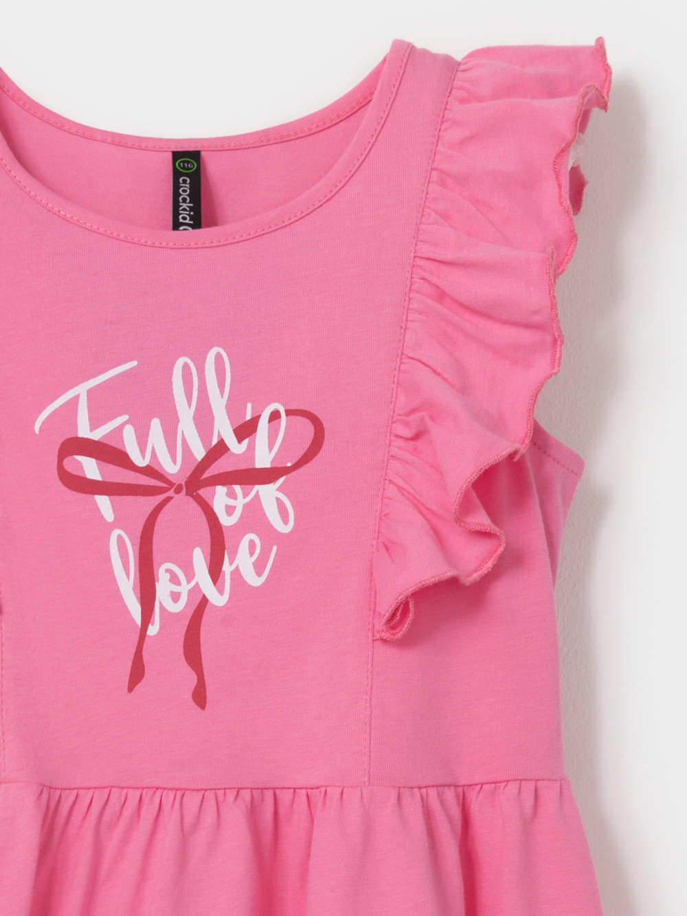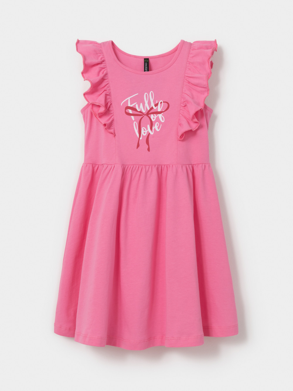 Лёгкое платье с оборками для девочки. Изготовлено из гладкого трикотажа супрем, который произведён из 100% натурального хлопка высокого качества. Изделие отлично дышит, поэтому идеально подходит на каждый день. Оригинальный принт выполнен из стойких текстильных гипоаллергенных красителей. Платье сохраняет форму и стойкий цвет после многочисленных стирок. Все трикотажные полотна производятся в соответствии с нормами швейцарского сертификата ЭкоТекс.