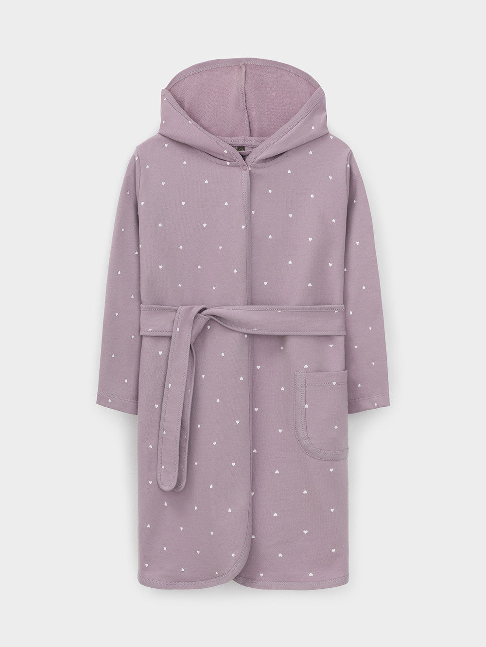 Халат с тонким капюшоном. Изготовлен из набивного хлопкового трикотажа футер петля. С помощью пояса можно регулировать посадку по фигуре. Сверху застёжка на кнопку. Края изделия обработаны мягким кантом. На боку накладной карман, уходящий в шов. Оригинальная набивка выполнена из стойких гипоаллергенных текстильных красителей. Все трикотажные полотна производятся в соответствии с нормами швейцарского сертификата ЭкоТекс.