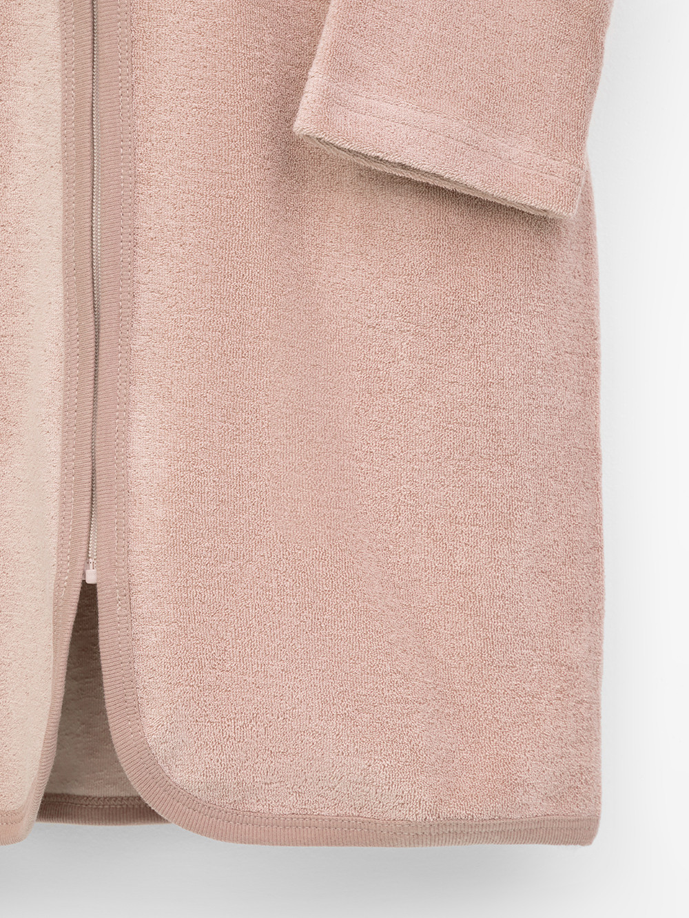 Халат на молнии с капюшоном. Изготовлен из мягкого махрового полотна, произведённого из натурального хлопка. В капюшоне подклад из высококачественного гладкого трикотажа супрем. Края обработаны эластичным кантом. Все трикотажные полотна производятся в соответствии с нормами швейцарского сертификата ЭкоТекс.
