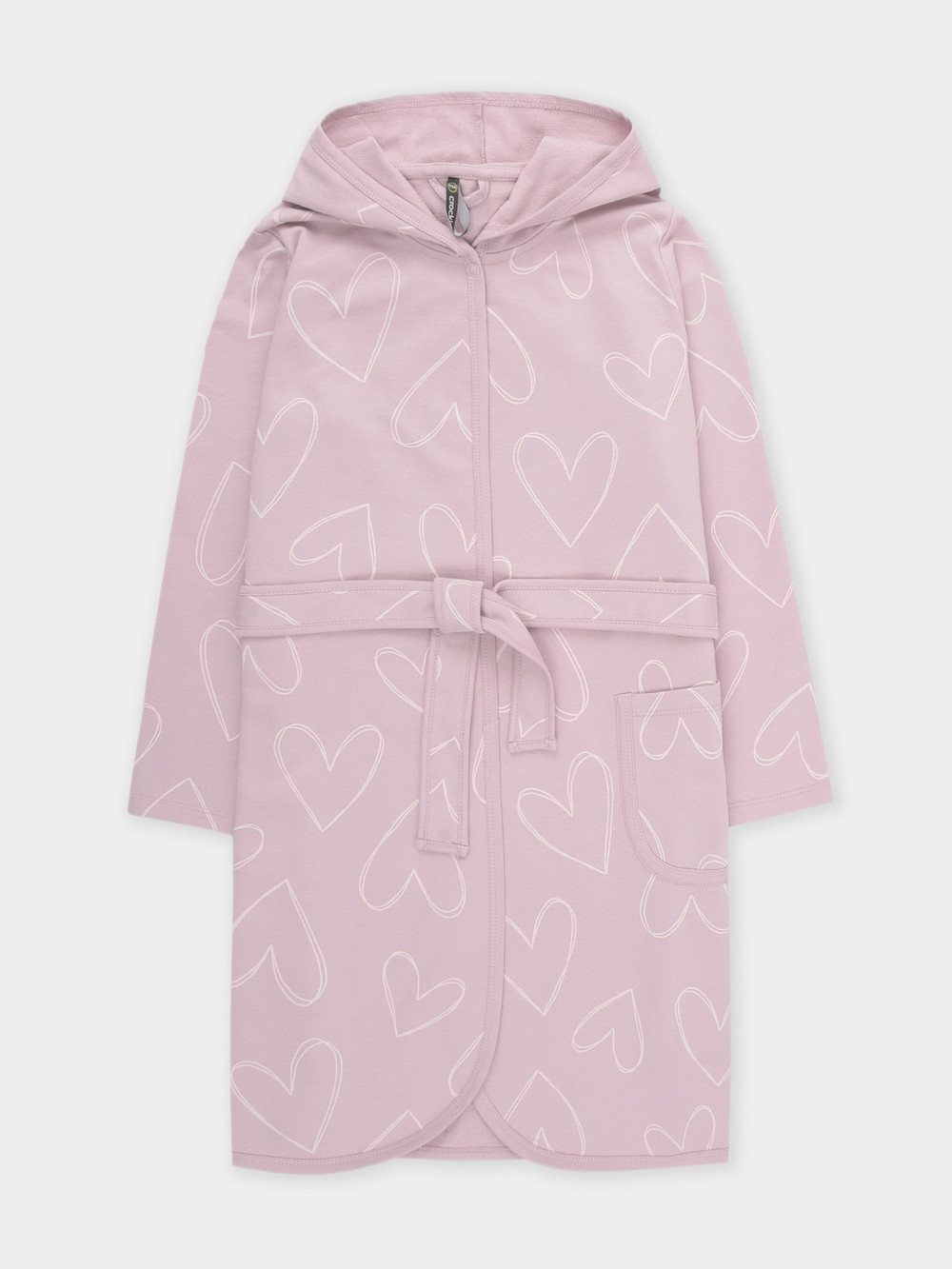 Халат с тонким капюшоном. Изготовлен из набивного хлопкового трикотажа футер петля. С помощью пояса можно регулировать посадку по фигуре. Сверху застёжка на кнопку. Края изделия обработаны мягким кантом. На боку накладной карман, уходящий в шов. Оригинальная набивка выполнена из стойких гипоаллергенных текстильных красителей. Все трикотажные полотна производятся в соответствии с нормами швейцарского сертификата ЭкоТекс.