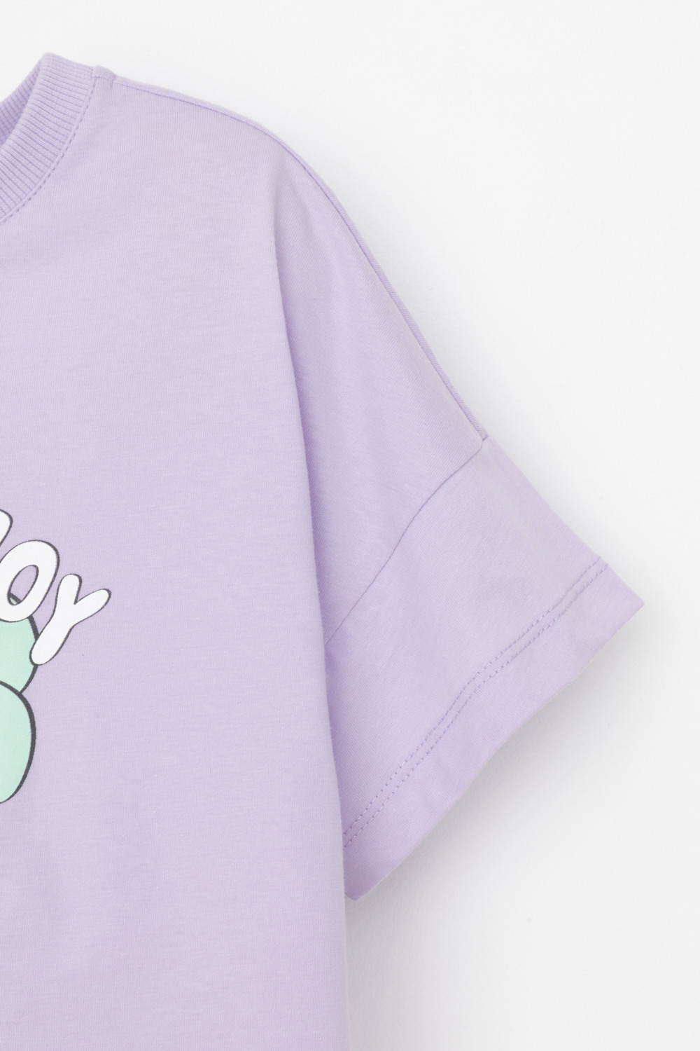 Футболка укороченная для девочки из высококачественного трикотажного полотна. Оригинальный принт выполнен из стойких текстильных гипоаллергенных красителей. Для удобства одевания на спинке в размерах 92 и 98 есть застежка на кнопки.