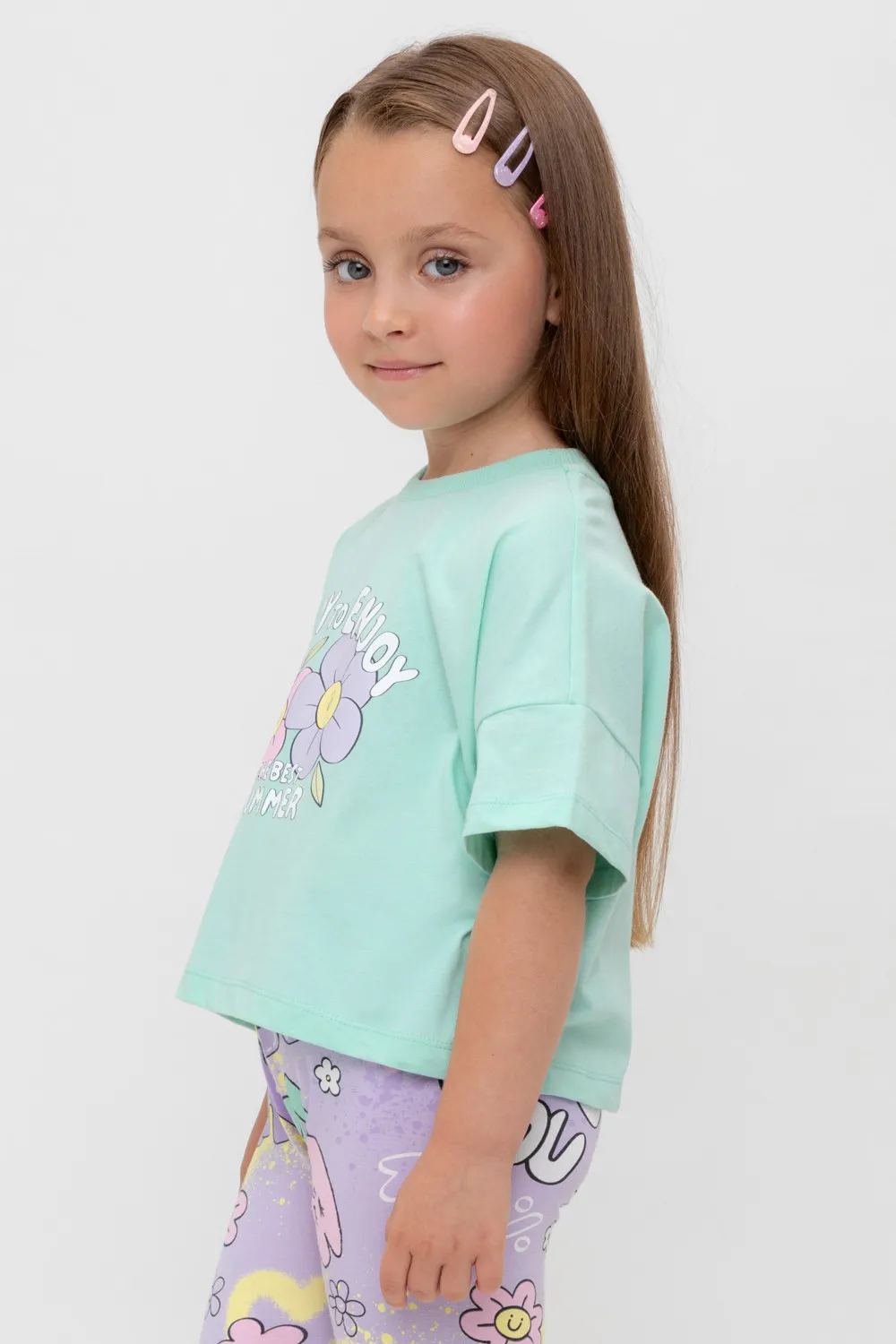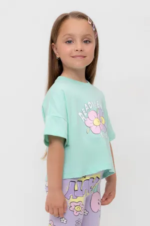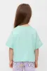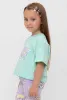 Футболка укороченная для девочки из высококачественного трикотажного полотна. Оригинальный принт выполнен из стойких текстильных гипоаллергенных красителей. Для удобства одевания на спинке в размерах 92 и 98 есть застежка на кнопки.