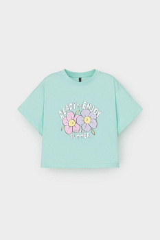 Футболка укороченная для девочки из высококачественного трикотажного полотна. Оригинальный принт выполнен из стойких текстильных гипоаллергенных красителей. Для удобства одевания на спинке в размерах 92 и 98 есть застежка на кнопки.