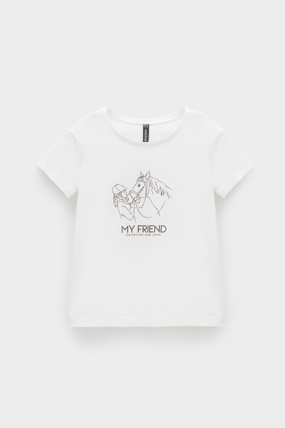 Футболка для девочки из высококачественного трикотажного полотна. Оригинальный принт выполнен из стойких текстильных гипоаллергенных красителей. Для удобства предусмотрена застежка на 2 кнопки в размерах 92 и 98.