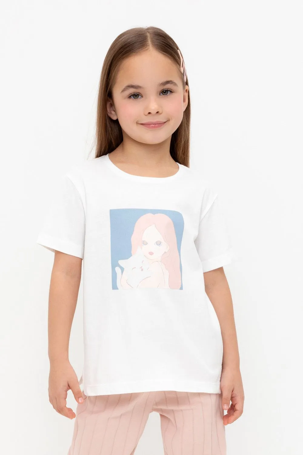 Футболка для девочки из высококачественного трикотажного полотна. Для удобства одевания имеется застежка на кнопки в размерах 92 и 98. Оригинальный принт выполнен из стойких текстильных гипоаллергенных красителей.