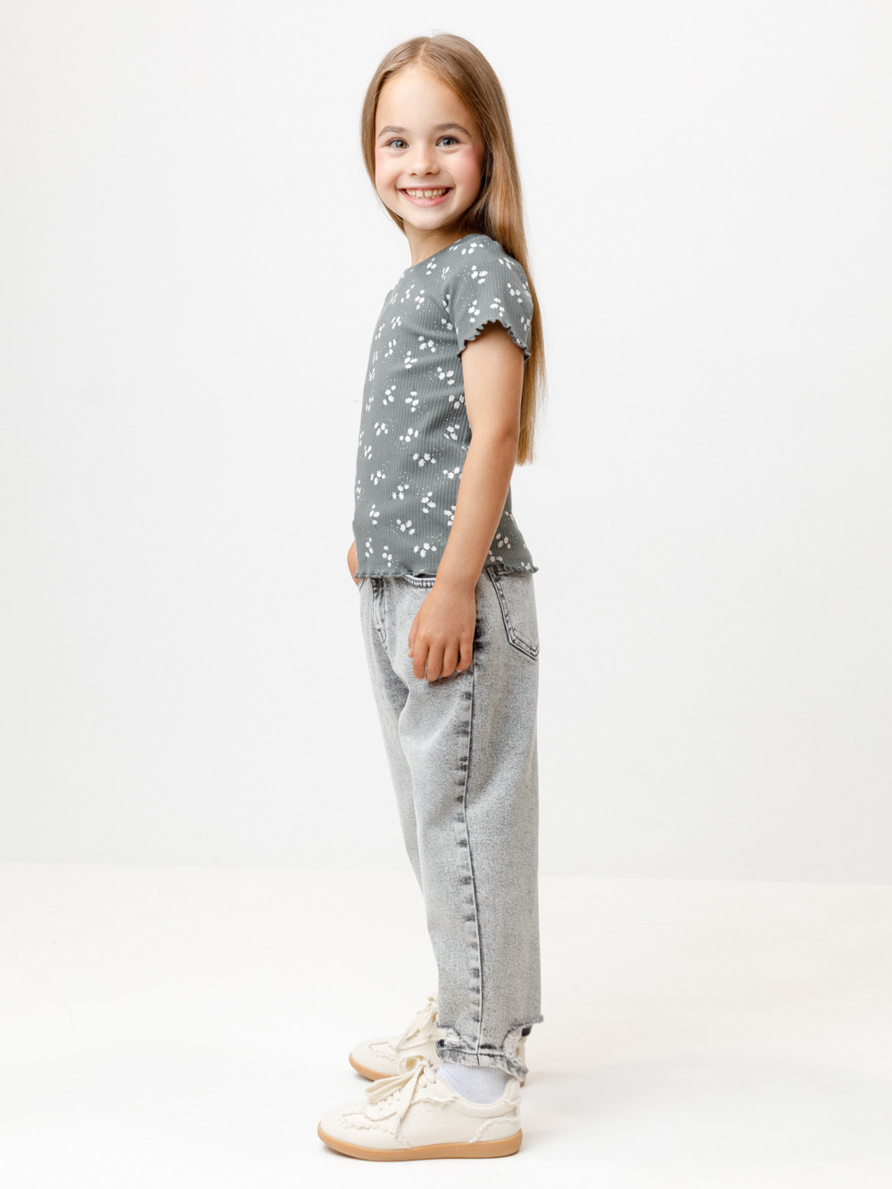 Футболка для девочки из эластичного трикотажа в рубчик. Оригинальный рисунок выполнен из стойких текстильных гипоаллергенных красителей. Изделие сохраняет цвет и форму после многократных стирок. Все трикотажные полотна производятся в соответствии с нормами швейцарского сертификата ЭкоТекс.