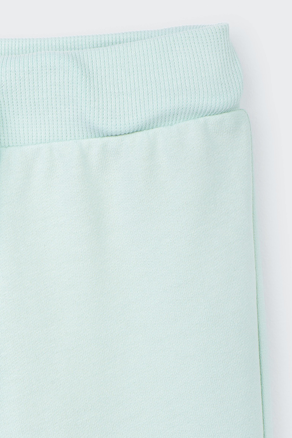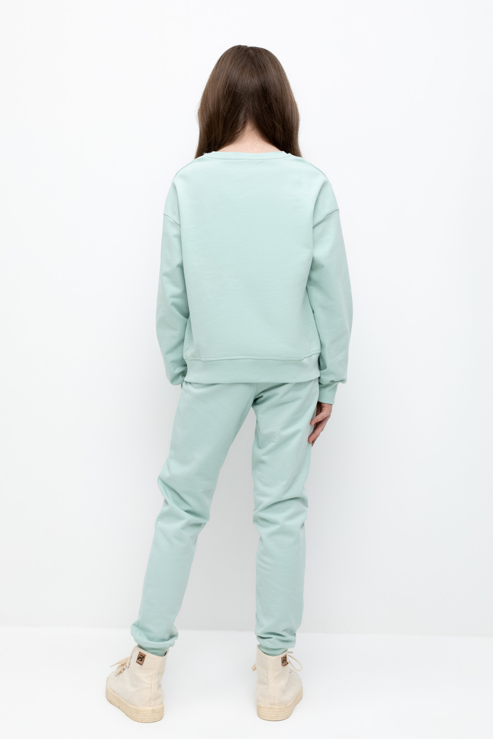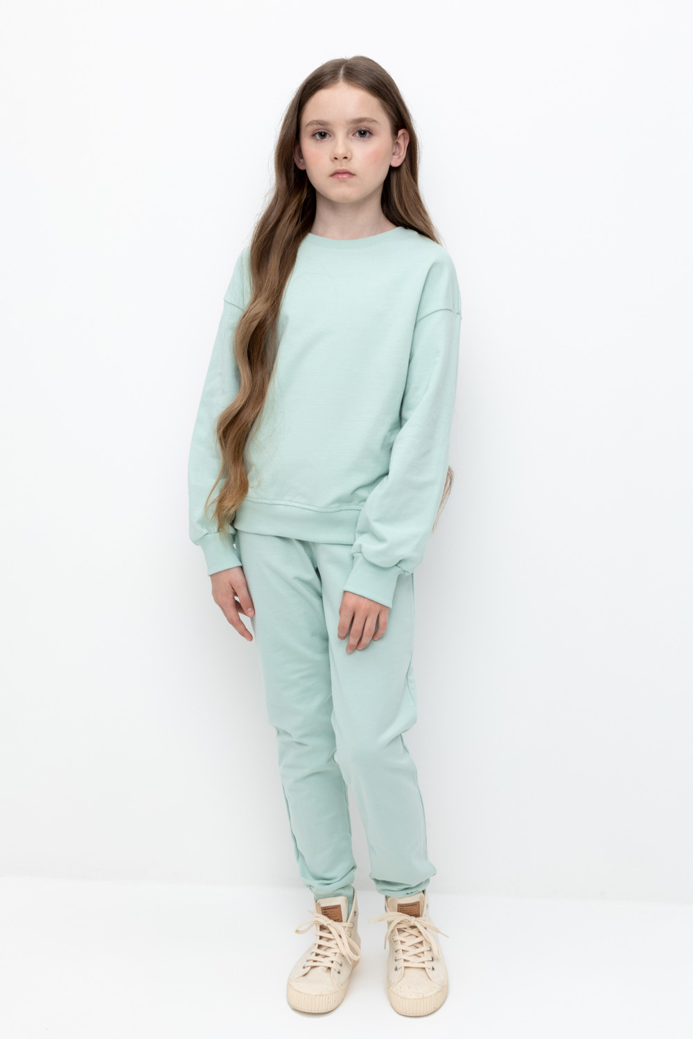 Трикотажные брюки для девочки из петельчатого футера. Эластичный пояс на резинке регулируется по ширине с помощью шнурка, внизу эластичные манжеты.