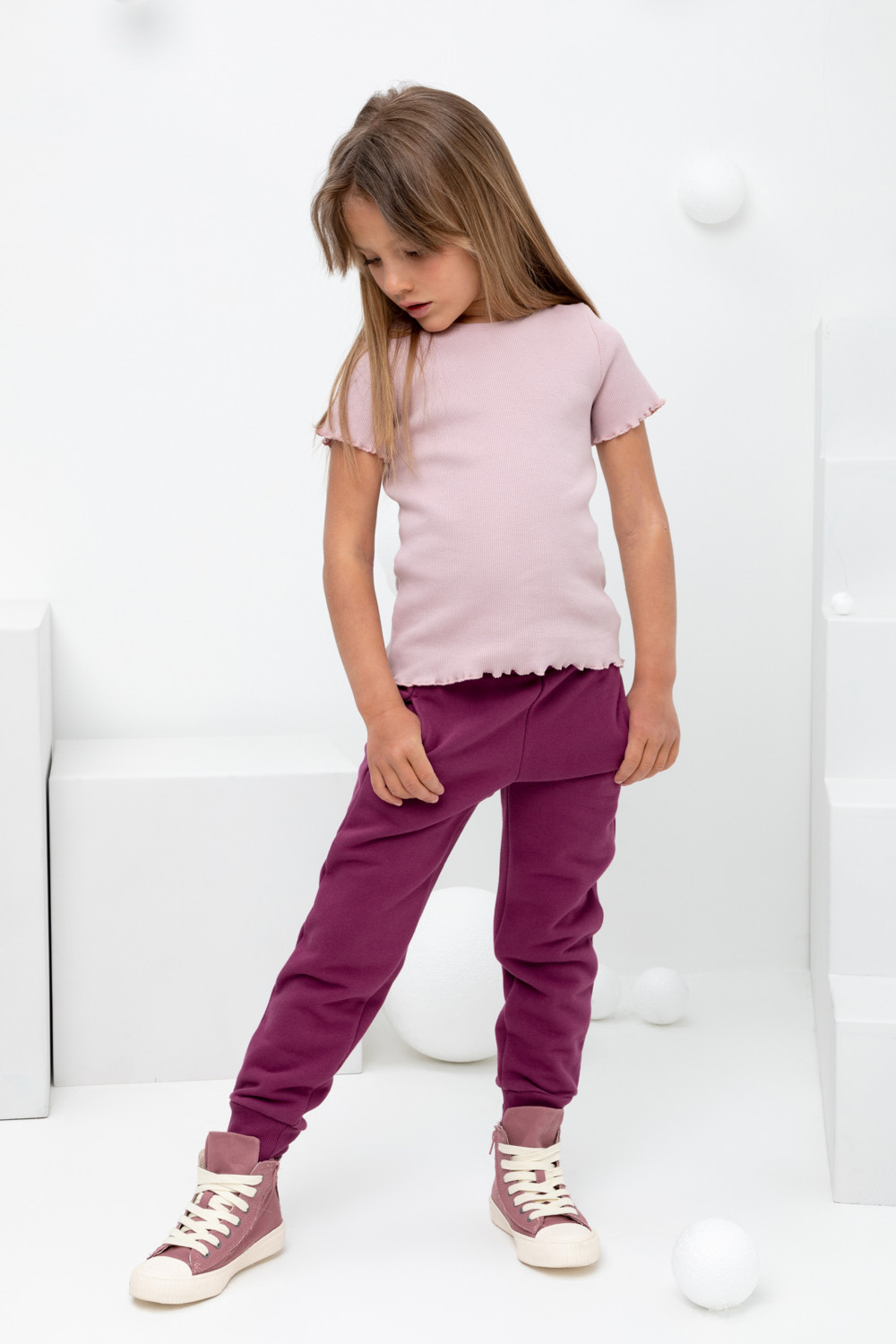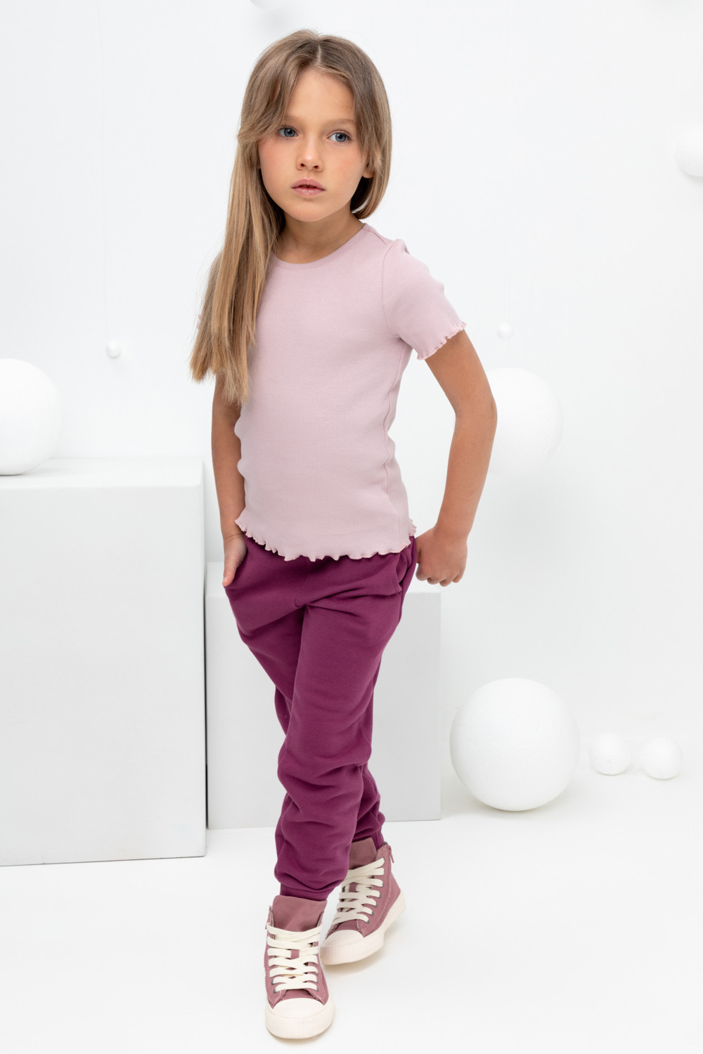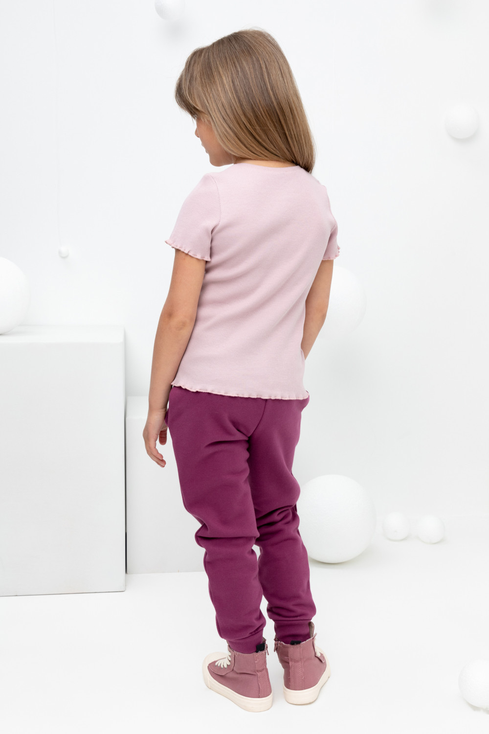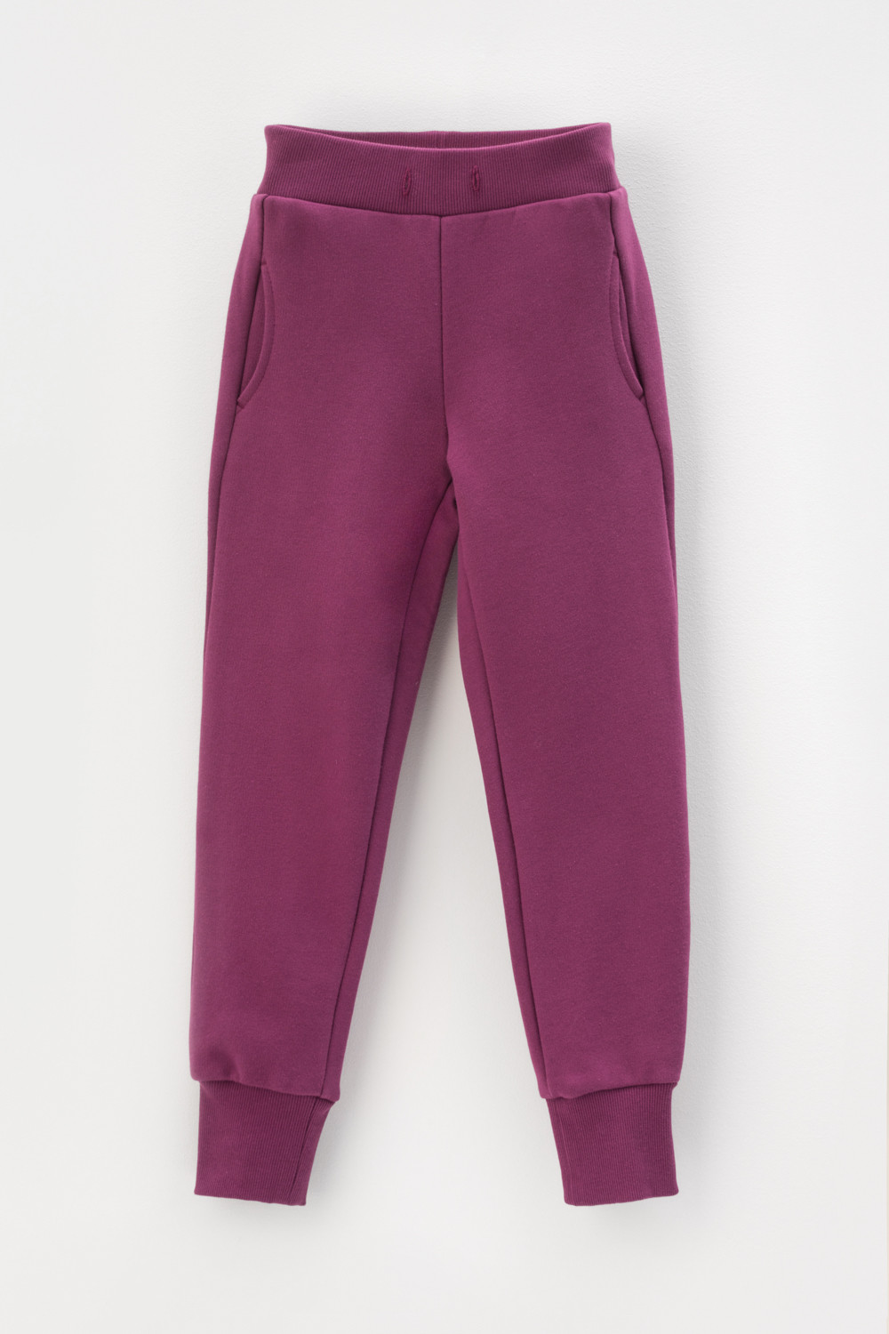 Трикотажные брюки для девочки из футера с начесом. В составе 80% натурального хлопка и 20% полиэстера, при этом полиэстер ввязан внутрь по особой технологии и не соприкасается с кожей. Эластичный пояс на резинке регулируется по ширине с помощью шнурка, по бокам два удобных кармана, внизу эластичные манжеты.