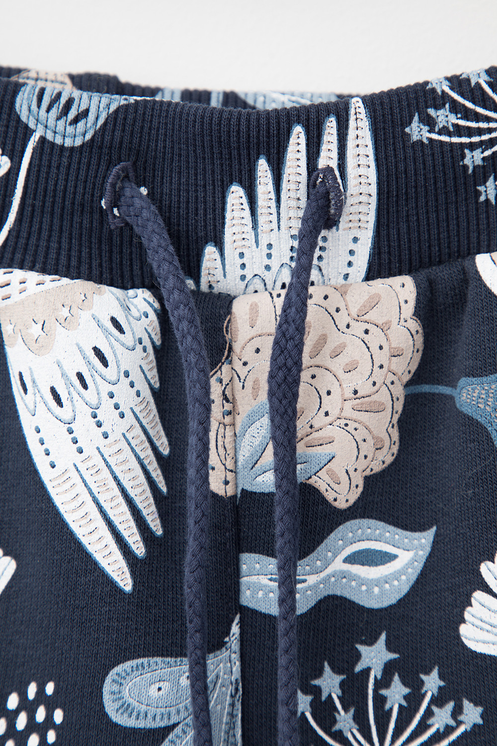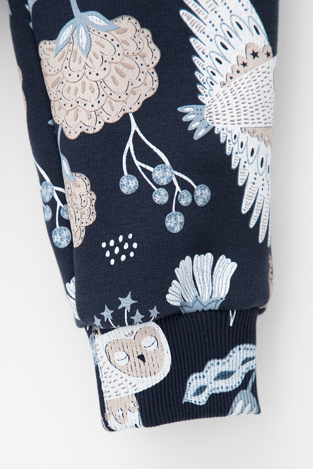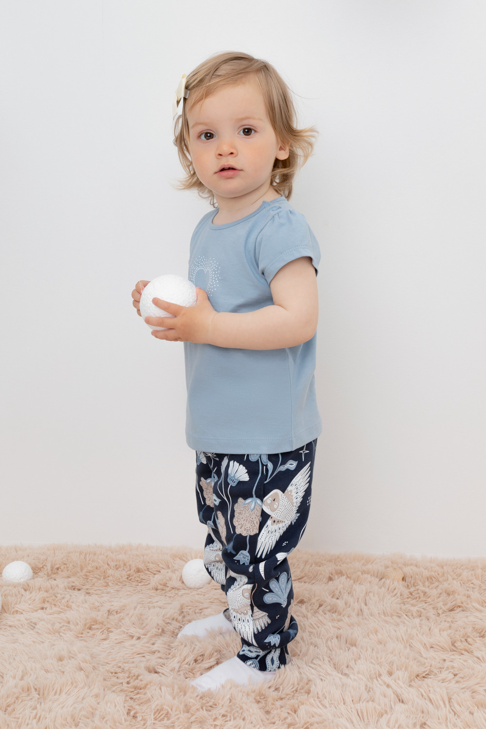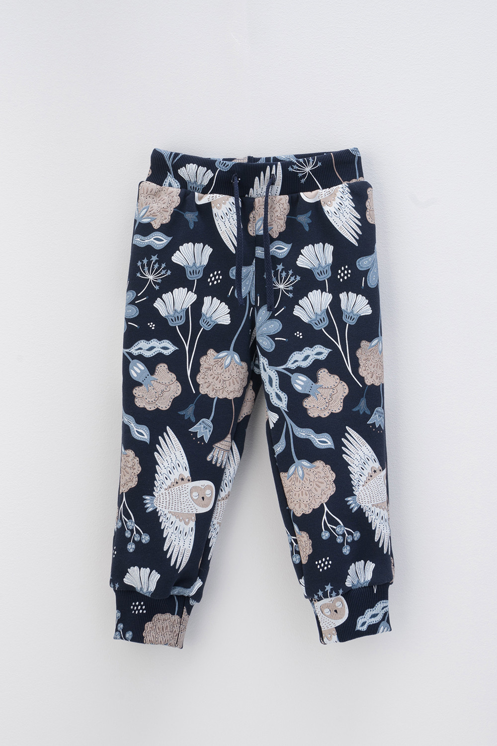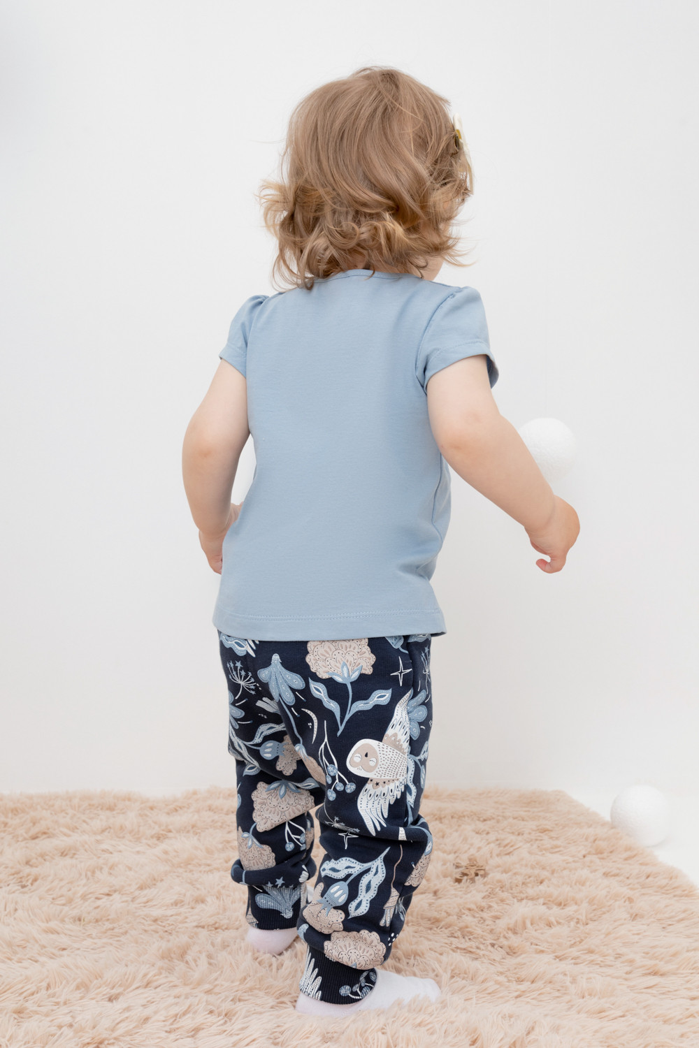 Трикотажные брюки для девочки из петельчатого футера. В составе 80% натурального хлопка и 20% полиэстера, при этом полиэстер ввязан внутрь по особой технологии и не соприкасается с кожей. Эластичный пояс на резинке регулируется по ширине с помощью шнурка, внизу эластичные манжеты. Оригинальная набивка выполнена из стойких текстильных красителей.