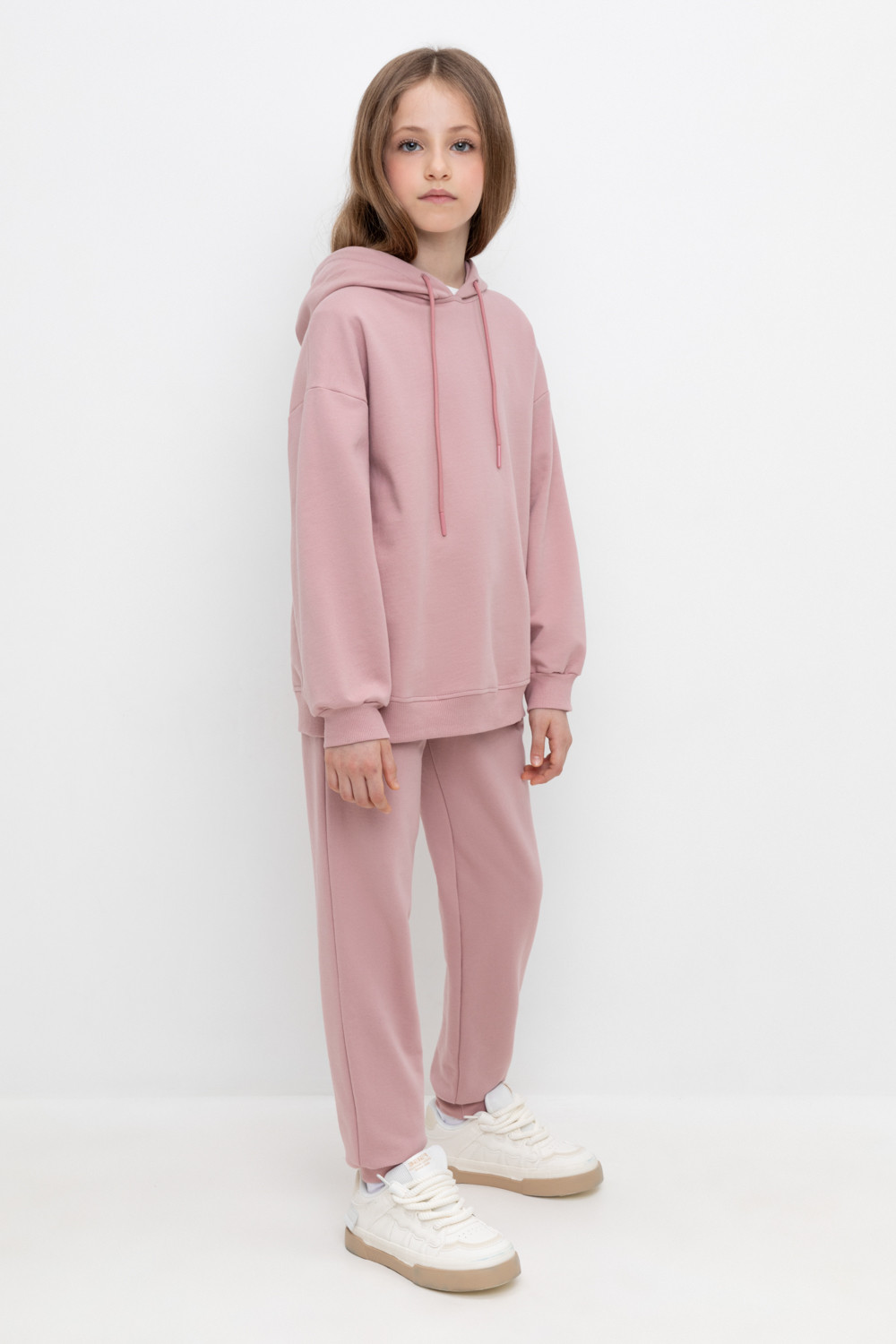 Трикотажные брюки для девочки из футера трехнитки с начесом. Эластичный пояс на резинке регулируется по ширине с помощью шнурка, внизу манжеты из эластичного кашкорсе.