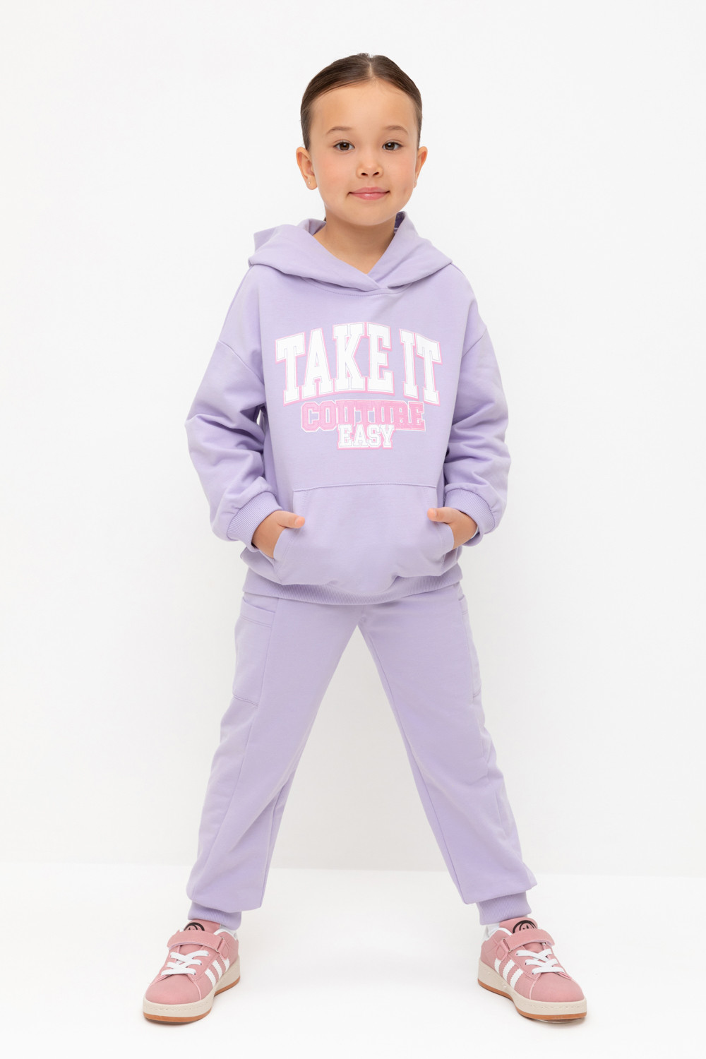 Брюки для девочки из мягкого петельчатого трикотажа. Эластичный пояс на резинке регулируется по ширине с помощью шнурка, по бокам два удобных кармана, внизу эластичные манжеты.