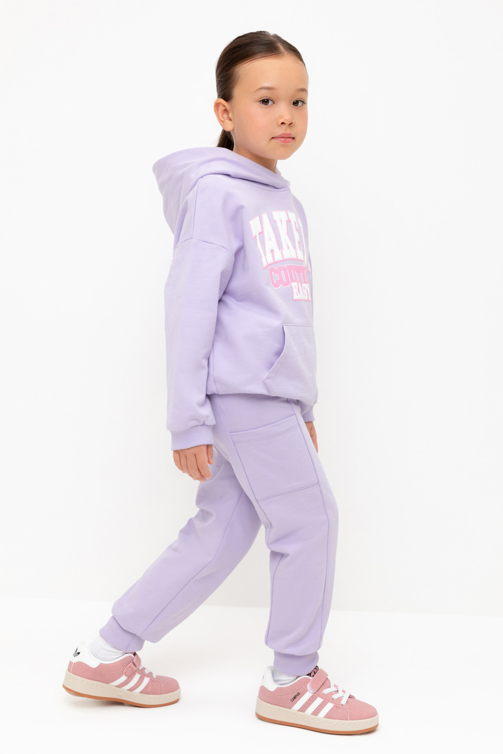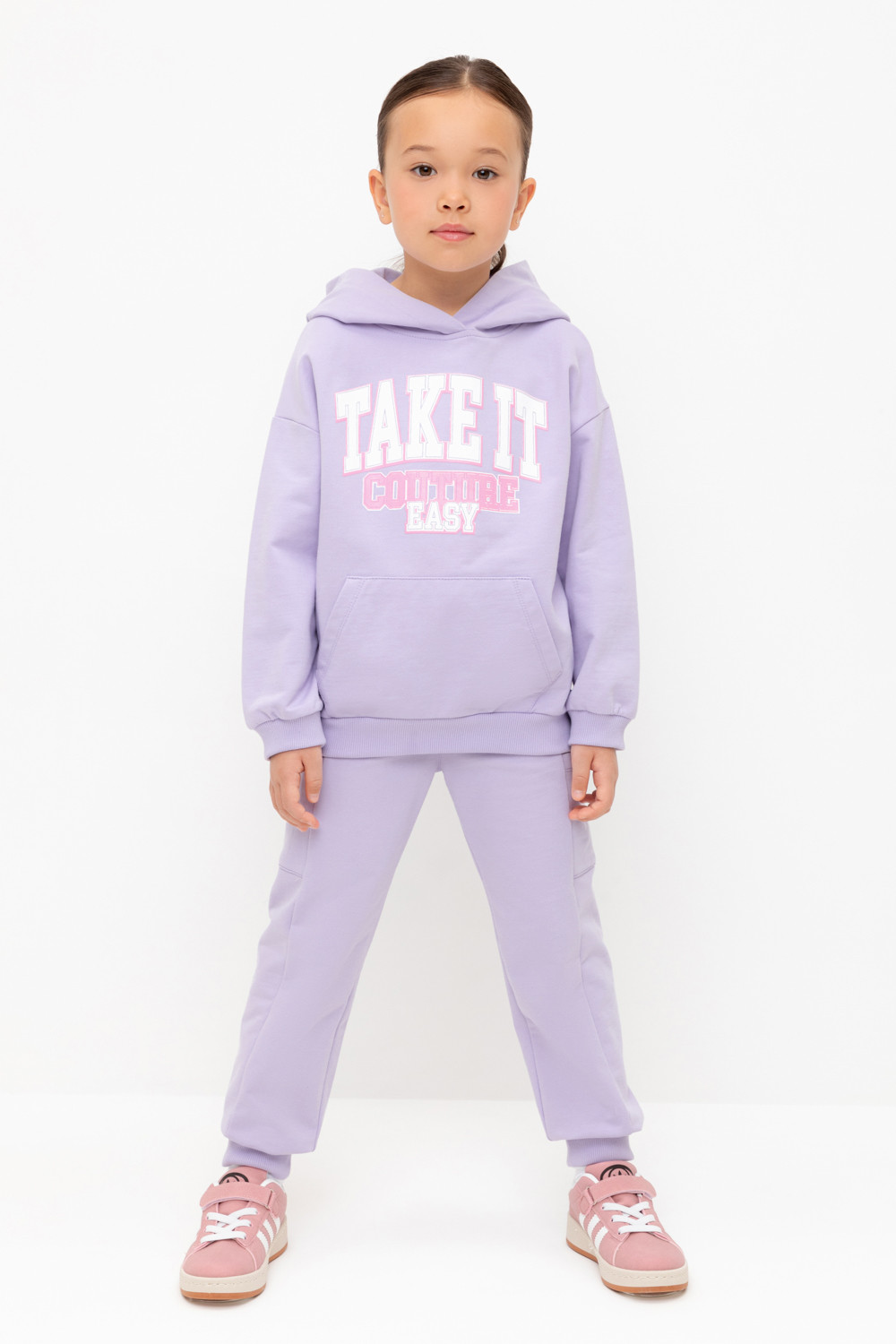 Брюки для девочки из мягкого петельчатого трикотажа. Эластичный пояс на резинке регулируется по ширине с помощью шнурка, по бокам два удобных кармана, внизу эластичные манжеты.