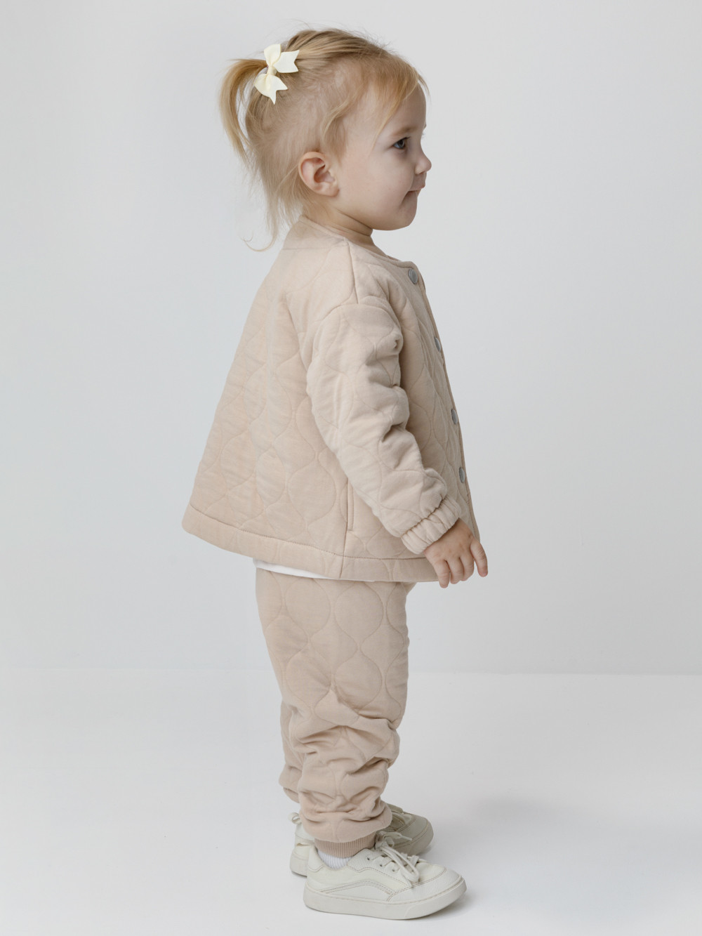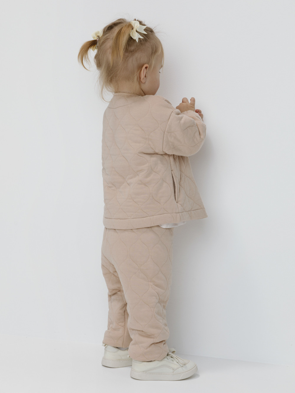 Тёплые брюки для девочки из мягкого капитония. Капитоний — это стёганое трикотажное полотно с утеплителем из полиэстеровой нити. Эластичный пояс на резинке регулируется по ширине с помощью шнурка, внизу манжеты на резинке. Изделие сохраняет цвет и форму после многократных стирок. Все трикотажные полотна производятся в соответствии с нормами швейцарского сертификата ЭкоТекс.