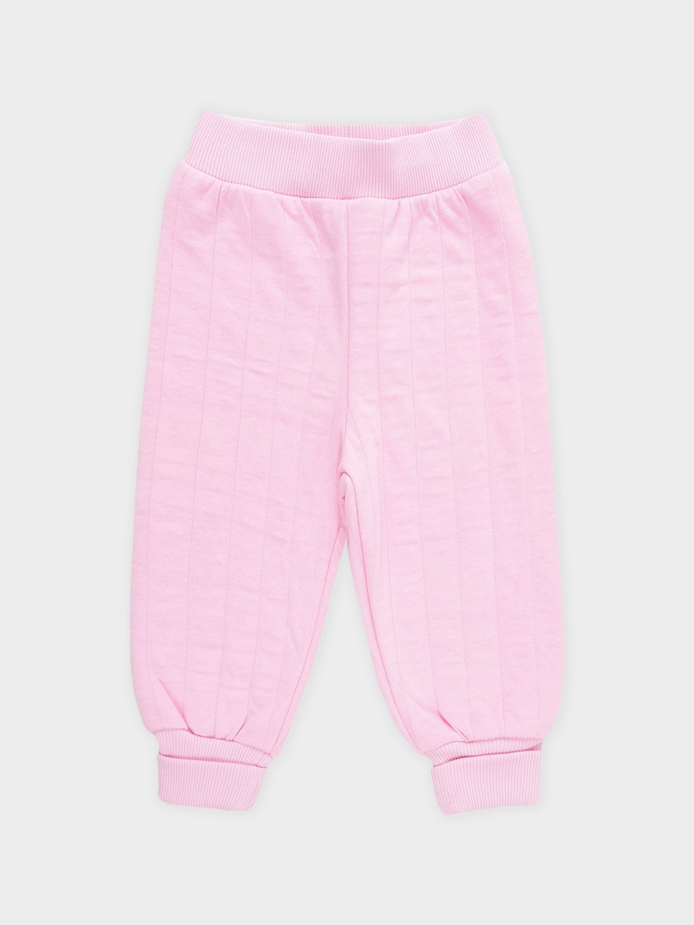 Тёплые брюки из капитония для девочки. Капитоний — это стёганое трикотажное полотно с утеплителем из полиэстеровой нити. У изделия мягкий пояс и эластичные манжеты. Все трикотажные полотна производятся в соответствии с нормами швейцарского сертификата ЭкоТекс.