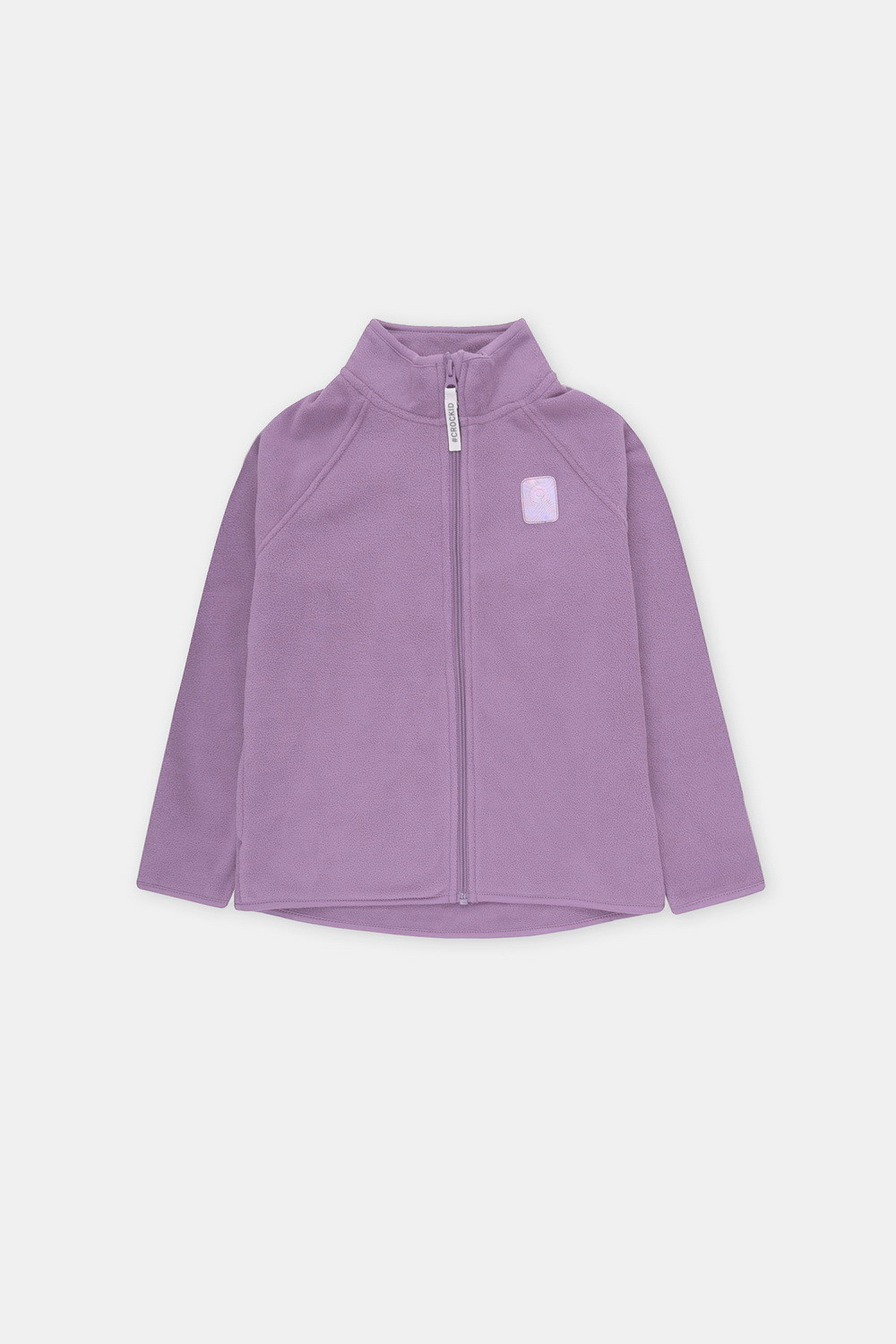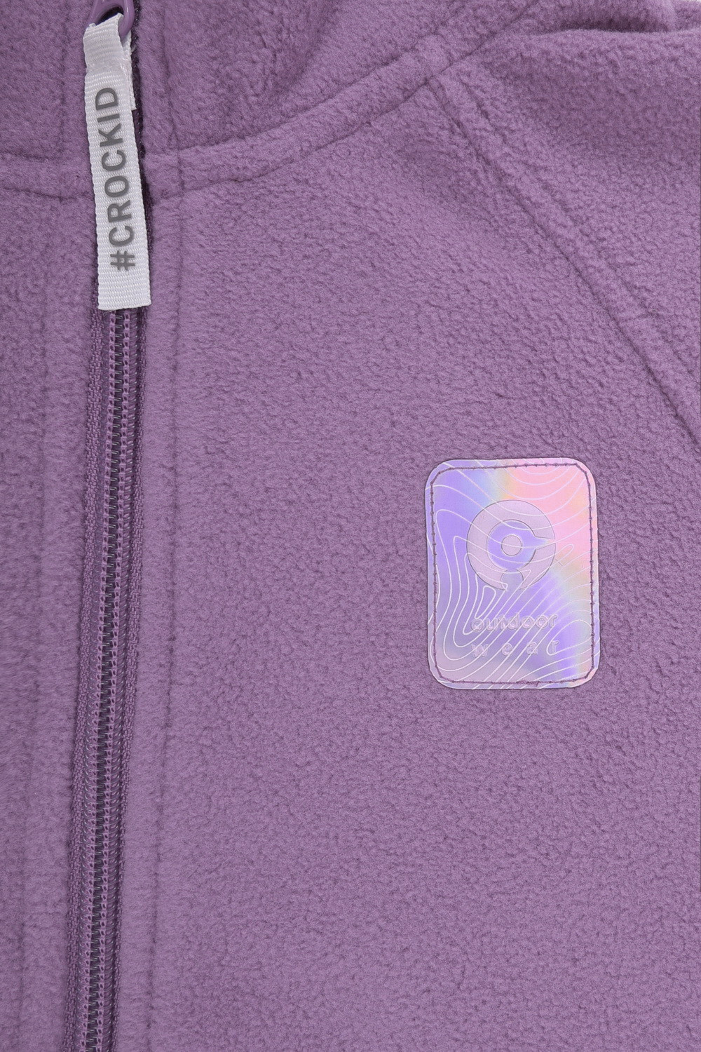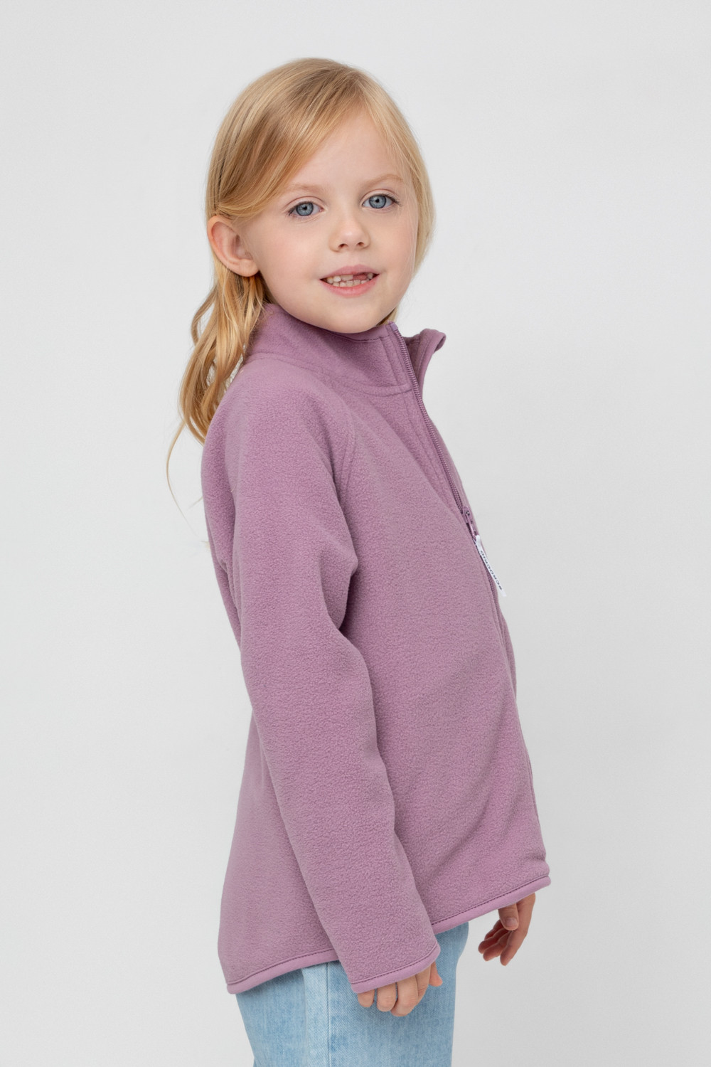 Флисовая куртка для девочки. У изделия удлинённая спинка, высокий воротник, предусмотрена защита шеи и подбородка. Рукава-реглан и низ изделия обработаны эластичным кантом для лучшего прилегания к телу, по бокам два кармана. Куртка сохраняет цвет и форму после многократных стирок.