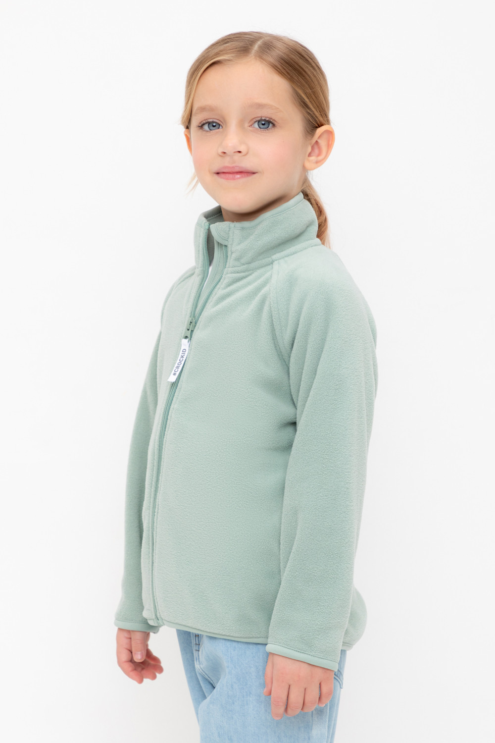 Флисовая куртка для девочки. У изделия удлинённая спинка, высокий воротник, предусмотрена защита шеи и подбородка. Рукава-реглан и низ изделия обработаны эластичным кантом для лучшего прилегания к телу, по бокам два кармана. Куртка сохраняет цвет и форму после многократных стирок.